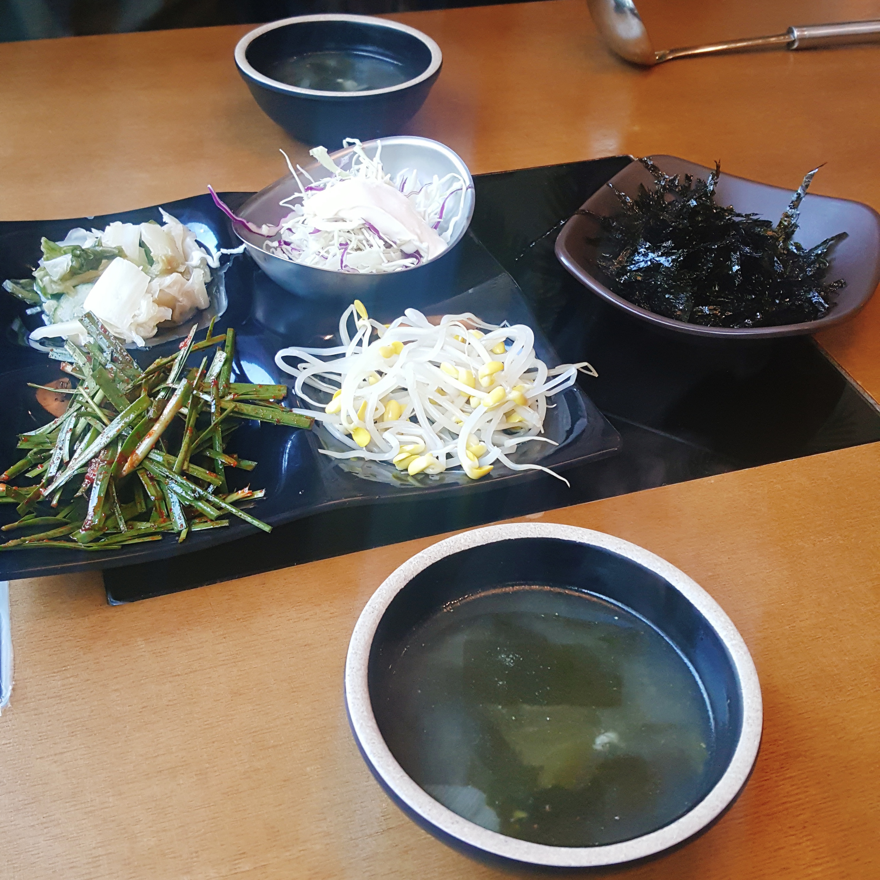 일단 기본 찬으로 샐러드, 부추무침, 콩나물, 백김치, 미역국, 김가루를 주시는데 콩나물은 양념이 되어있지 않아서.. 이걸 어떻게 먹으란거지? 라는 생각이 들었는데 이후에 밥그릇이 나오고 깊은 뜻을 깨달았습니다.
