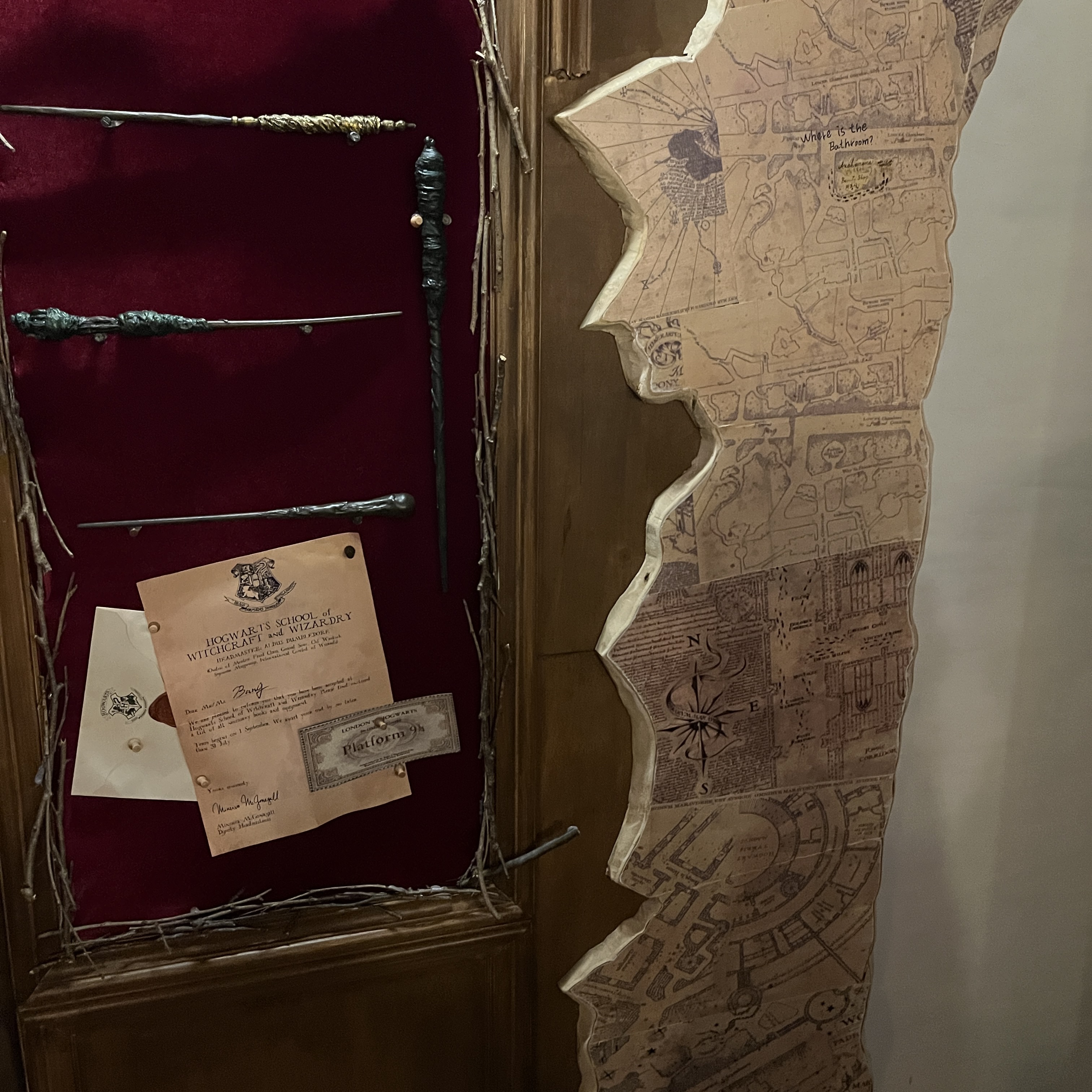 벽면 한쪽에 저렇게 마법지팡이가 전시되어 있어요.