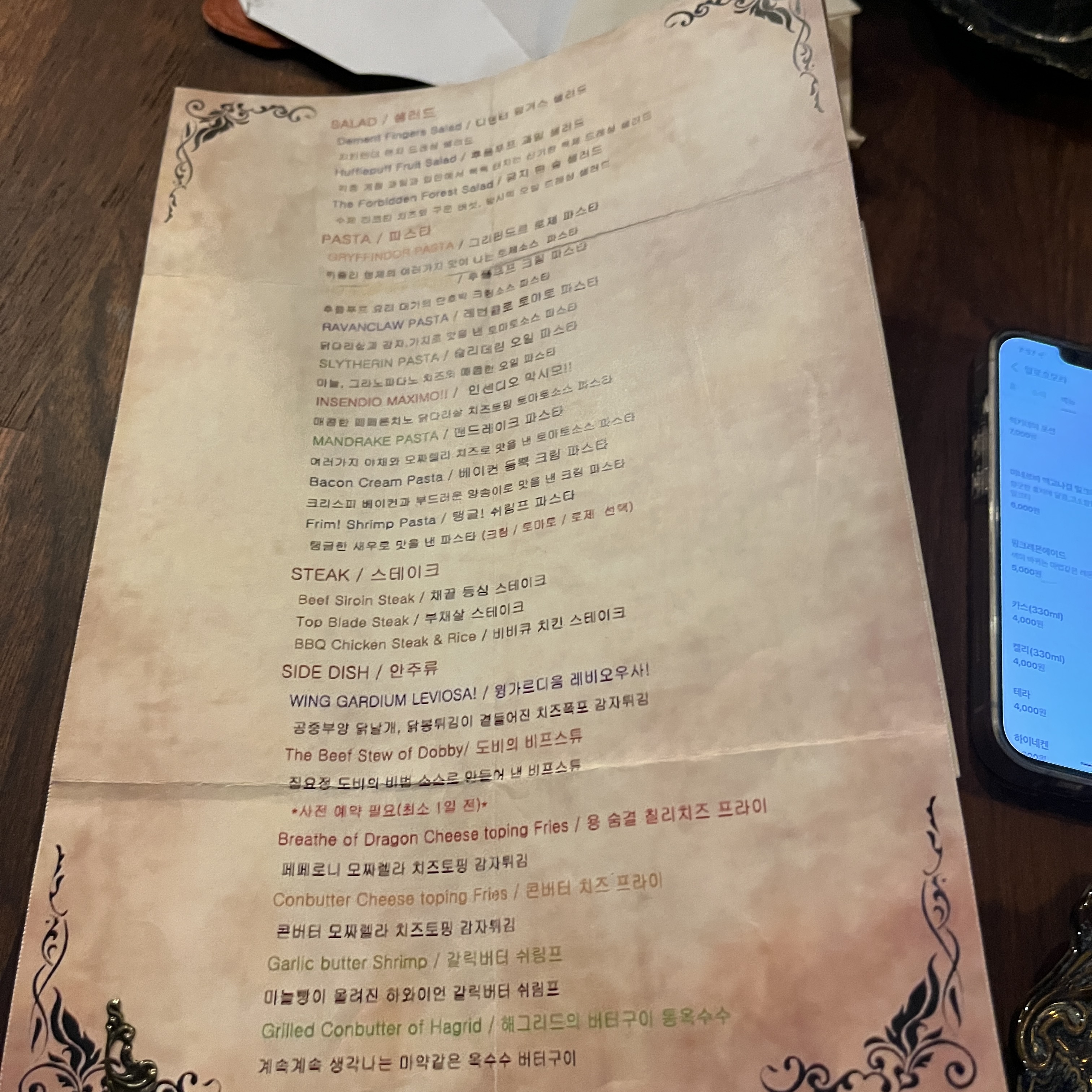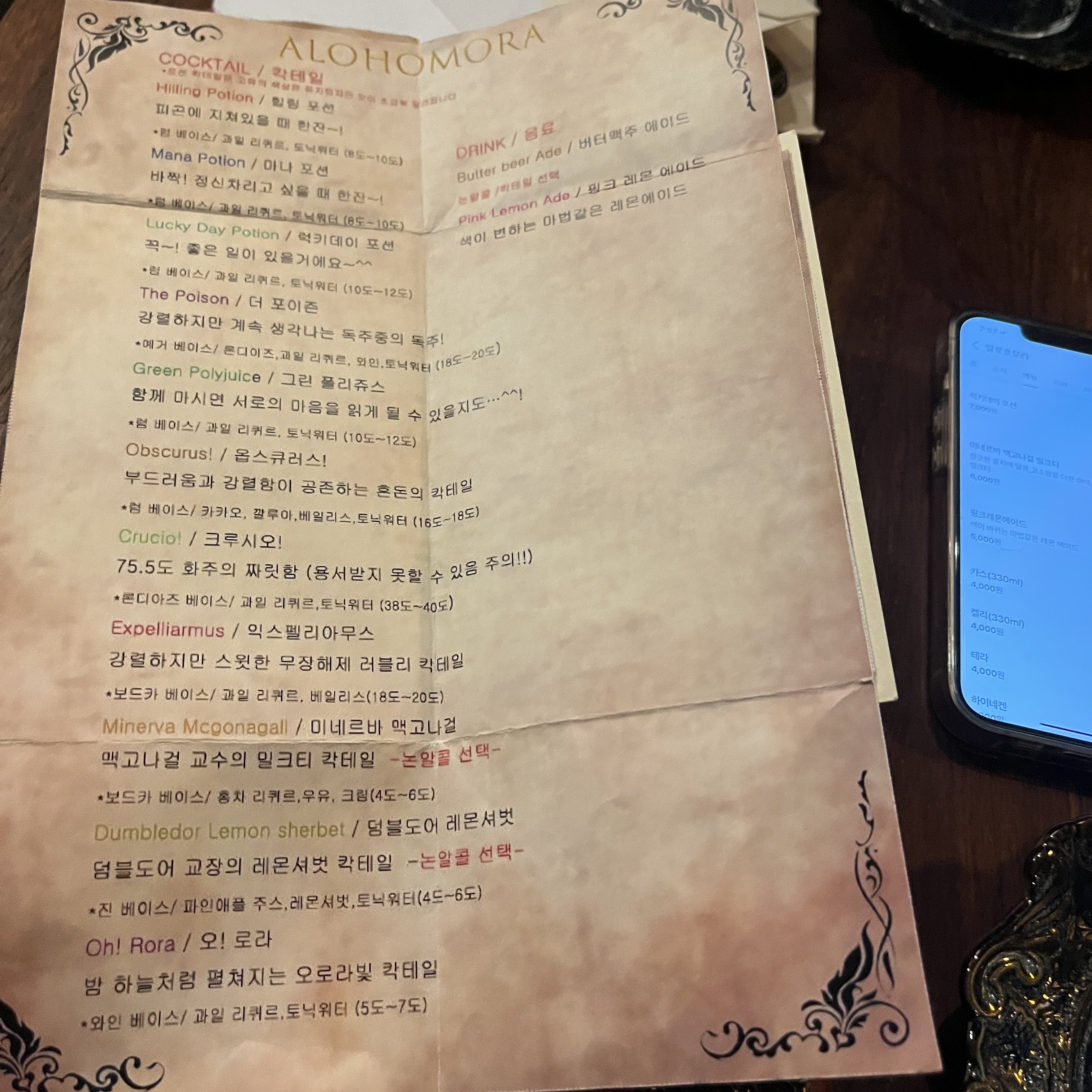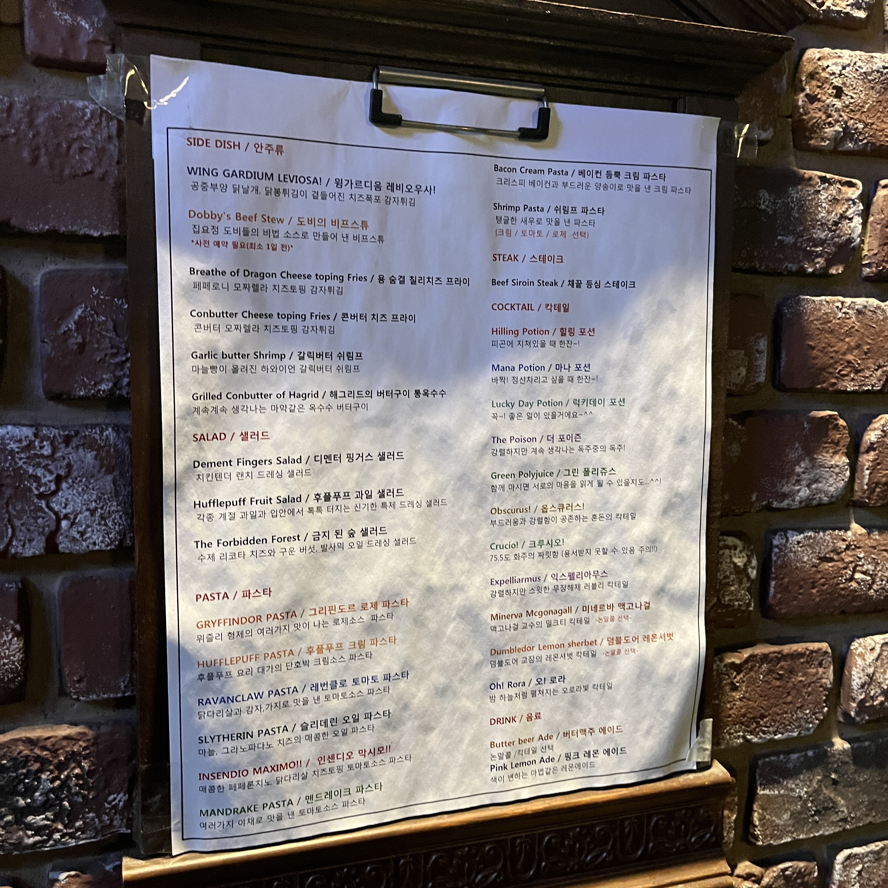컨셉에 맞게 요리류들도 해리포터에 나오는 이름으로.. 술도 마법의 이름이었어요.