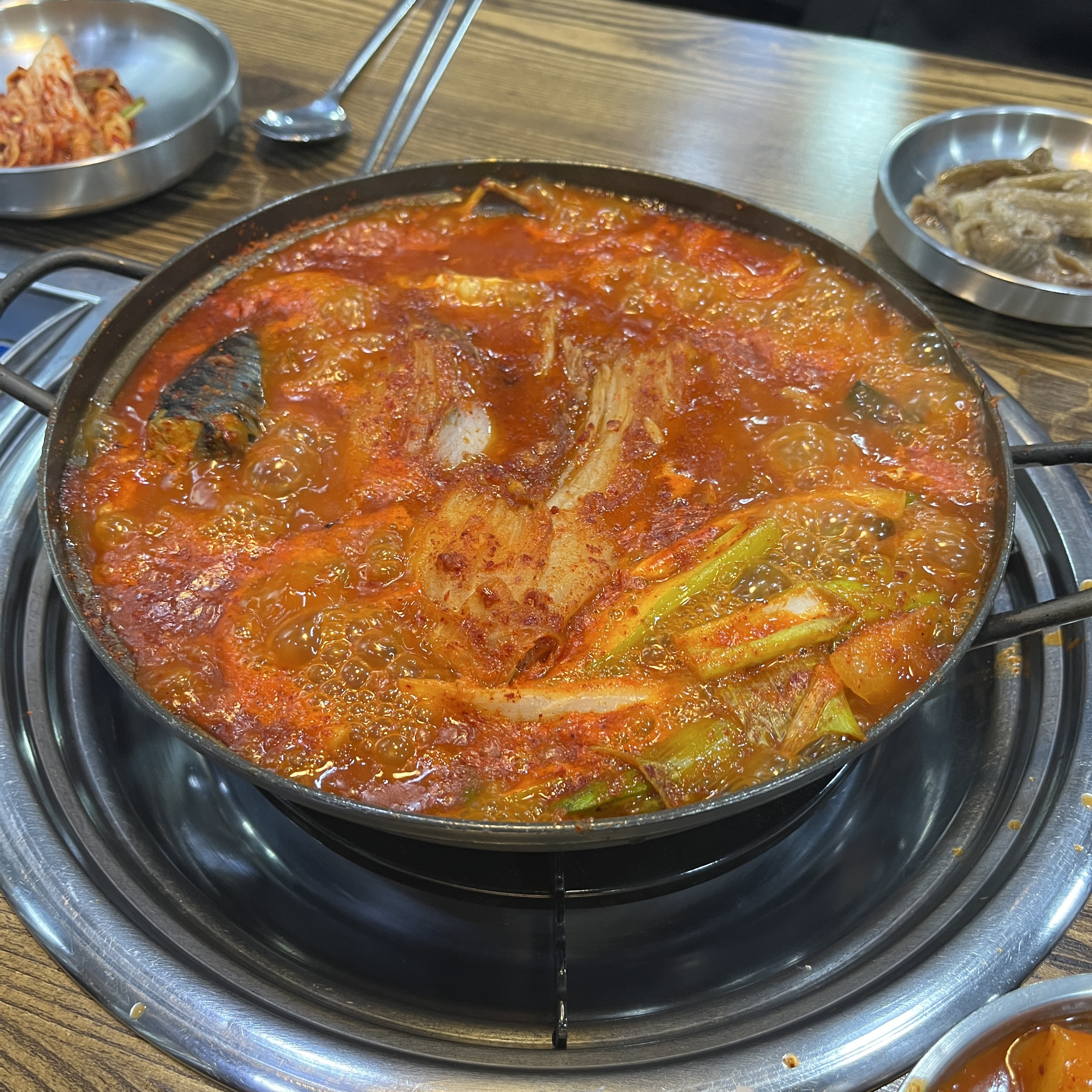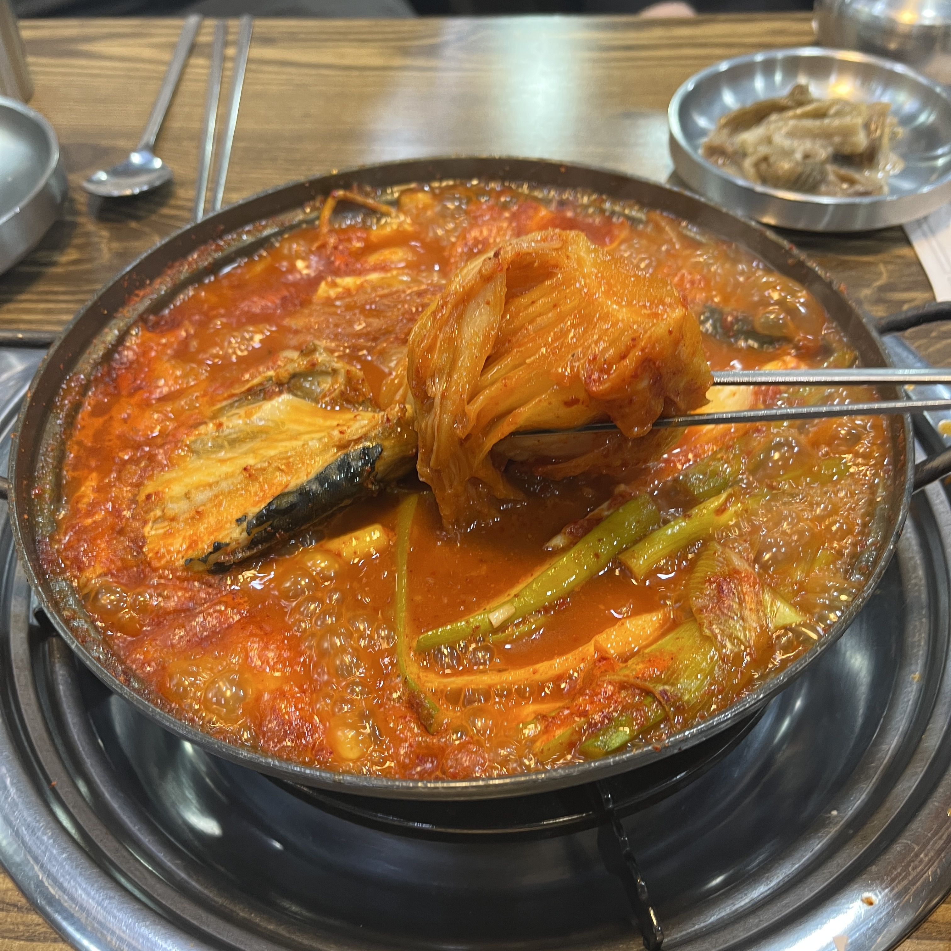 팔팔 끓이면서 묵은지도 좀 더 익혀주고, 고등어와 채즙의 맛난 맛이 국물에 계속 베어들 수 있도록 해줍니다.