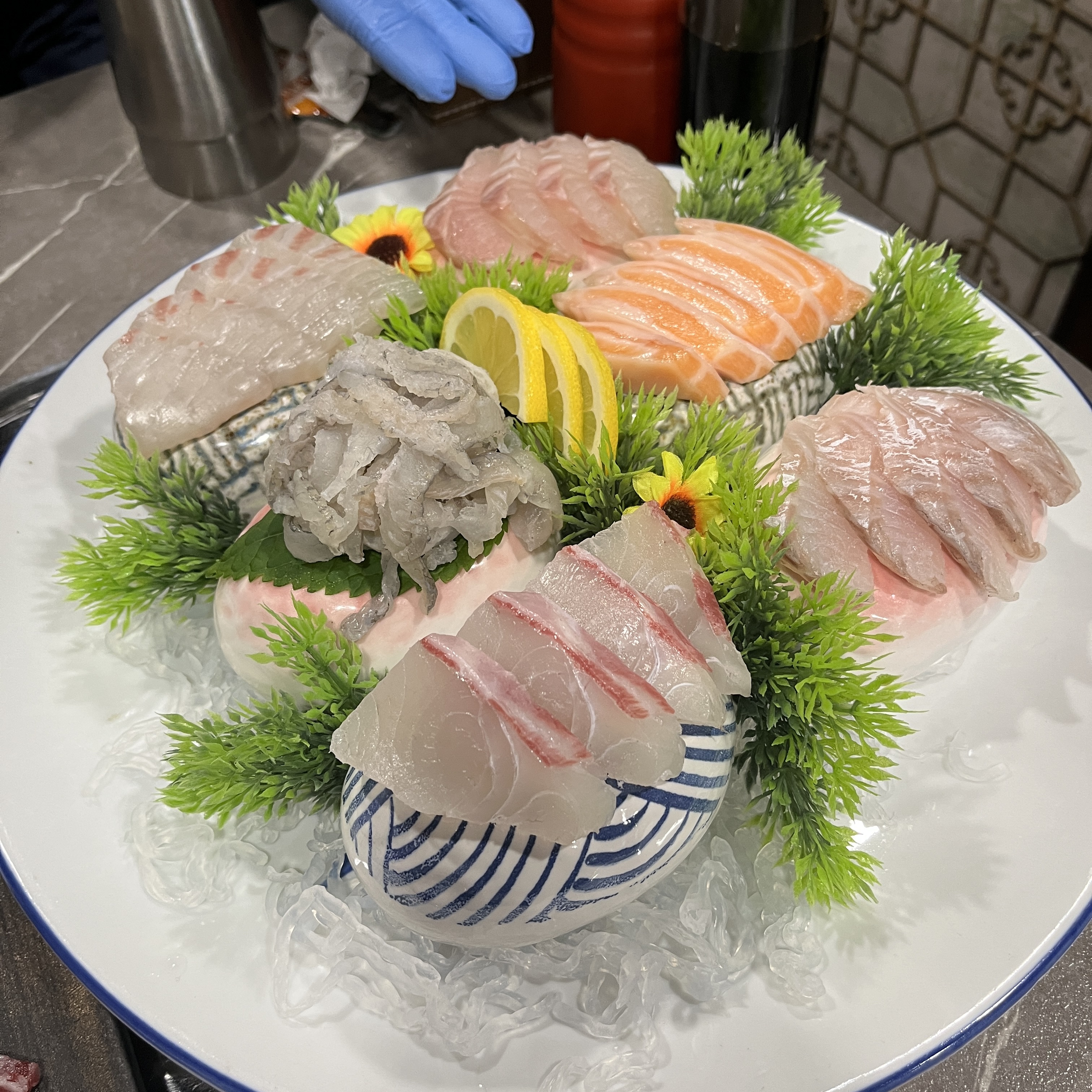 메인인 회가 나왔습니다. 자연산참돔, 자연산도다리, 자연산민어, 자연산광어, 자연산농어 그리고 연어까지!