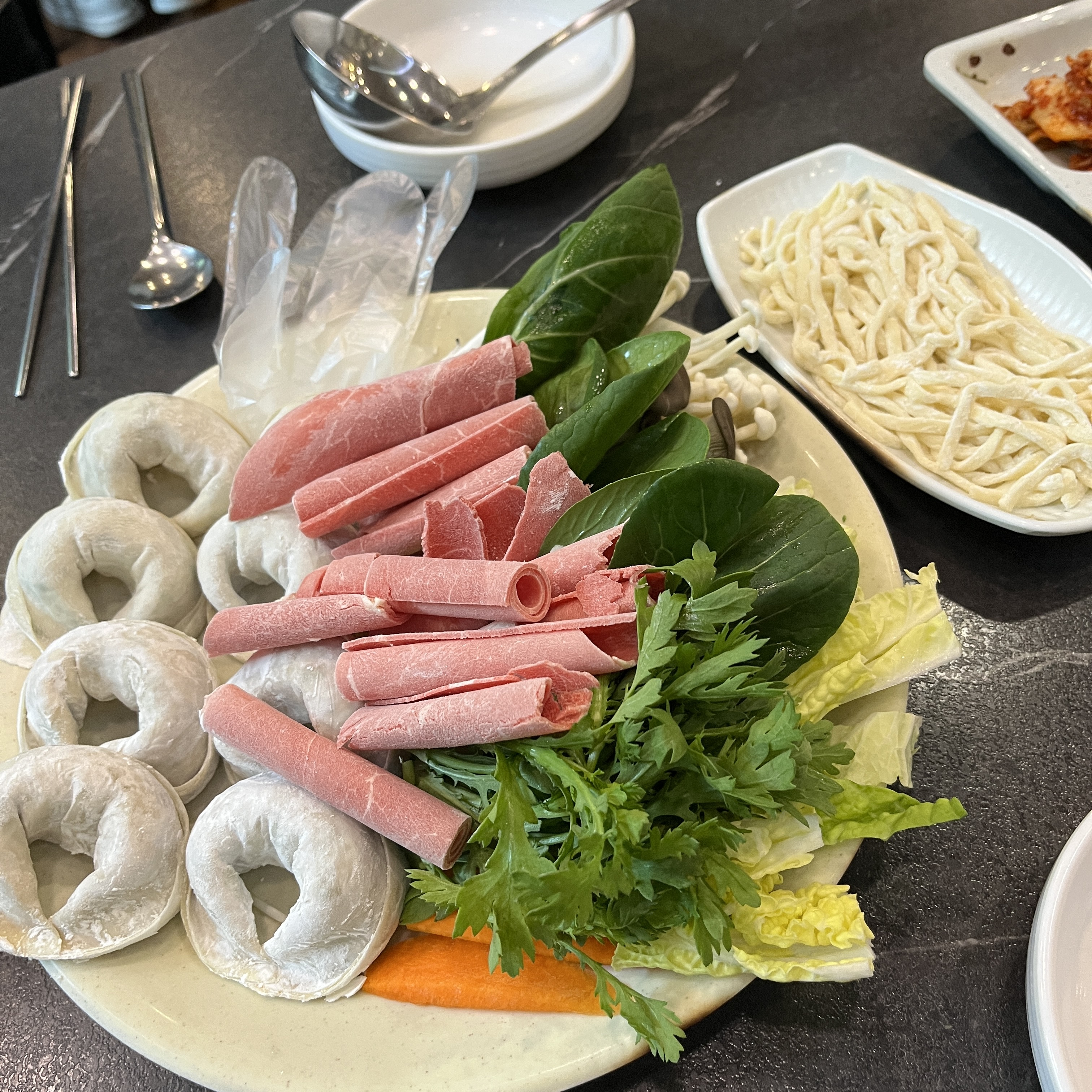 김치만두4개, 고기만두4개가 있고요, 쑥갓, 청경채, 배추 등 야채들과 소고기 조금이 제공됩니다.