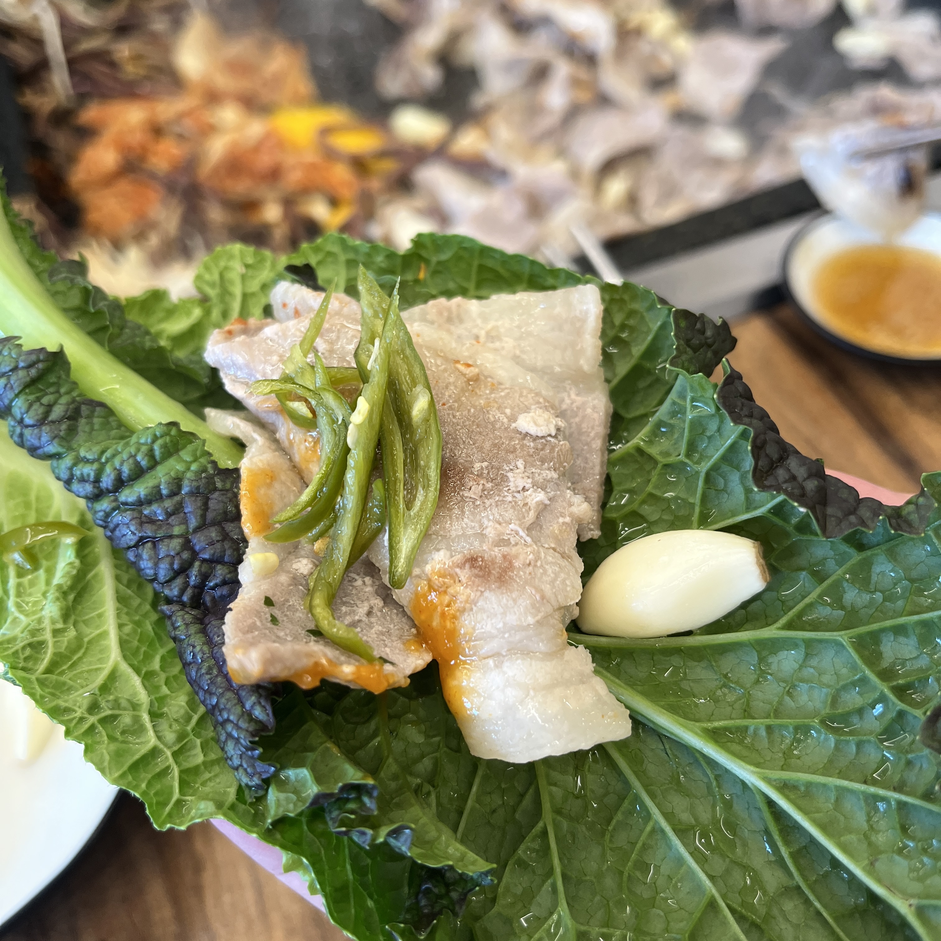 고기는 요래 야채에 쌈장 살짝 찍은 마늘 얹어 먹으면.. 크으 끝이죠!