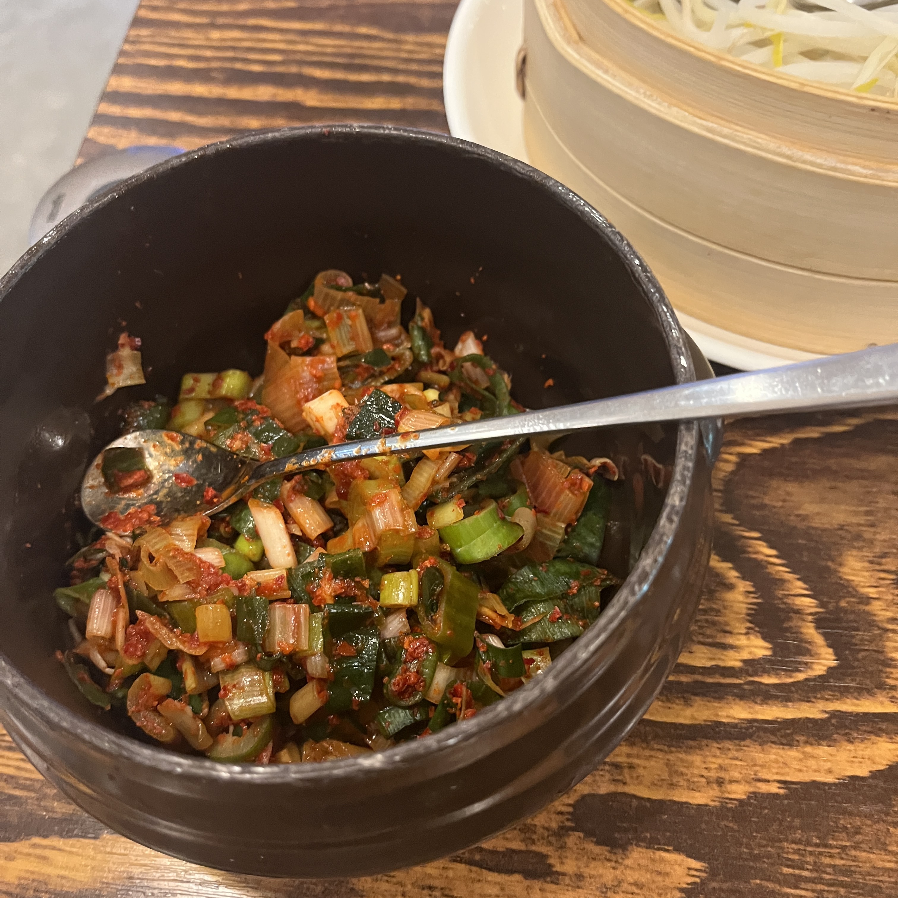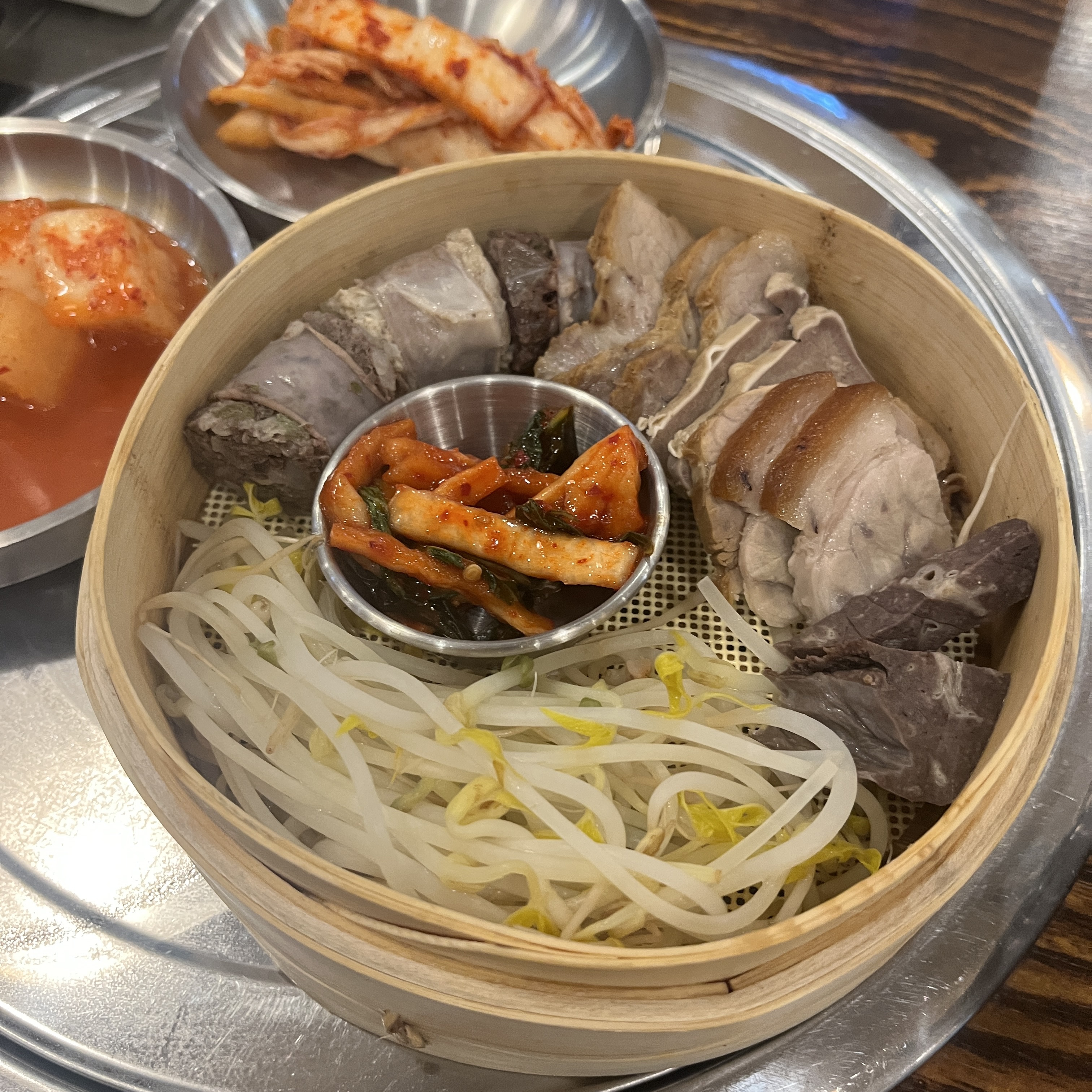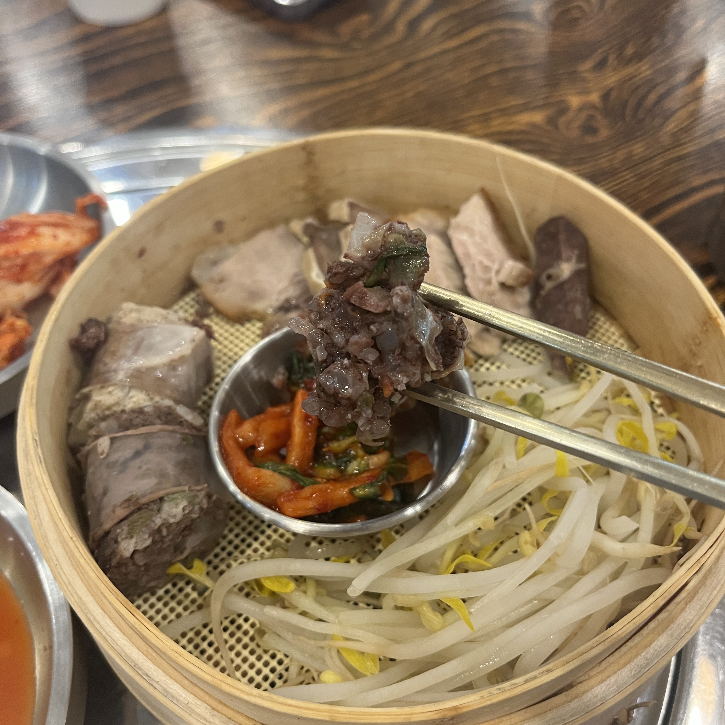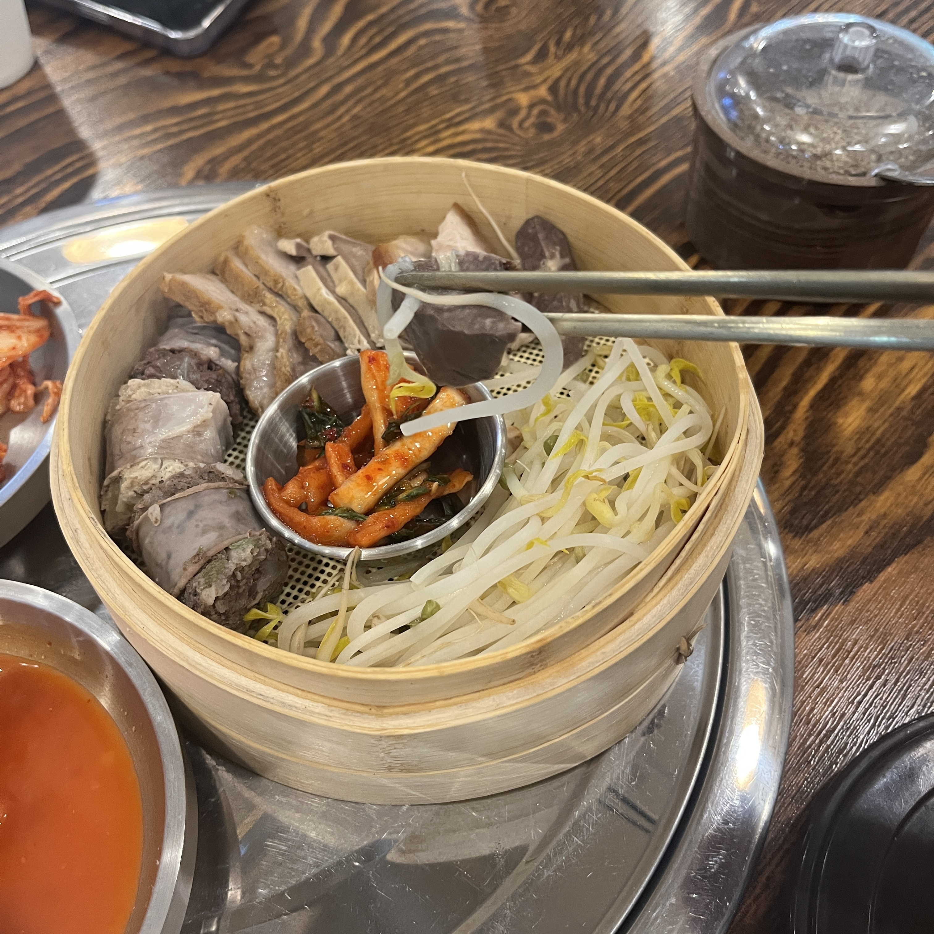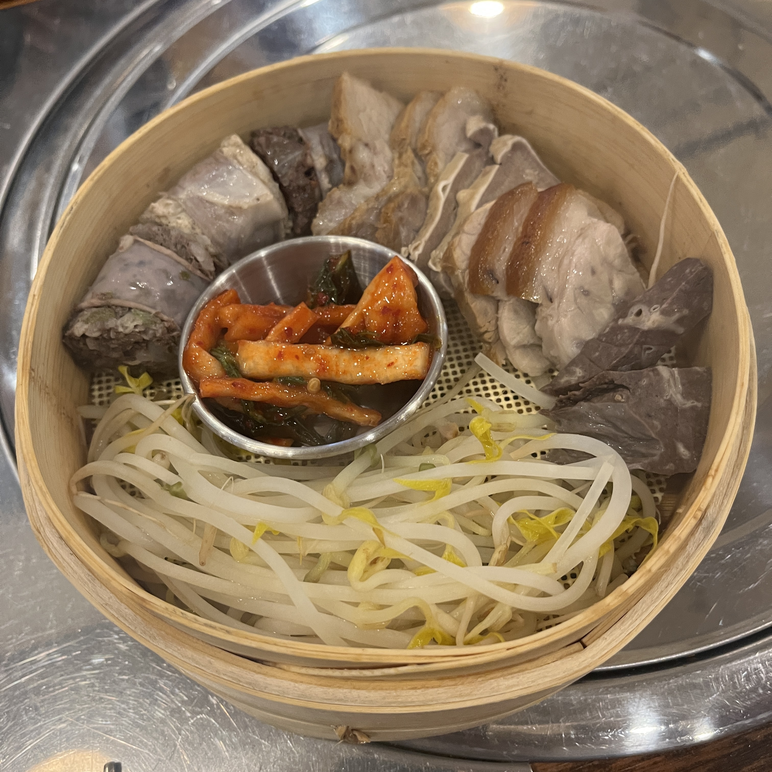 수육, 허파, 다양한 종류의 순대, 숙주와 무말랭이김치까지 편백통?에 제공됩니다.