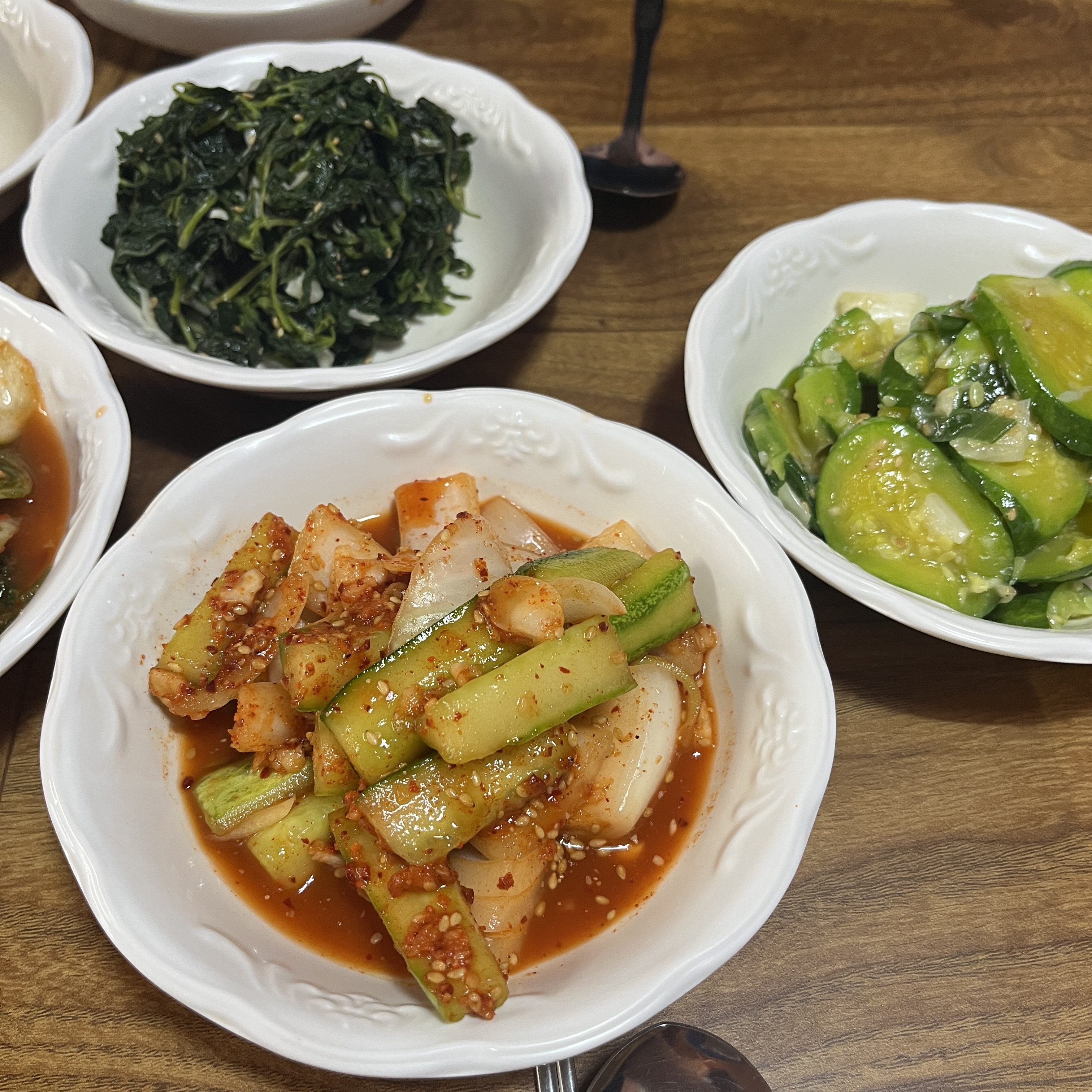 다음은 오이무침, 애호박볶음, 그리고 꺳잎나물입니다.