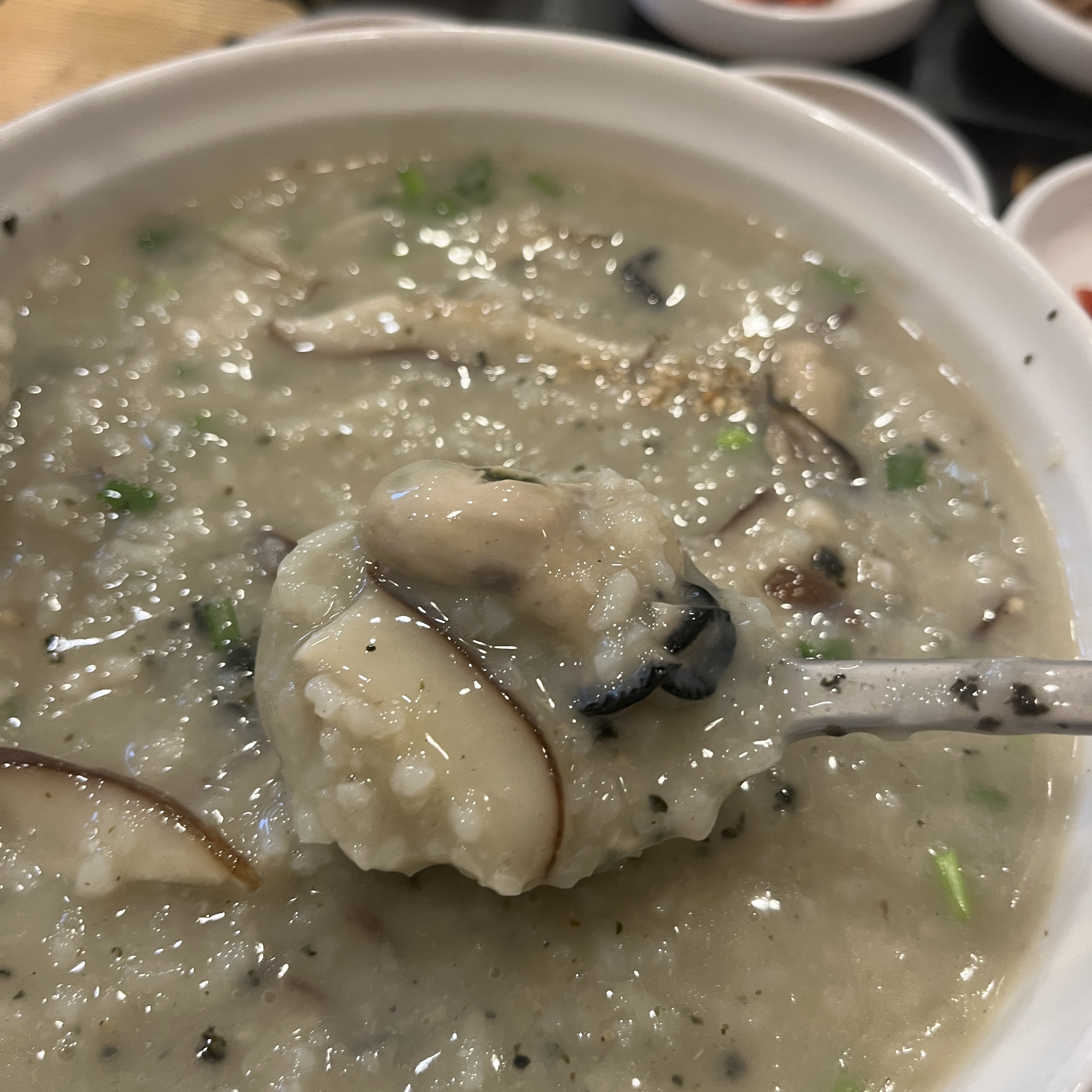 버섯은 표고버섯이 들어있었구요, 기본 쌀죽에 뭔가 육수가 첨가된 듯한 맛.. 해물육수가 첨가된 듯한 맛입니다.