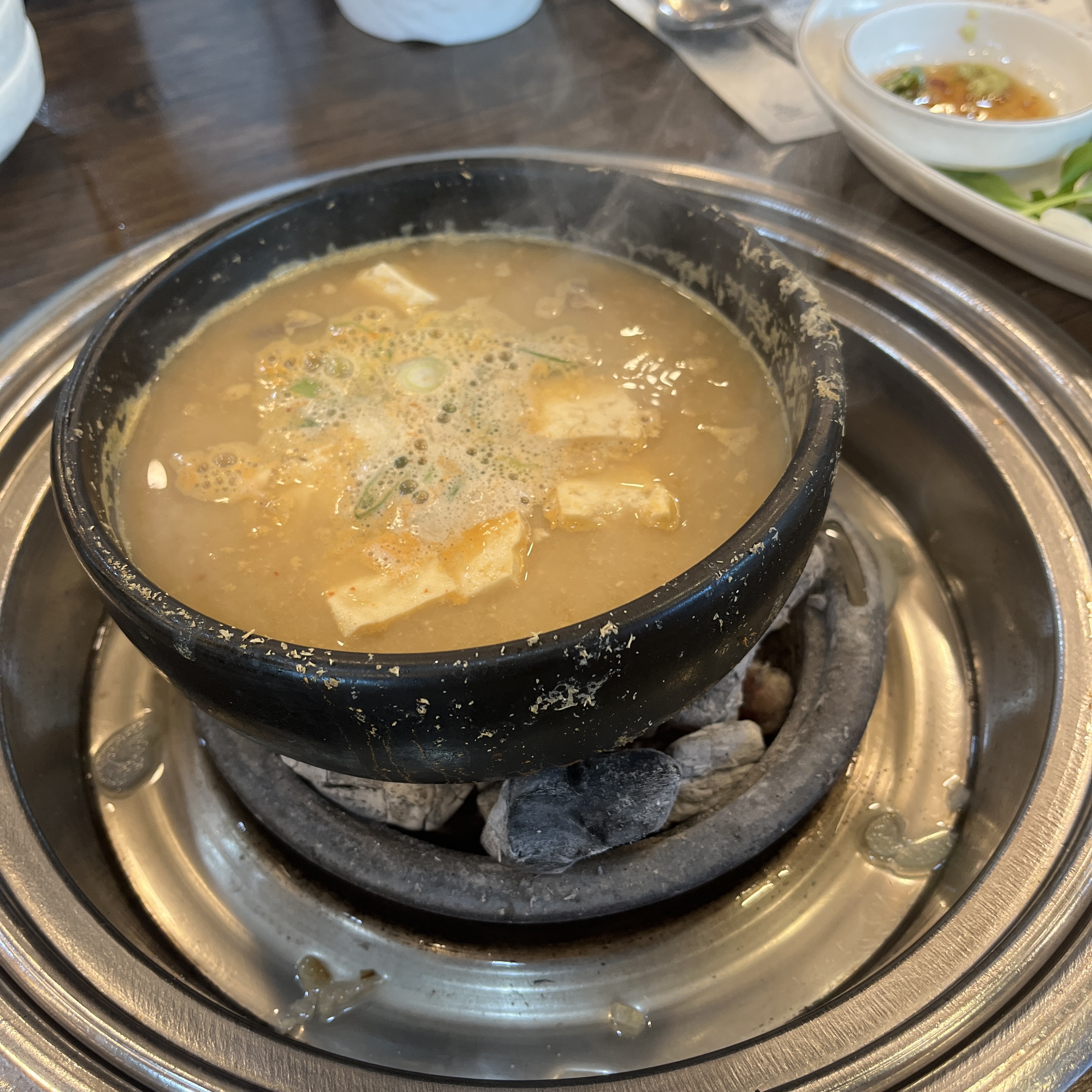숯의 잔열로 팔팔 끓이면서 먹는 이 청국장이 진짜 일품이에요.