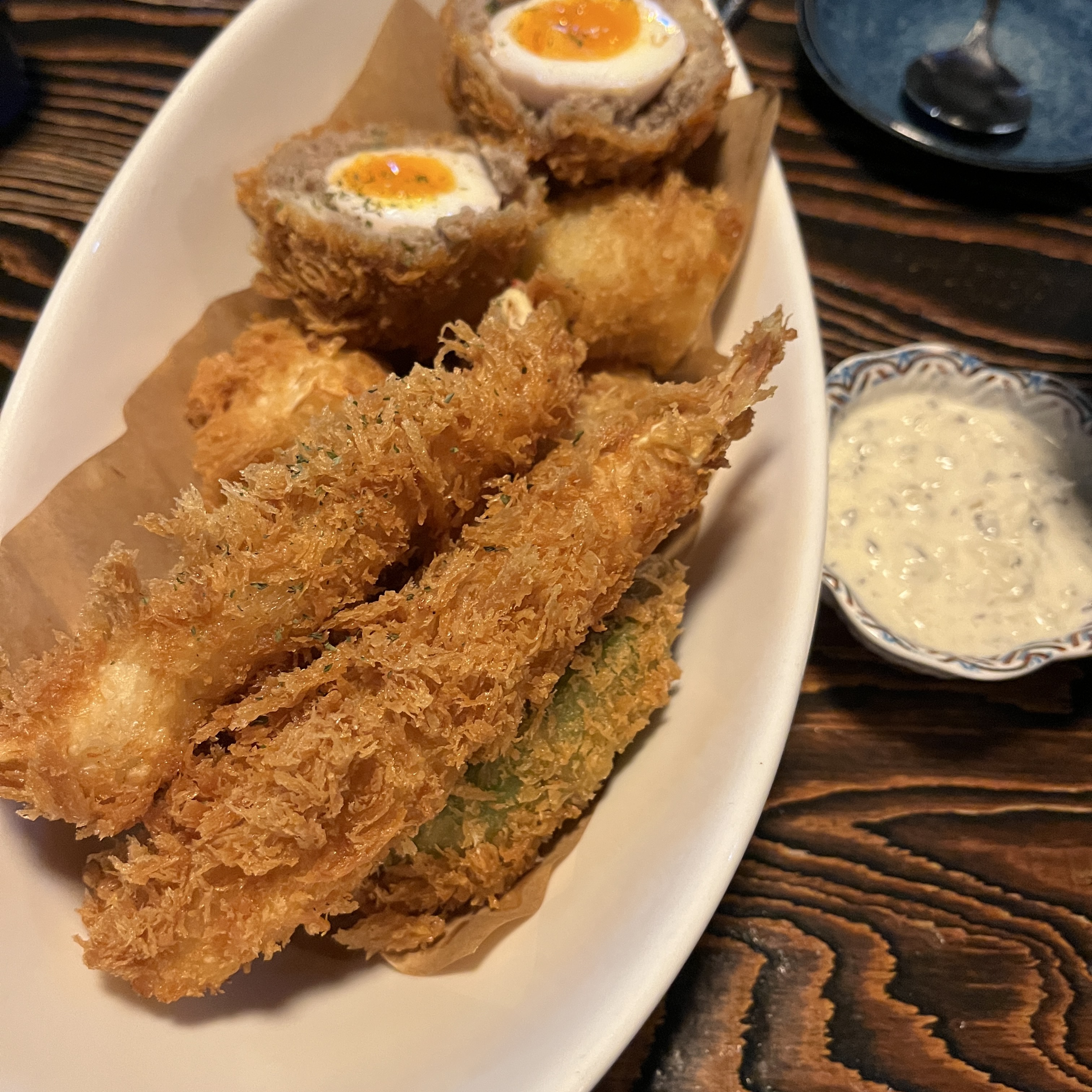 구성은 새우튀김, 아보카도튀김, 모짜렐라튀김, 양파튀김, 멘치카츠에요.