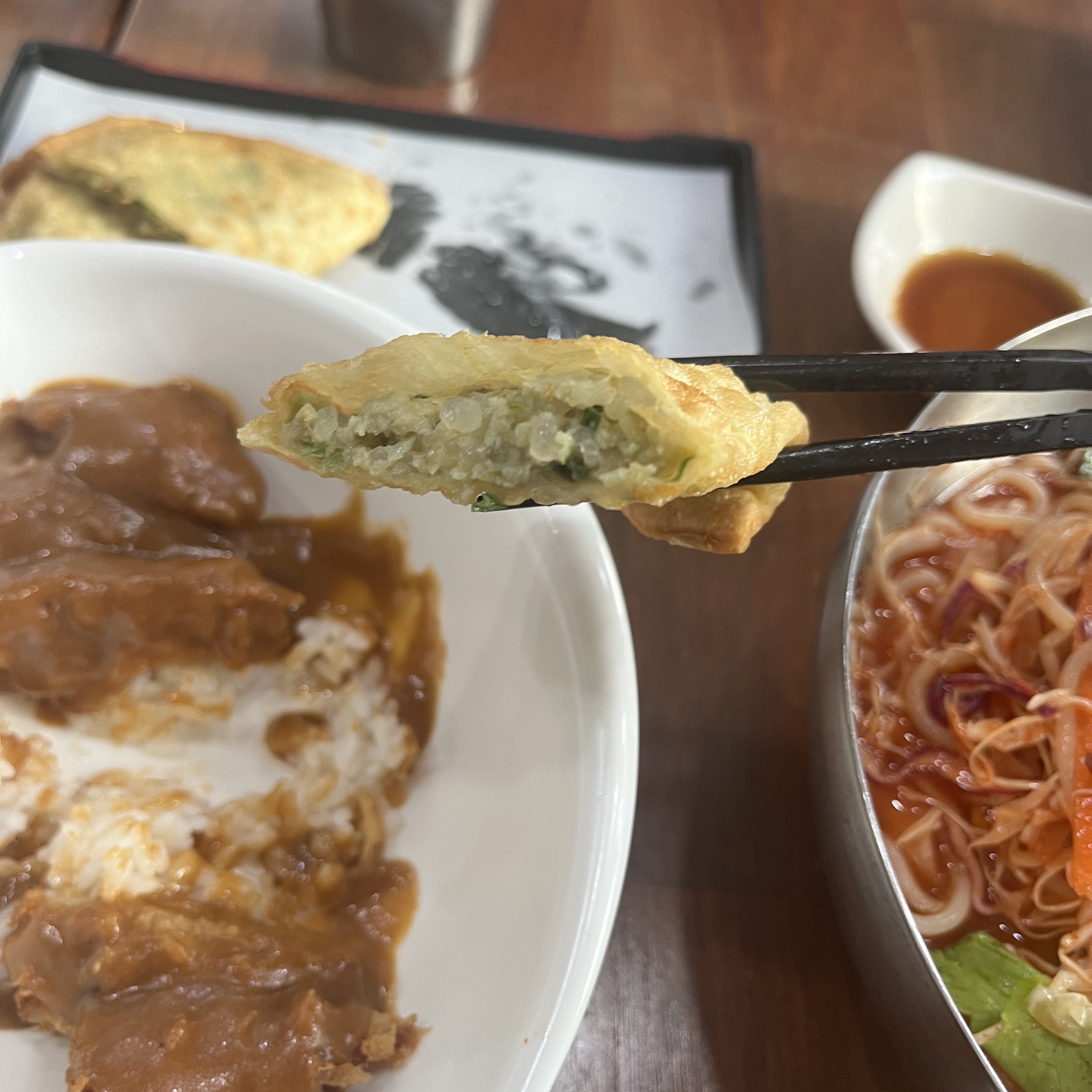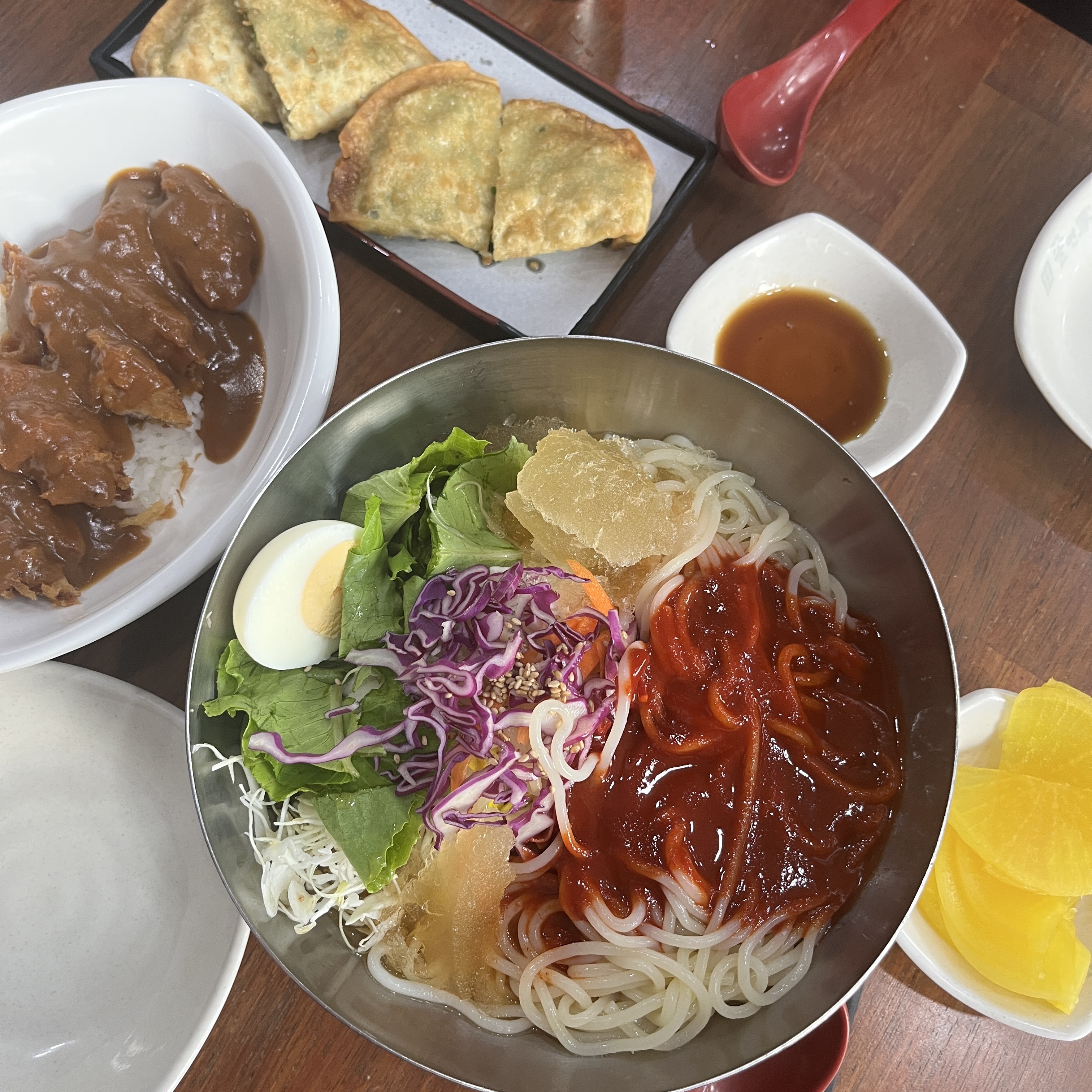 자, 물쫄면+사이드돈까스와 납작만두부터 나왔습니다.