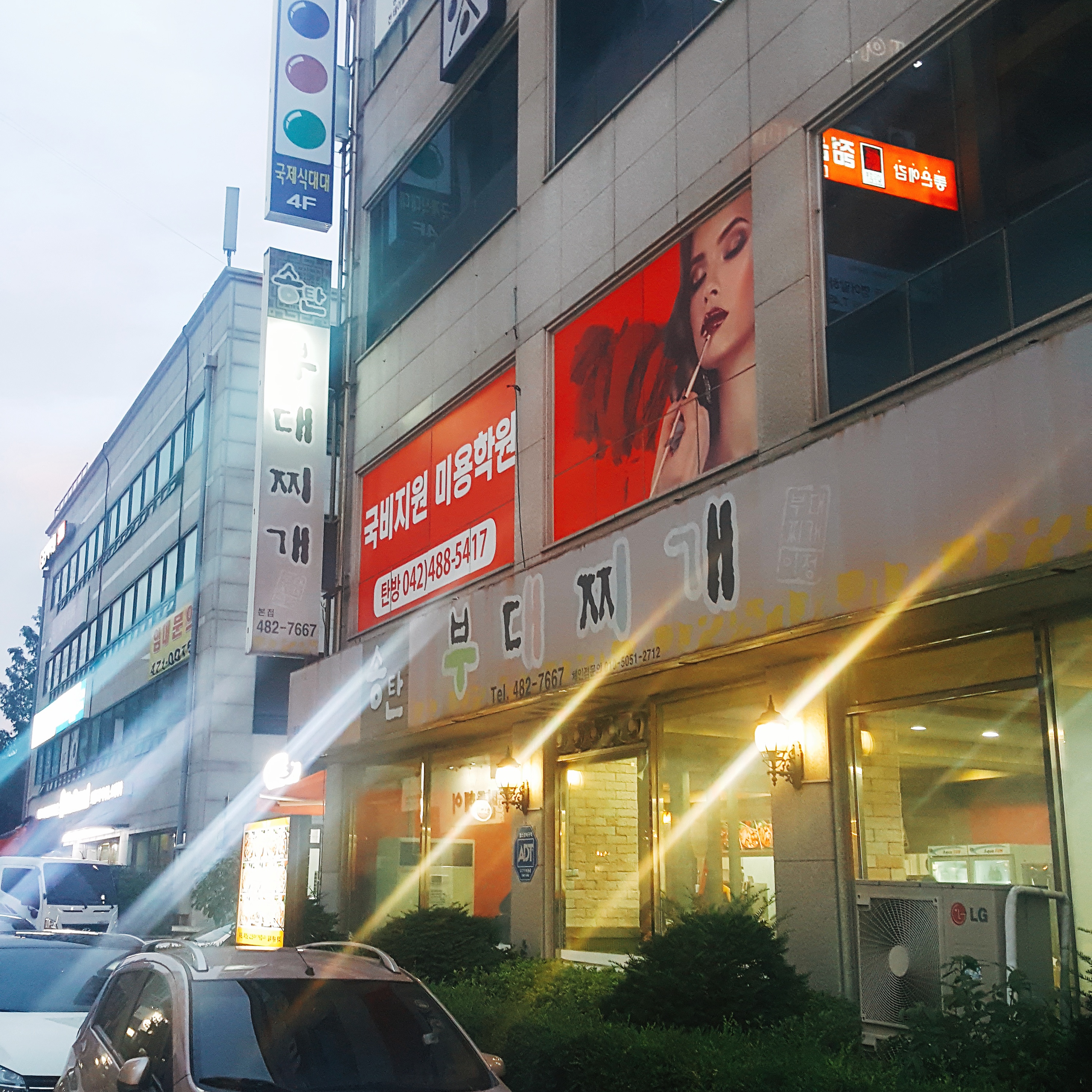 그래도 이 거리의 터줏대감들은 그 미술학원이 몰려있는 라인 뒤쪽 골목에 있다고 해도 과언이 아닌데요, 그 중에서도 간판만 봐도 '아 오래됐구나'라고 느낄 수 있는 부대찌개 맛집이 있습니다. 바로 '송탄부대찌개'.