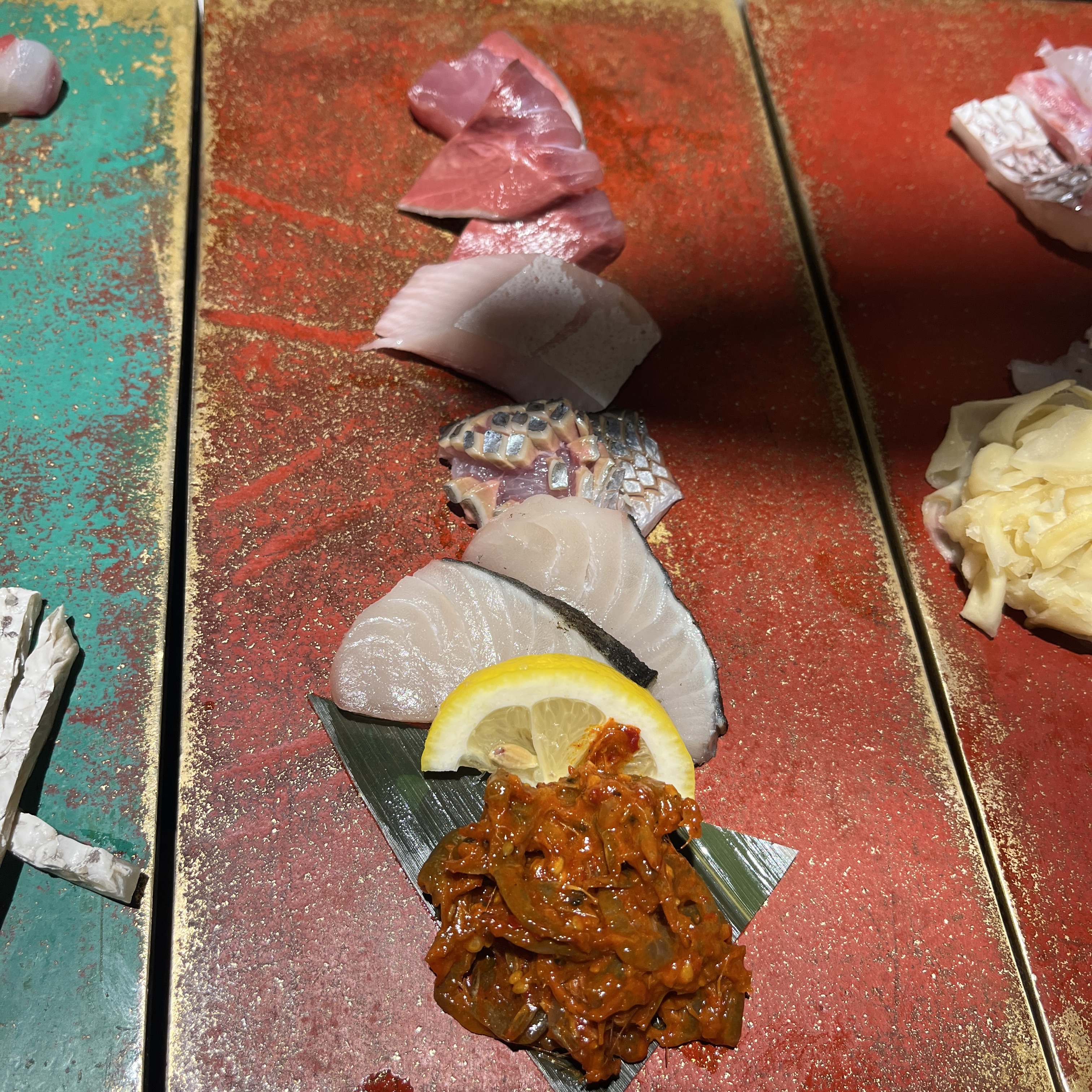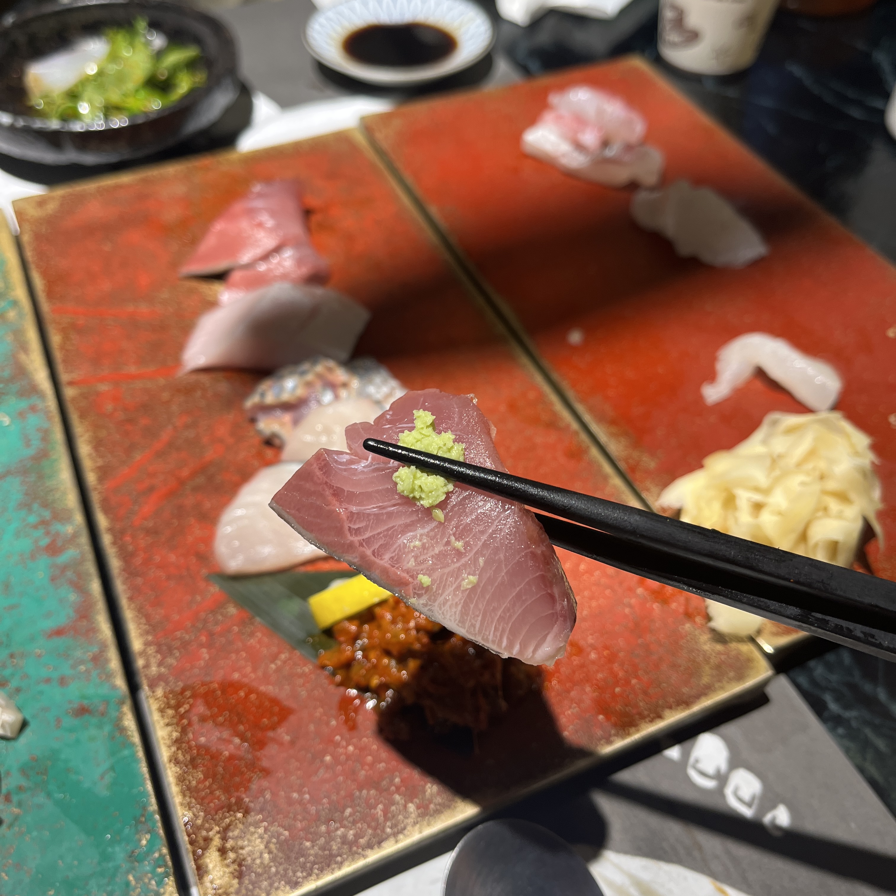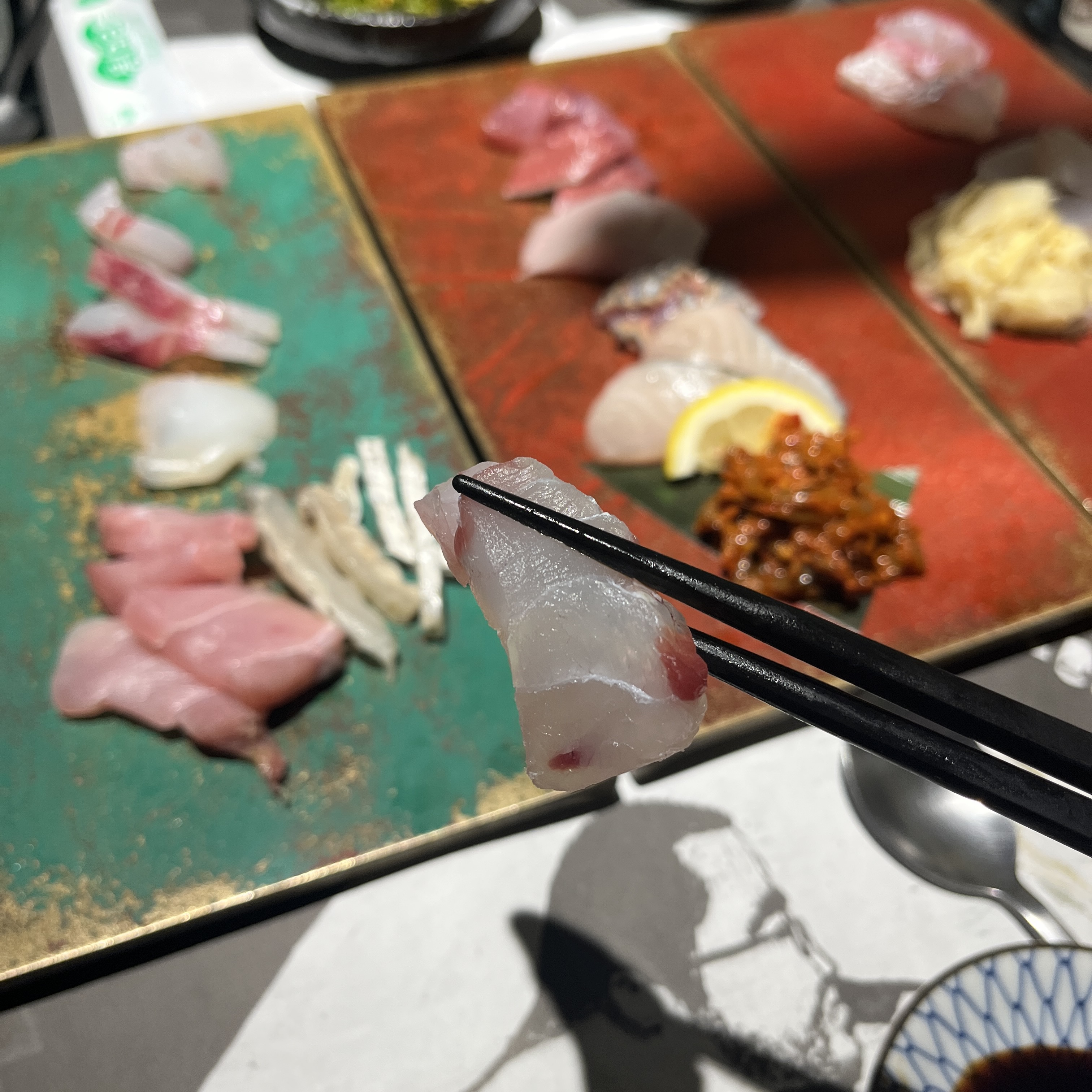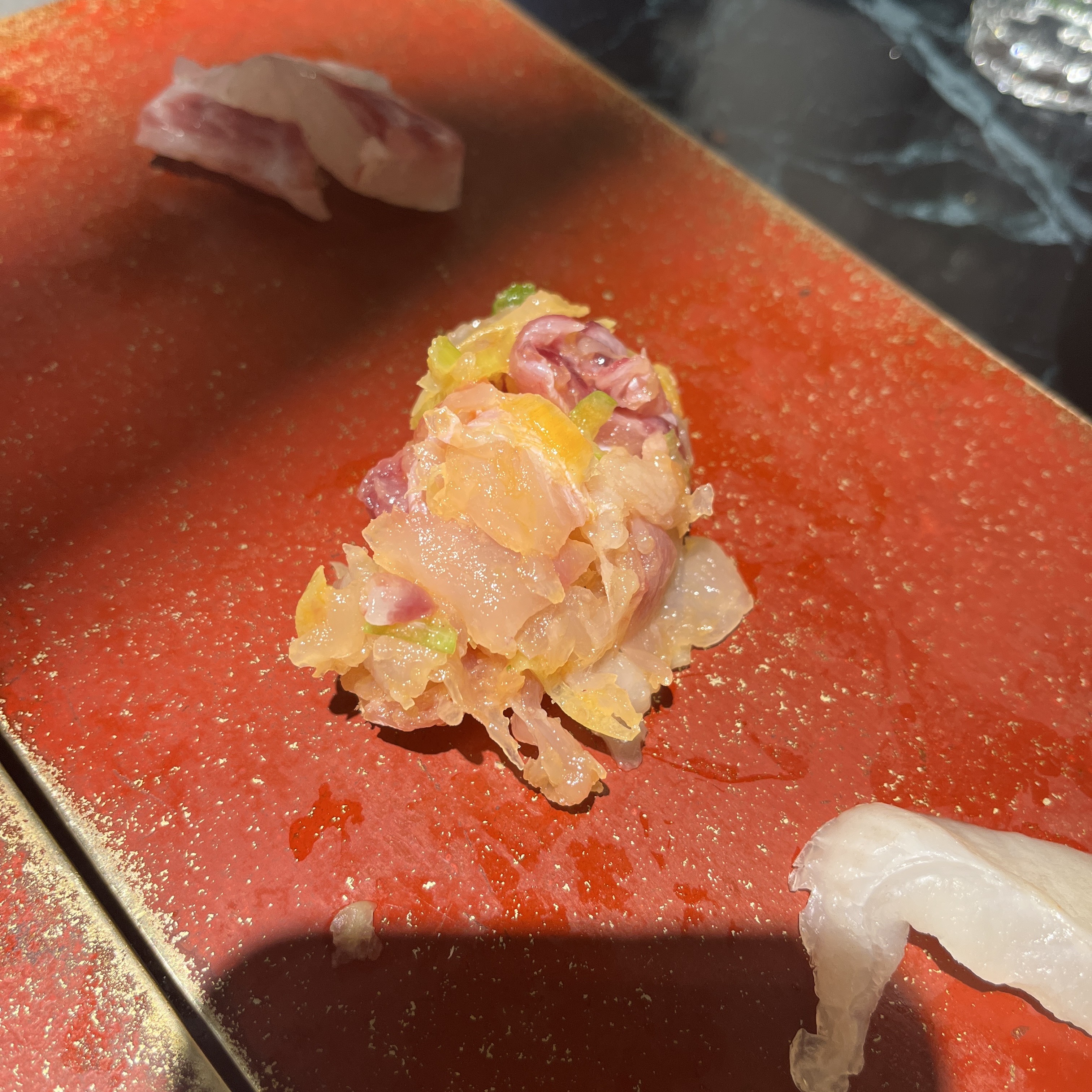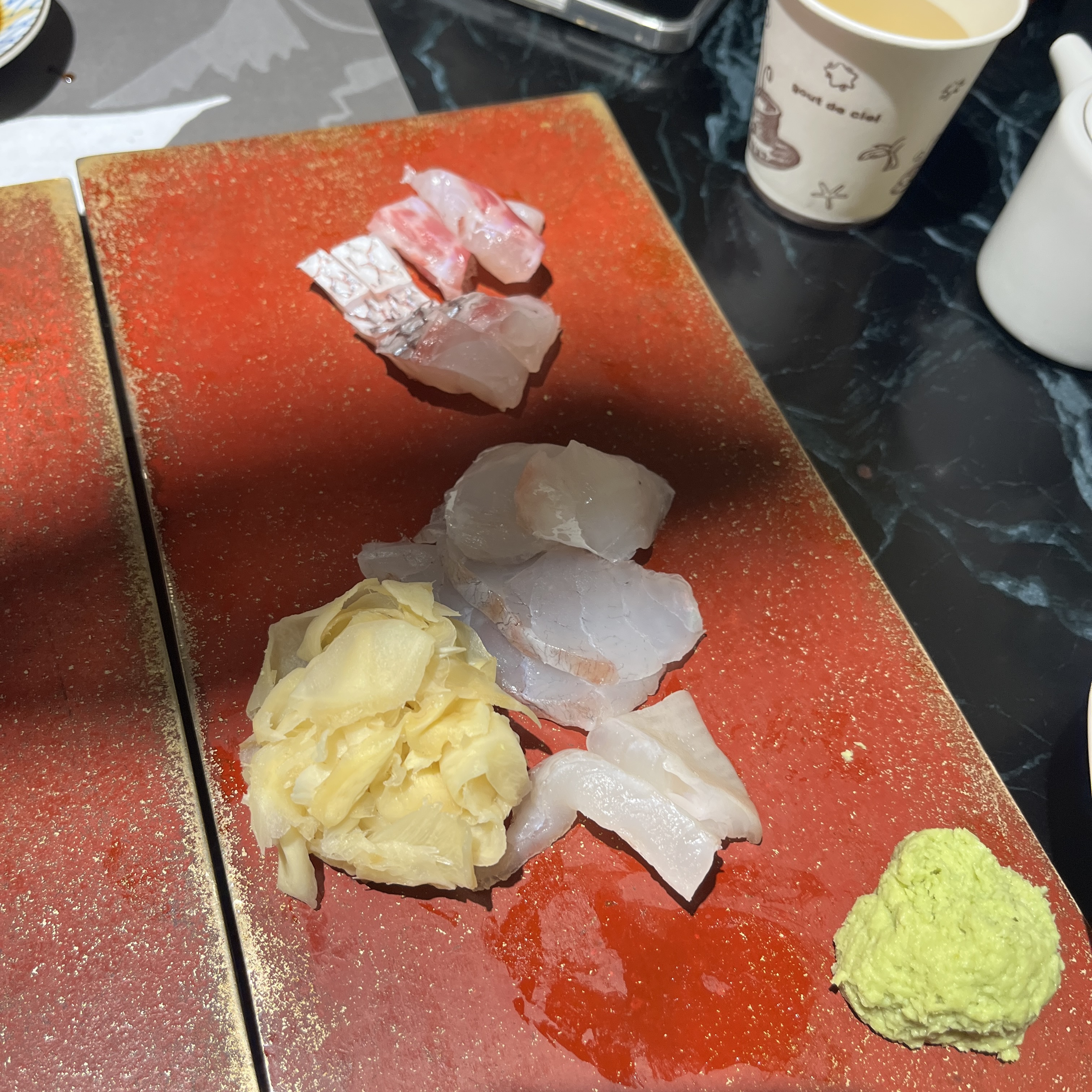 요게.. 민어라고 하셨나.. 무튼 한점 집어 먹어봤는데요, 아 여기 와사비도 맵지 않아서 듬뿍듬뿍 얹어먹어도 부담이 없었습니다.