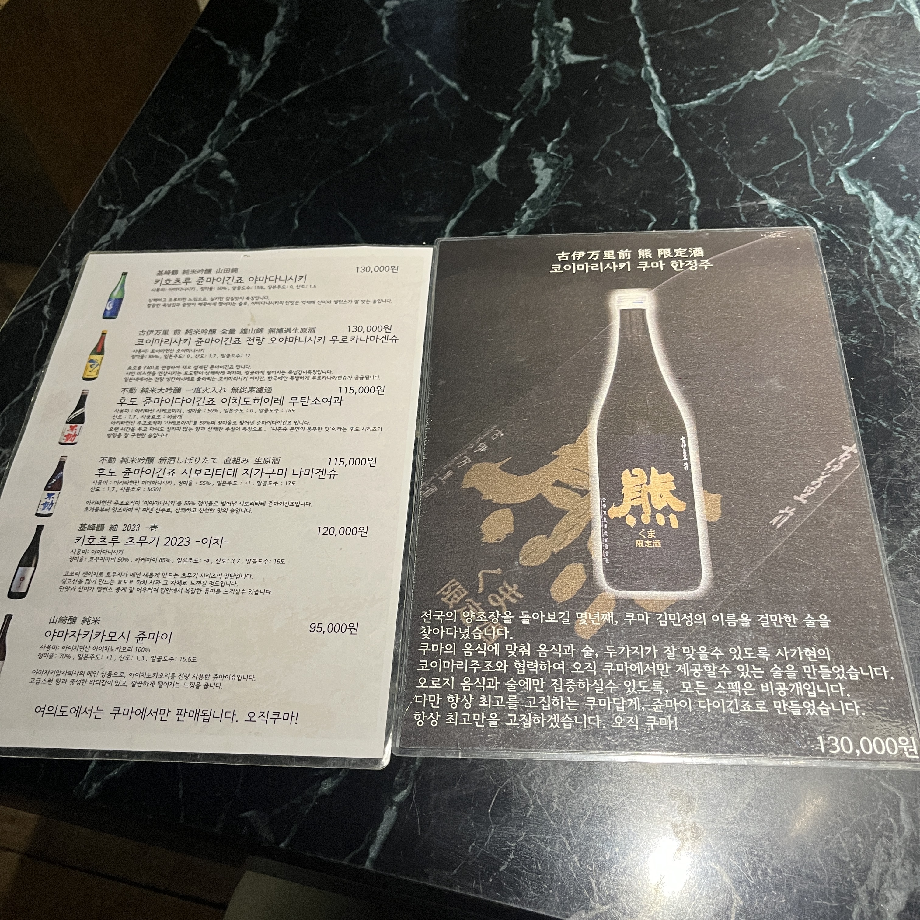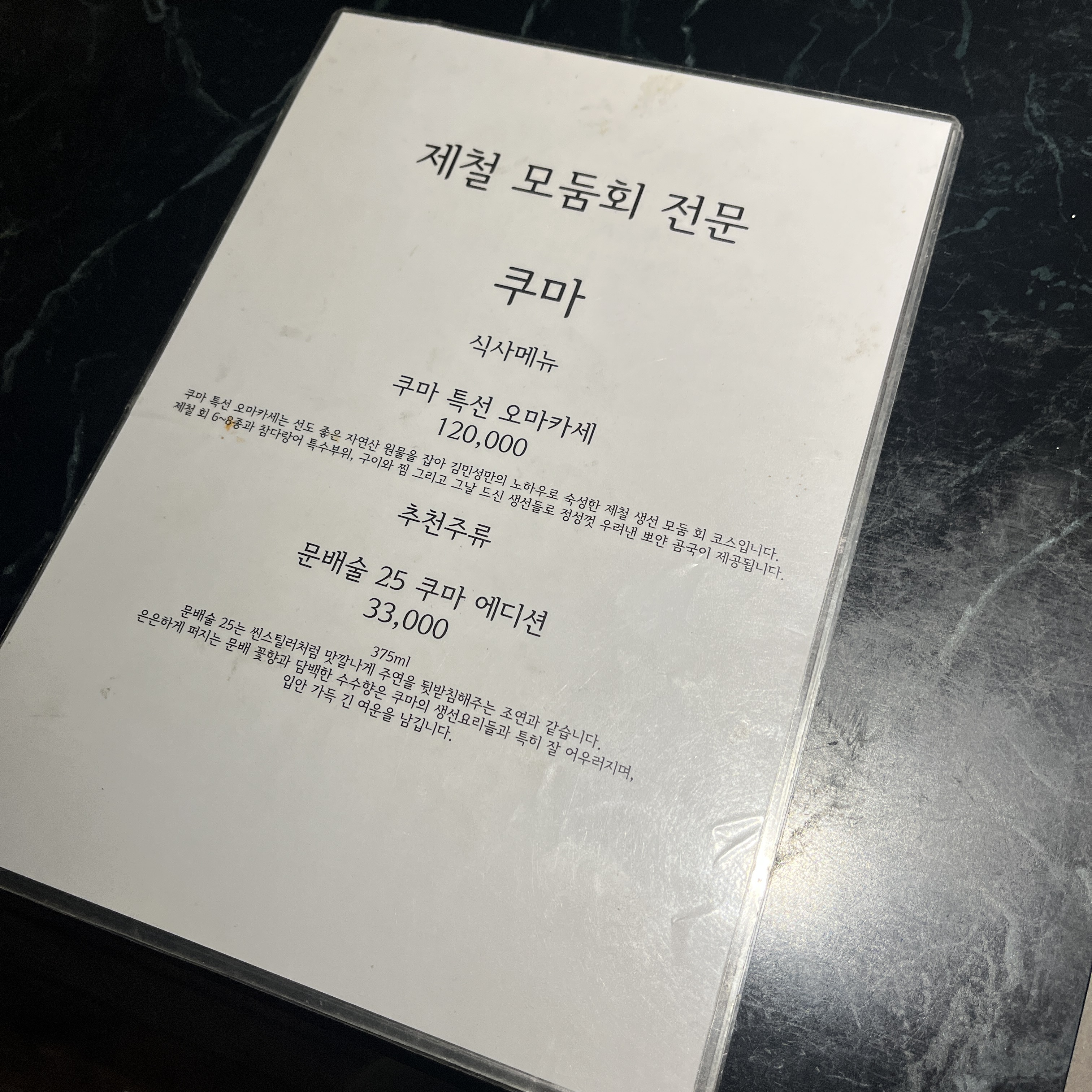 메뉴는 한가지입니다. '쿠마 특선 오마카세'.