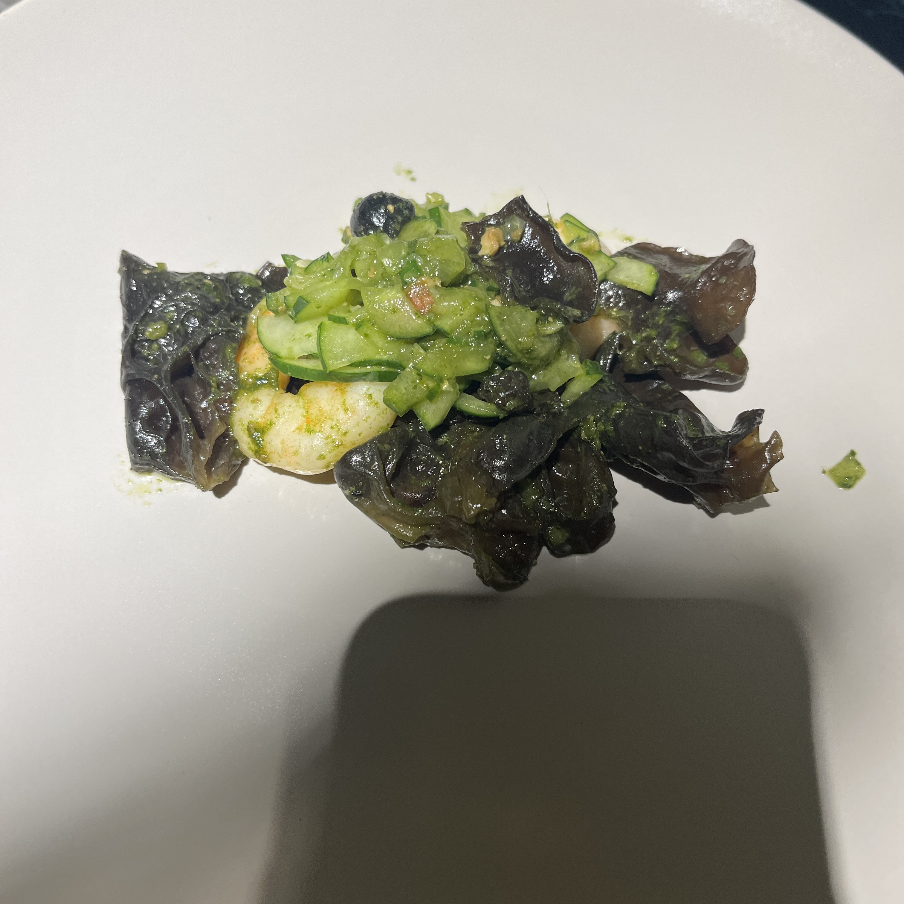 바질페스토랑 목이버섯, 오이와 새우가 버무려진 음식입니다.