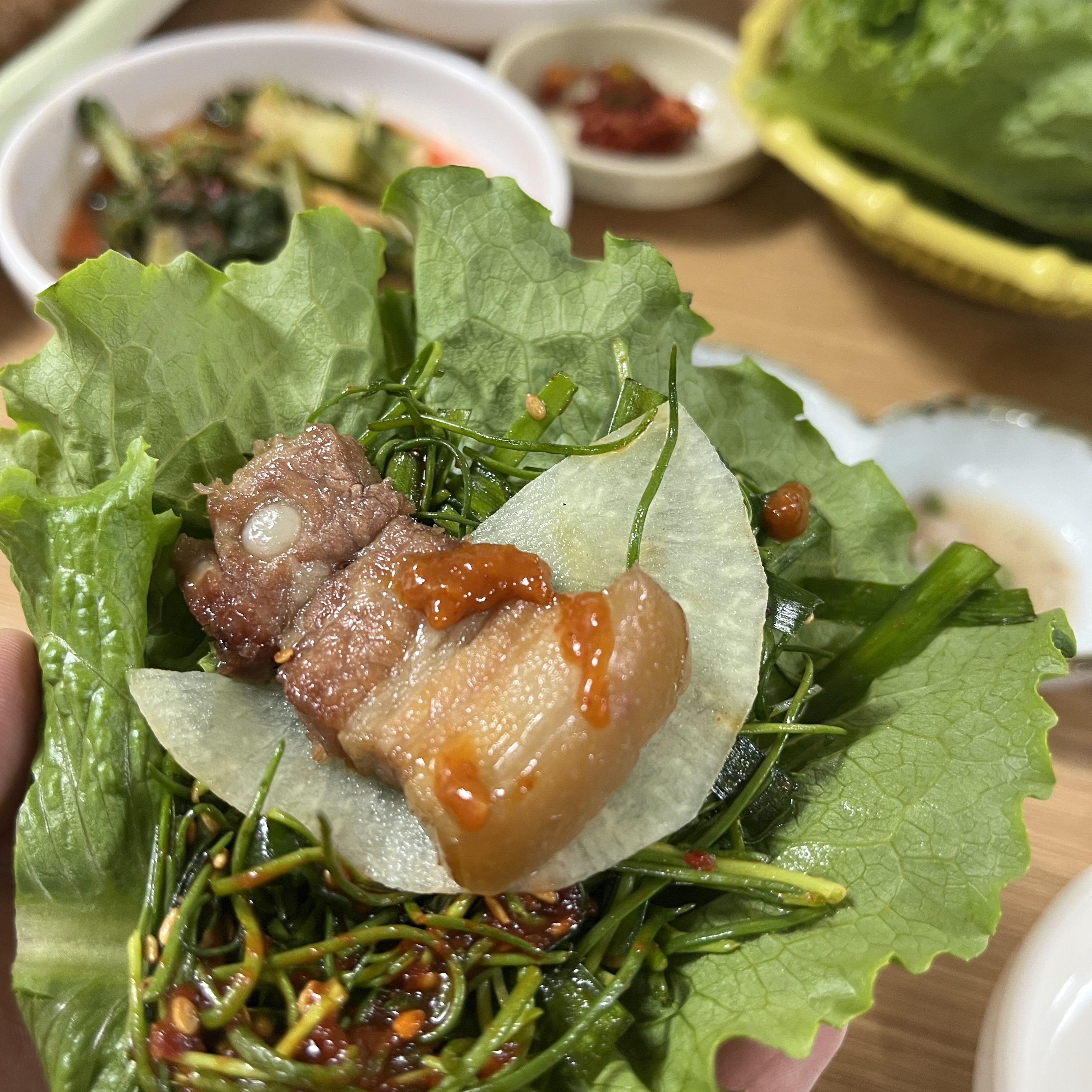 그리고 이 집 수육은, 위처럼 부추무침은 아닌데.. 무슨 채소로 무친 무침이랑, 쌈무, 그리고 고기와 쌈장 싹 곁들여먹으면. .키야.. .둘이먹다 하나 죽어도 모를맛!