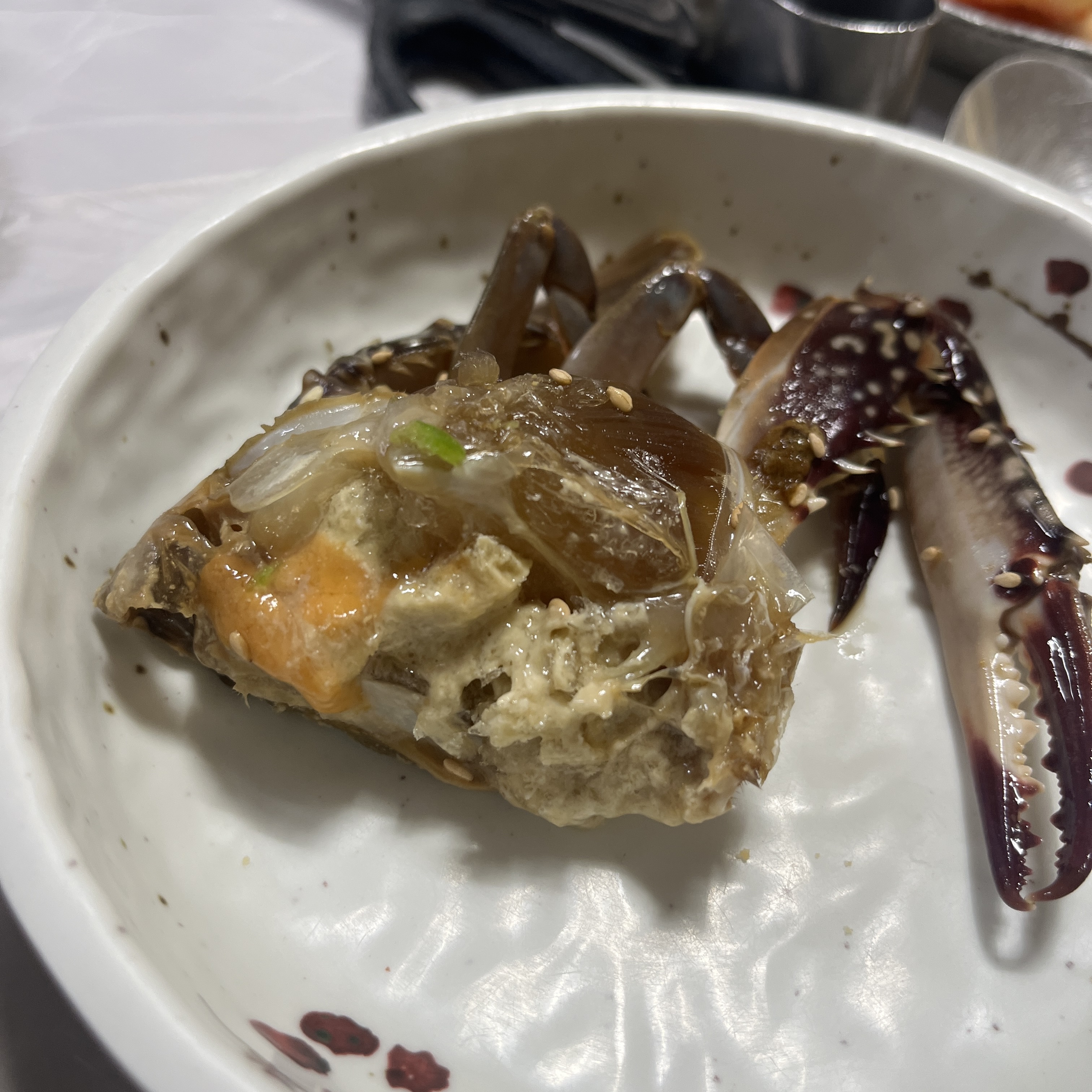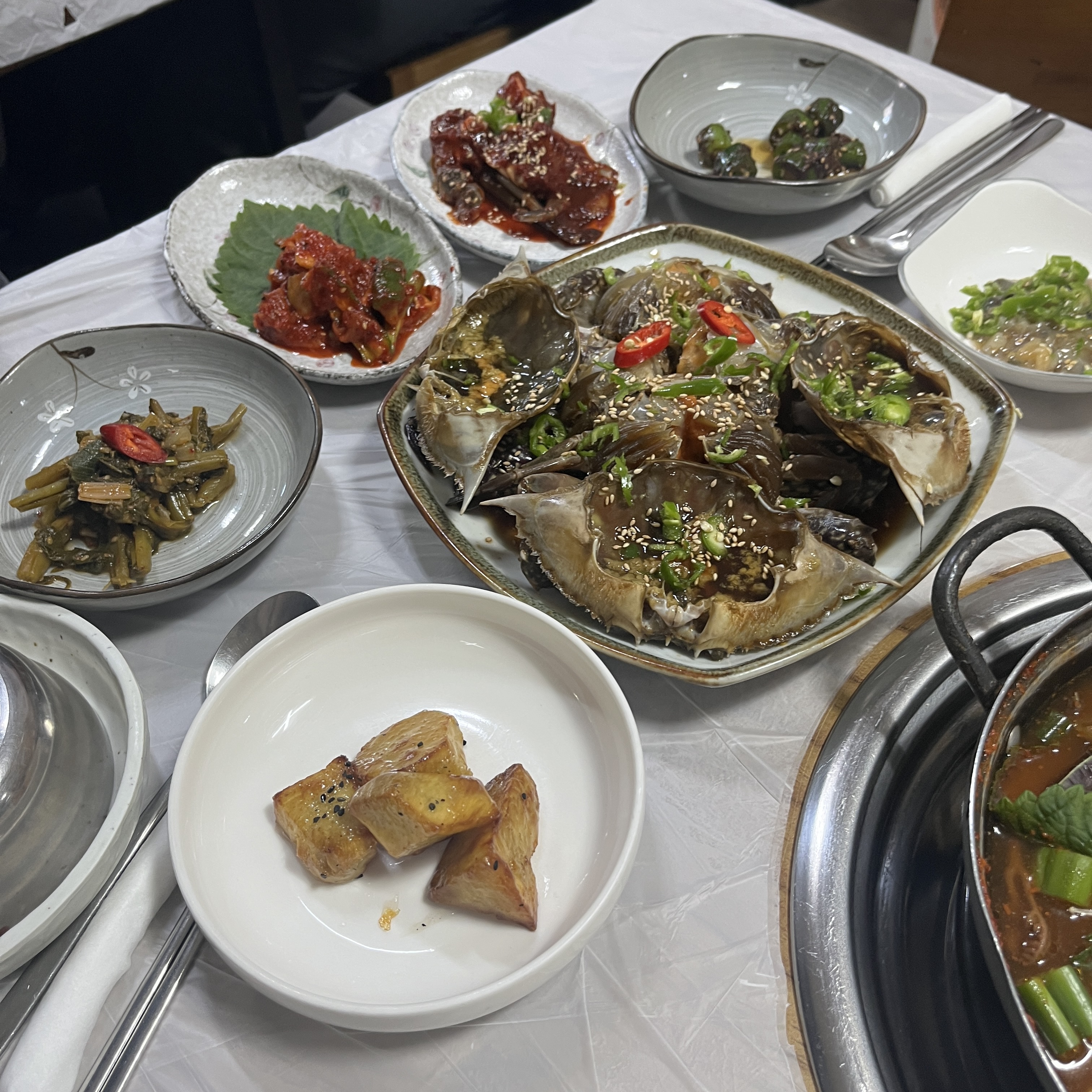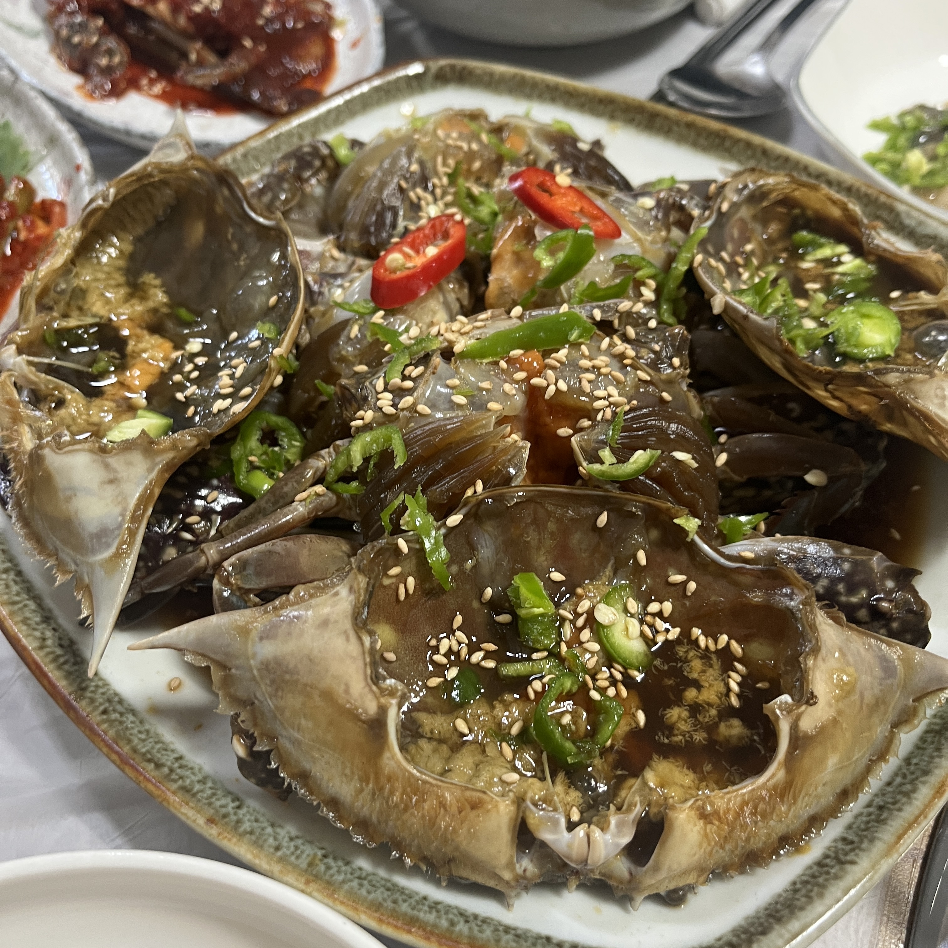 적당한 크기의 꽃게가 3마리 있었구요, 오른쪽에 보이는 조게젓갈.. 저게 또 아주 밥도둑이에요.