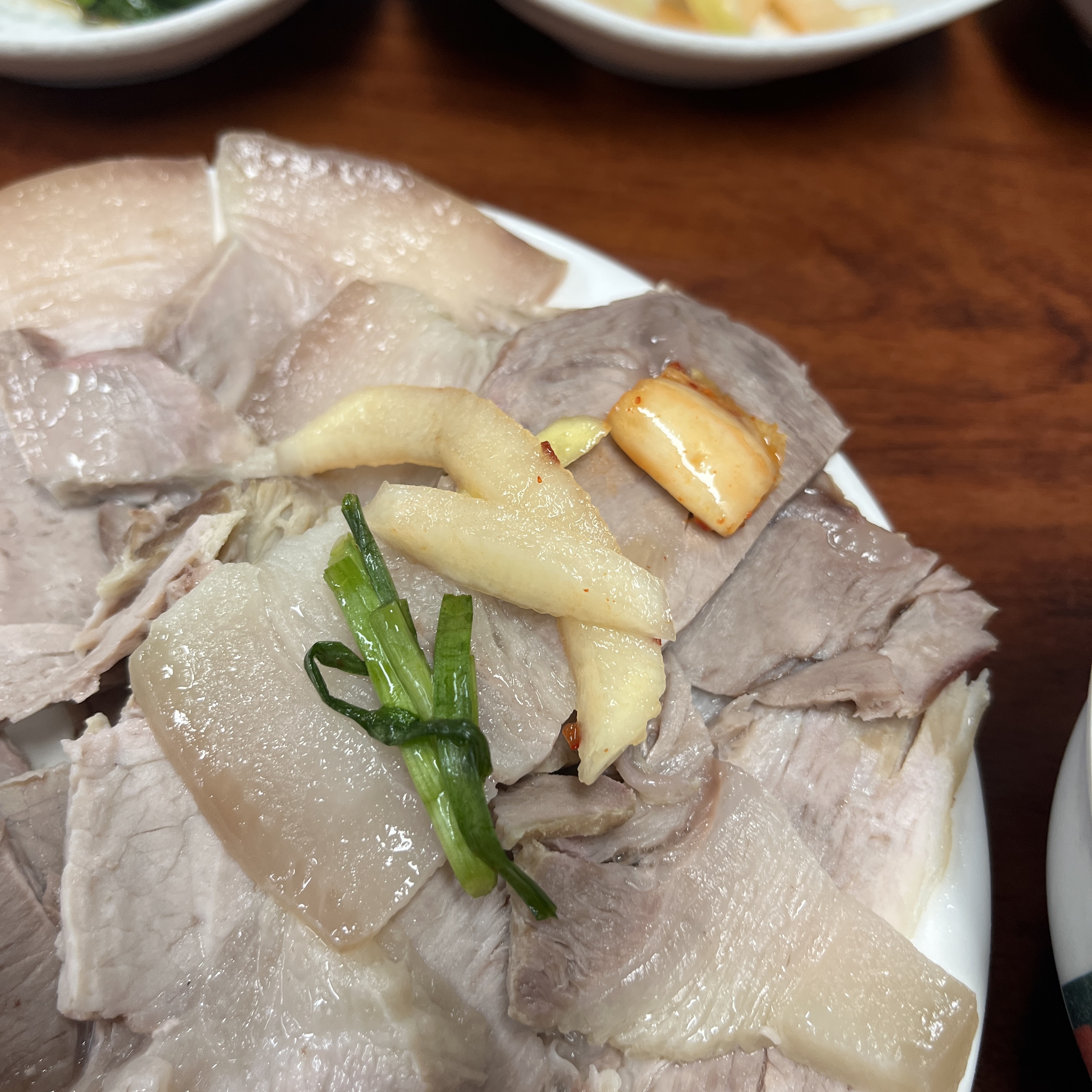 자, 1인1접시로 나오는 수육입니다. 부위는 앞다릿살? 혹은 뒷다릿살 부위로 보였구요, 비계부분이 껍데기까지 해서 맛스럽게 붙어있었고, 양도 아주 상당했습니다.