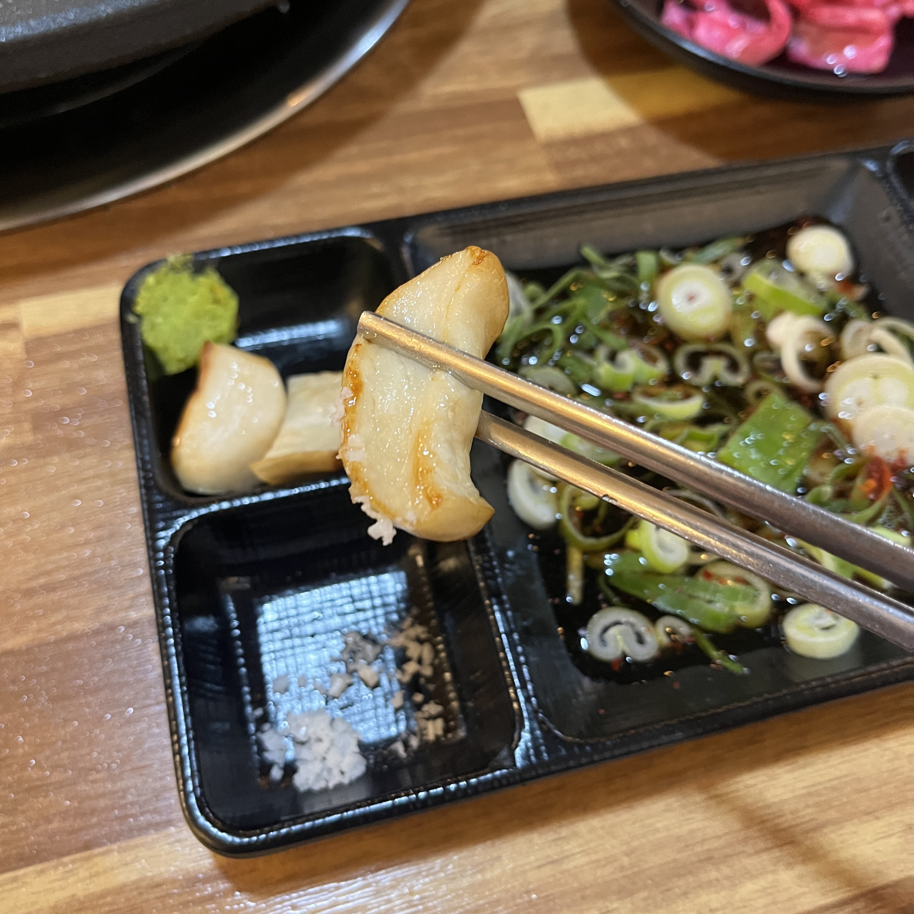 와사비랑 소금기름장 살짝 얹어먹으면, 고기의 좋은 맛과, 숙성된 좋은 향이 아주 잘 느껴집니다.