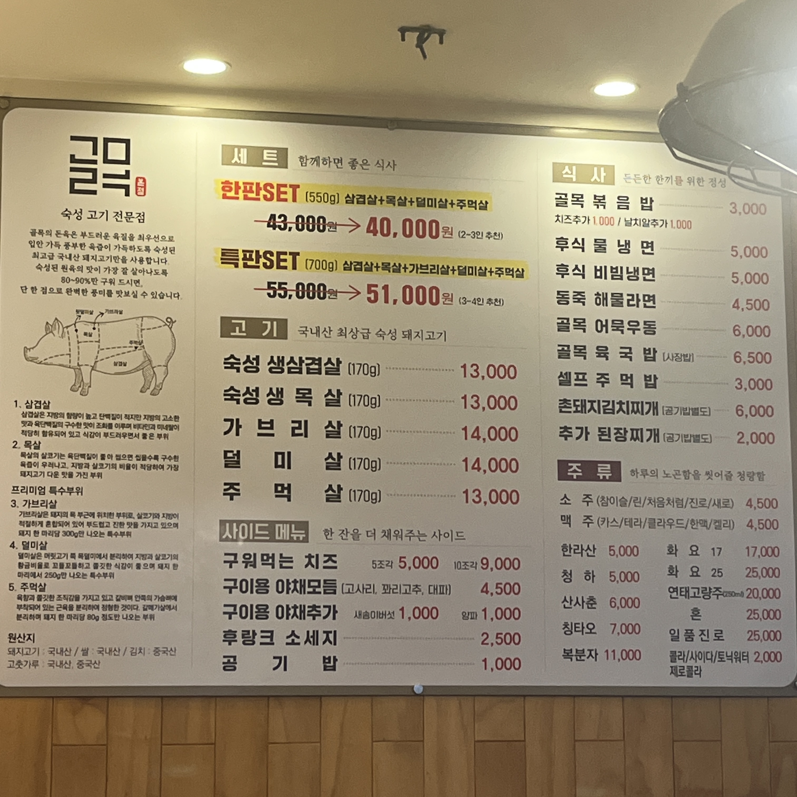 생삼겹, 생목살 등이 준비되어 있는데, 간단하게 '한판세트'로 세트로 시키시면 딱 됩니다.