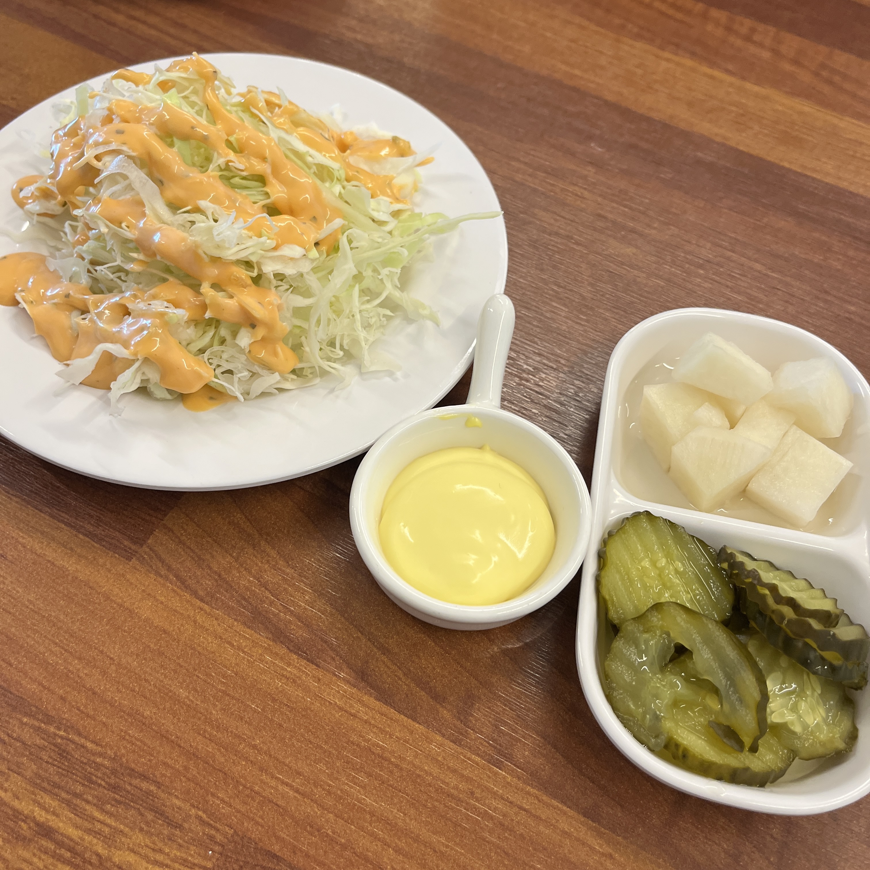 꾸덕한 마요소스가 좋았던 양배추샐러드에, 치킨무, 오이피클, 그리고 갈릭마요소스가 제공됩니다.