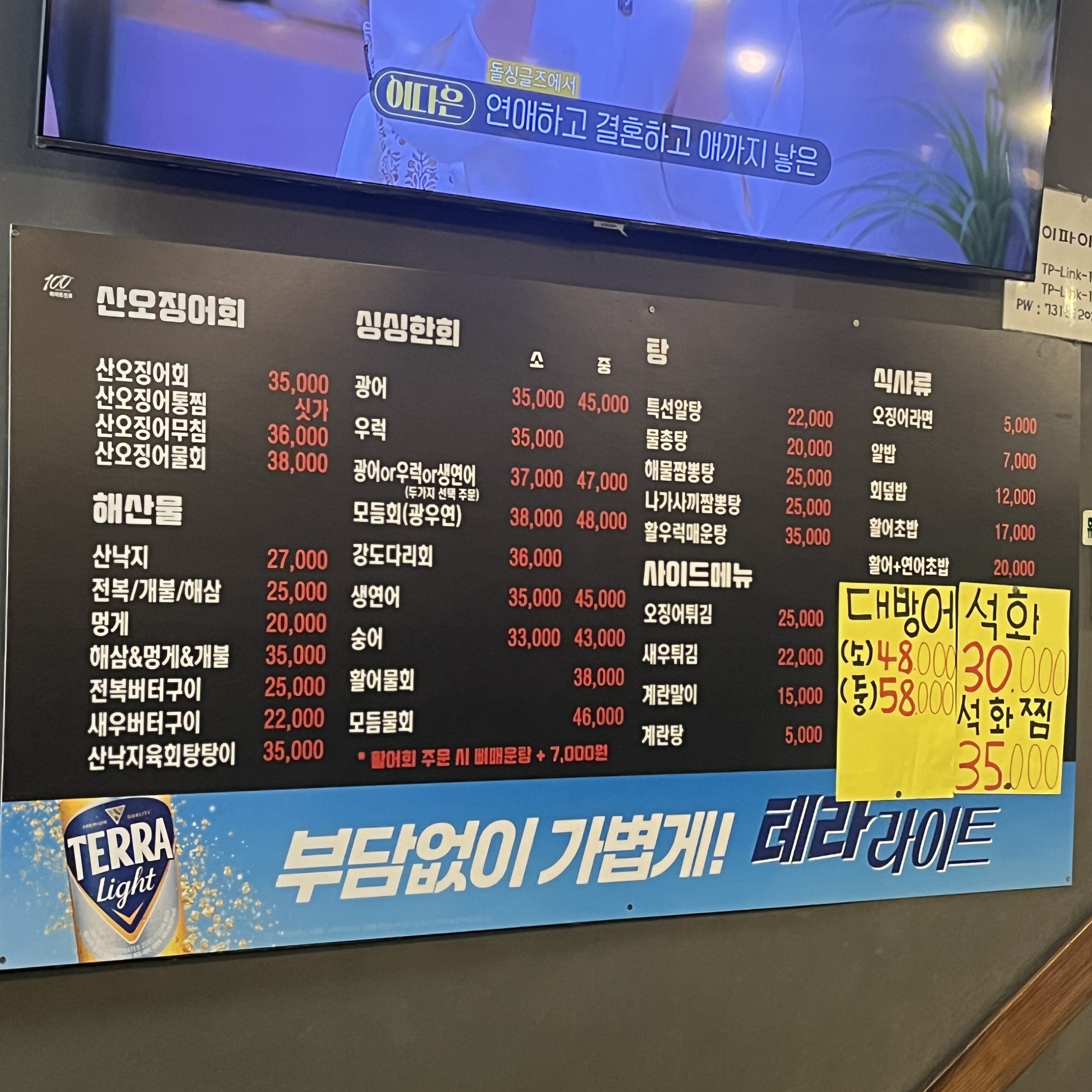 저는 지인들과, 방어철이라서 대방어 중짜리 시켰구요, 산오징어통찜 시켰고, 나중에 안주삼아서 나가사끼짬뽕탕까지 시켰습니다.