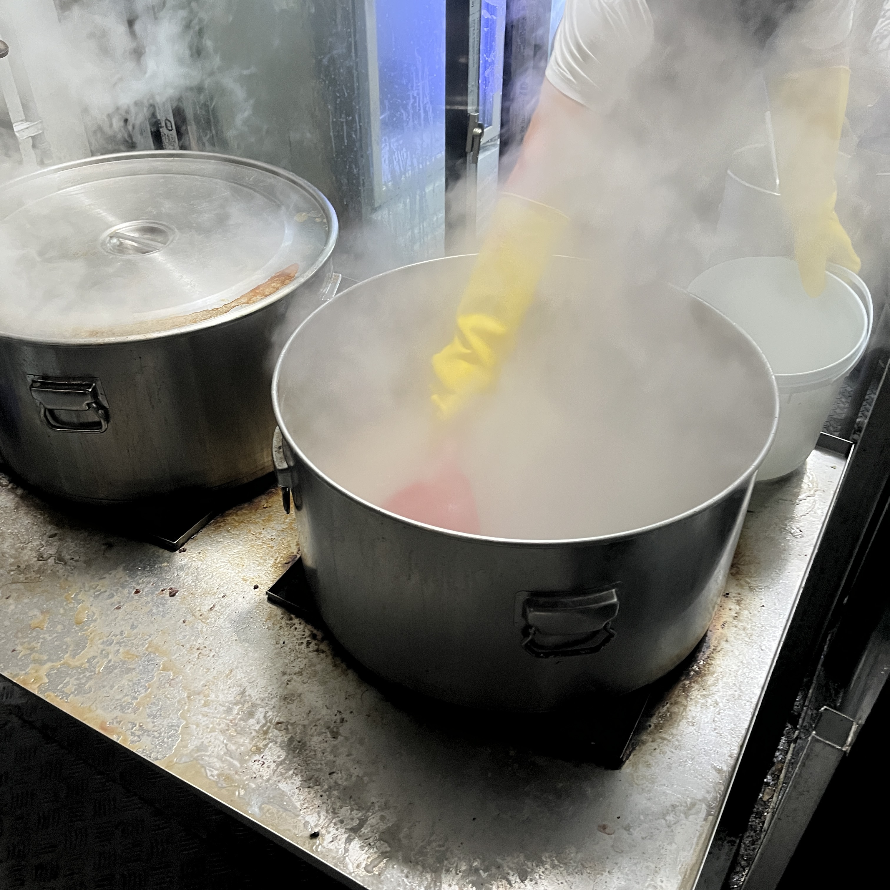 가게 안에서 즉석에서 수육 써는 모습과, 가게 입구쪽에서 팔팔 끓고있는 커다란 통이 이 집의 맛을 보여줍니다.