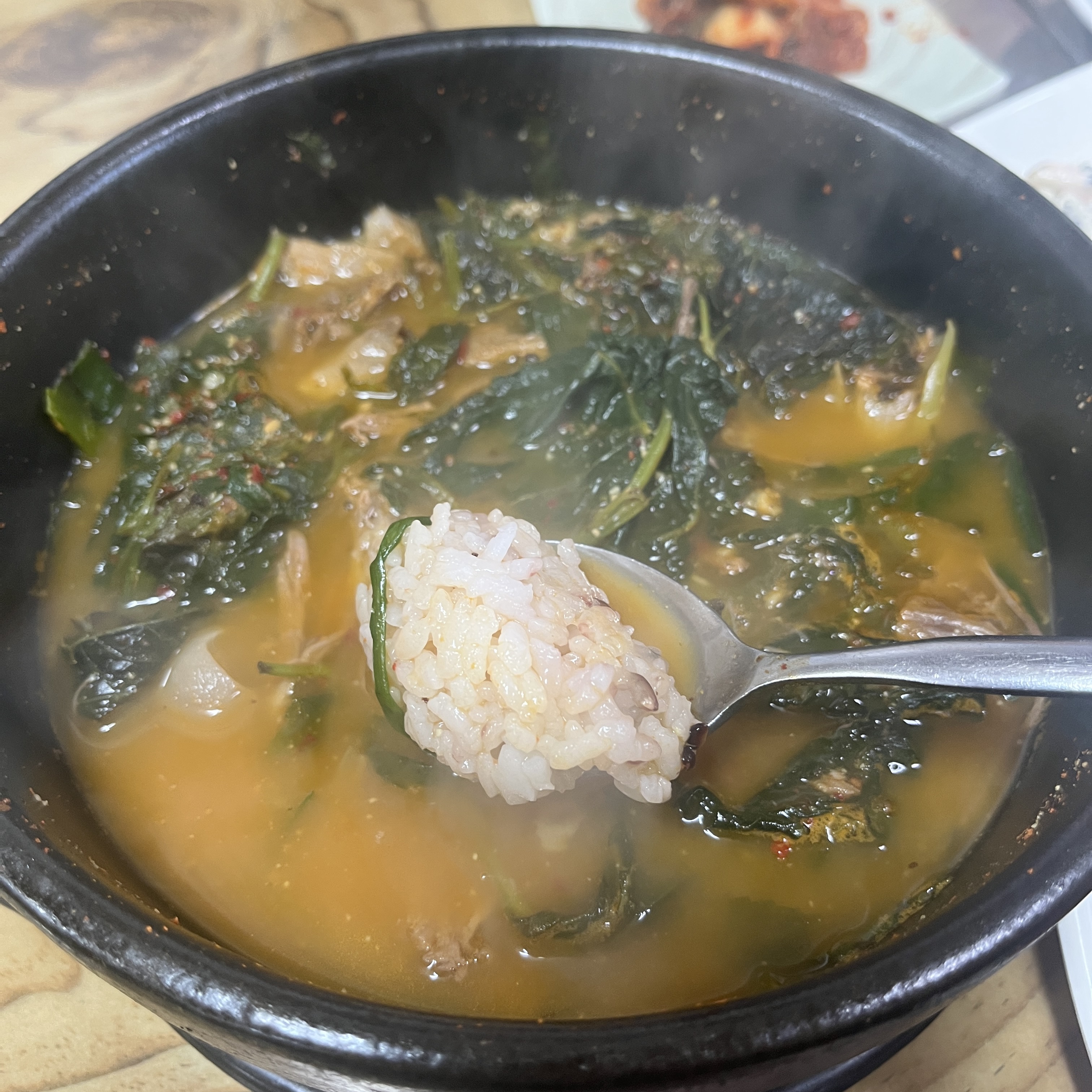 그 식감의 고기에 탕에 들은 고소한 채소? 야채?의 맛에.