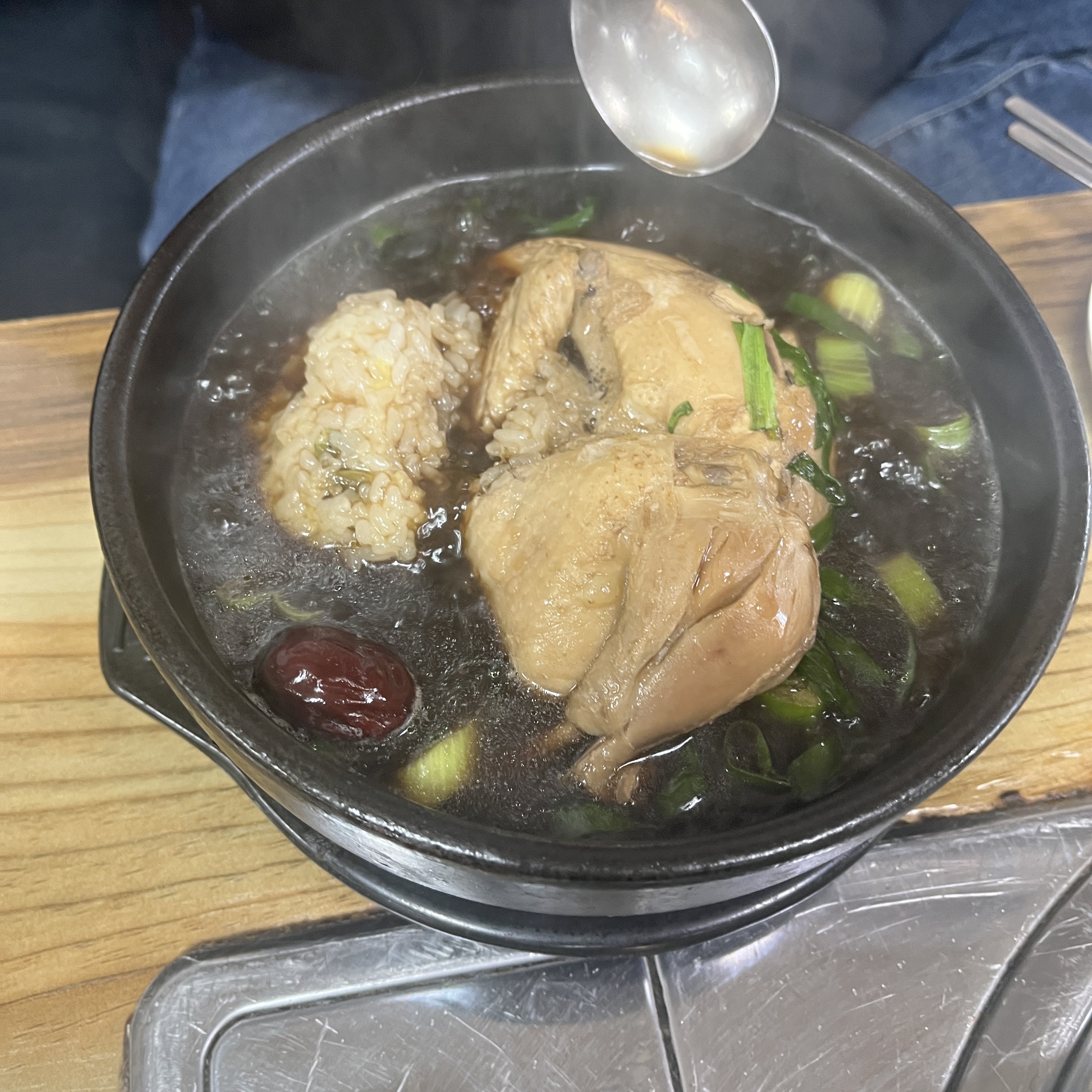 닭 한마리가 통쨰로 들어있고, 능이버섯 덕분에 국물이 새까만개 특징이고요, 그리고 찹쌀도 잘 들어있습니다.