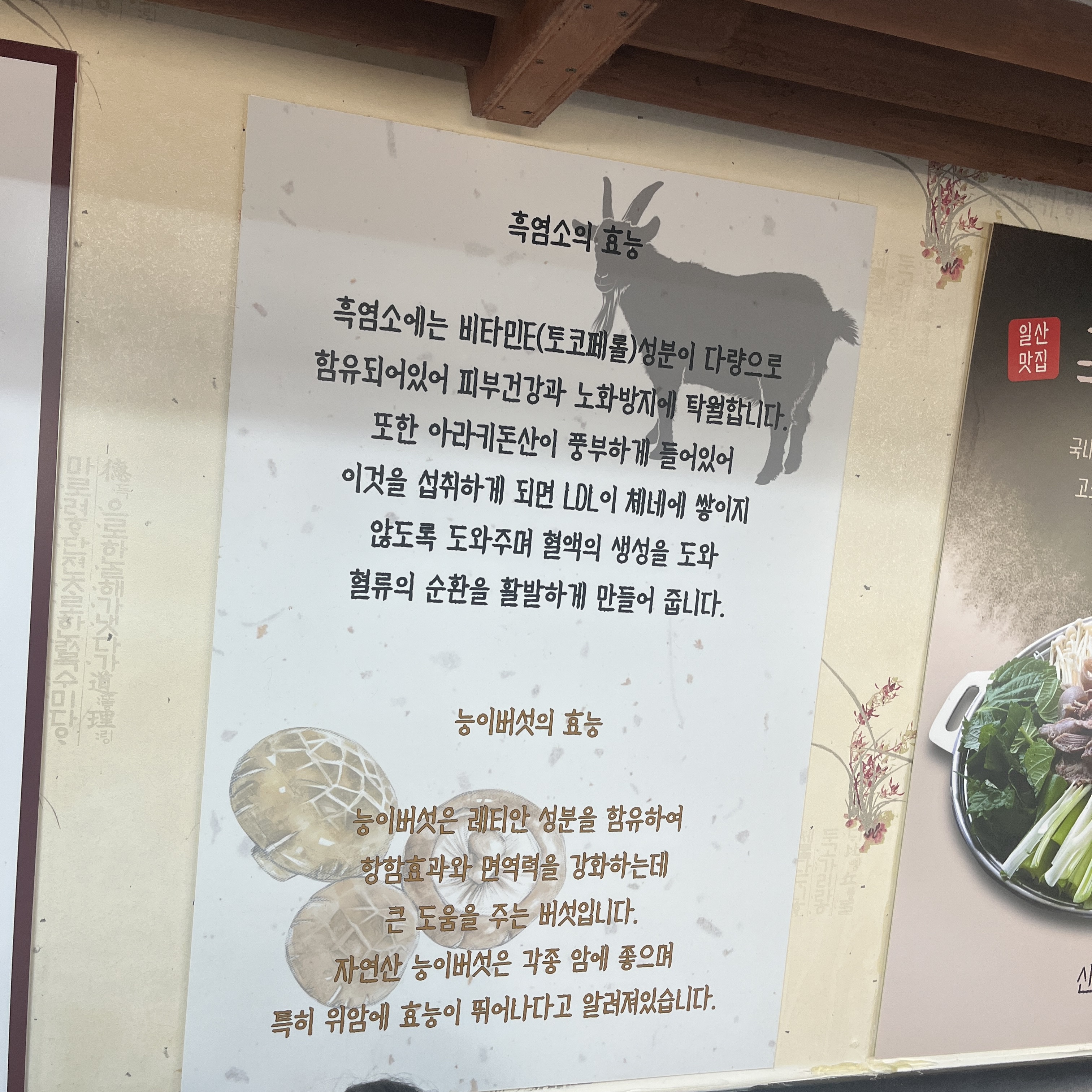 자, 흑염소와 능이버섯 효능 한번 읽어봐주시구요.