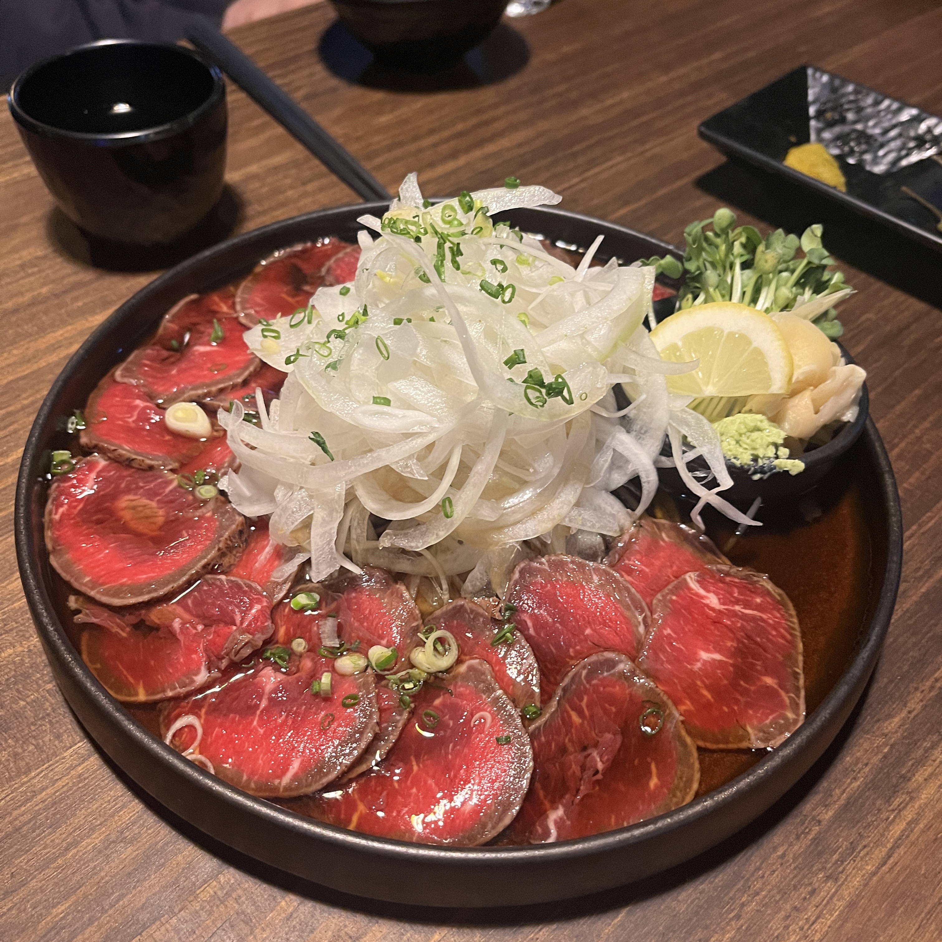잘박잘박하게 폰즈국물이 깔려있고, 한번도 먹어보진 않았지만 약간 사슴고기? 같은 느낌의 소고기가 얇고 동그랗게 썰려서 폰즈소스에 담겨져 있습니다.