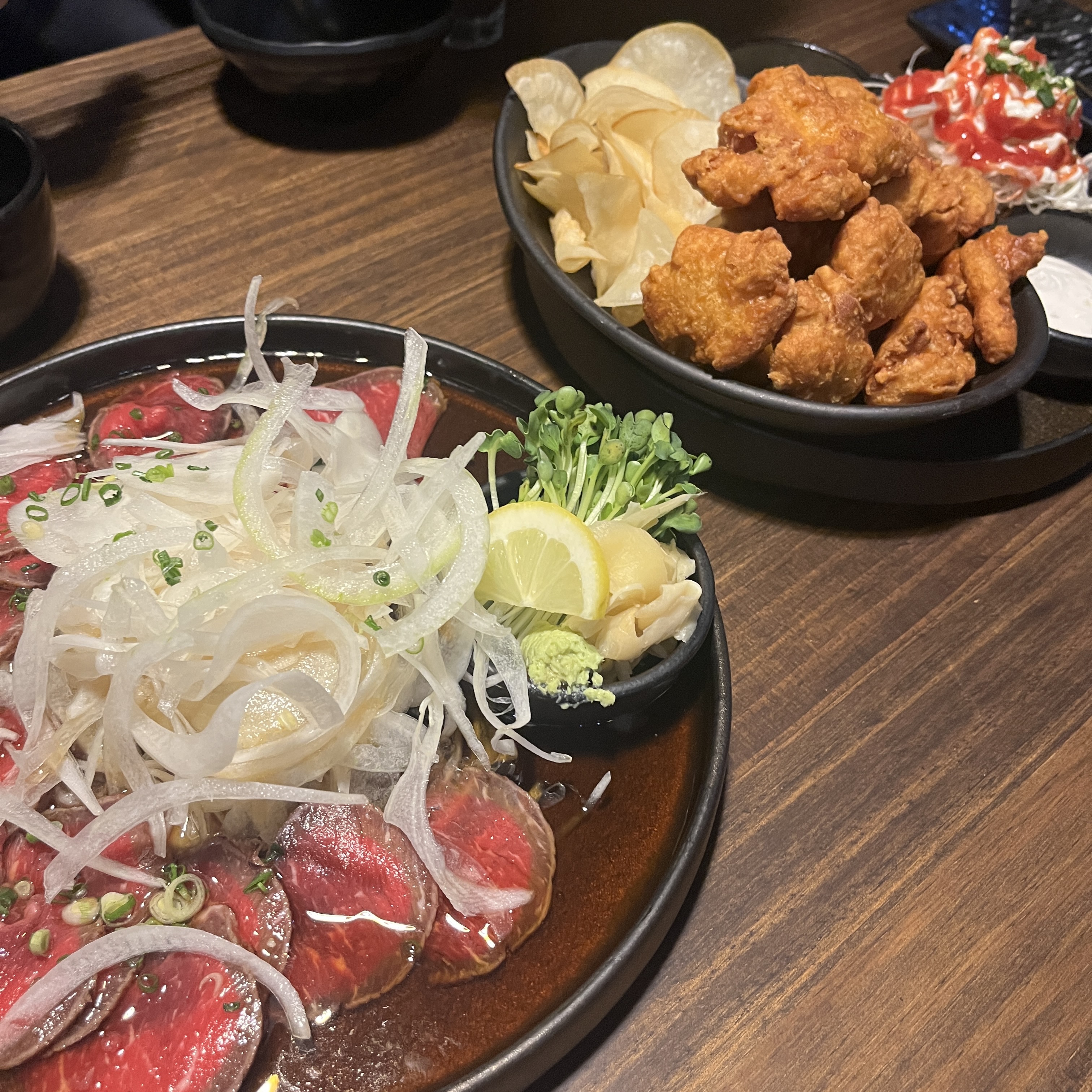 안주류에선, 한우타다끼 폰즈, 시샤모구이, 치킨가라아게 그리고 카사바칩 시켰습니다.