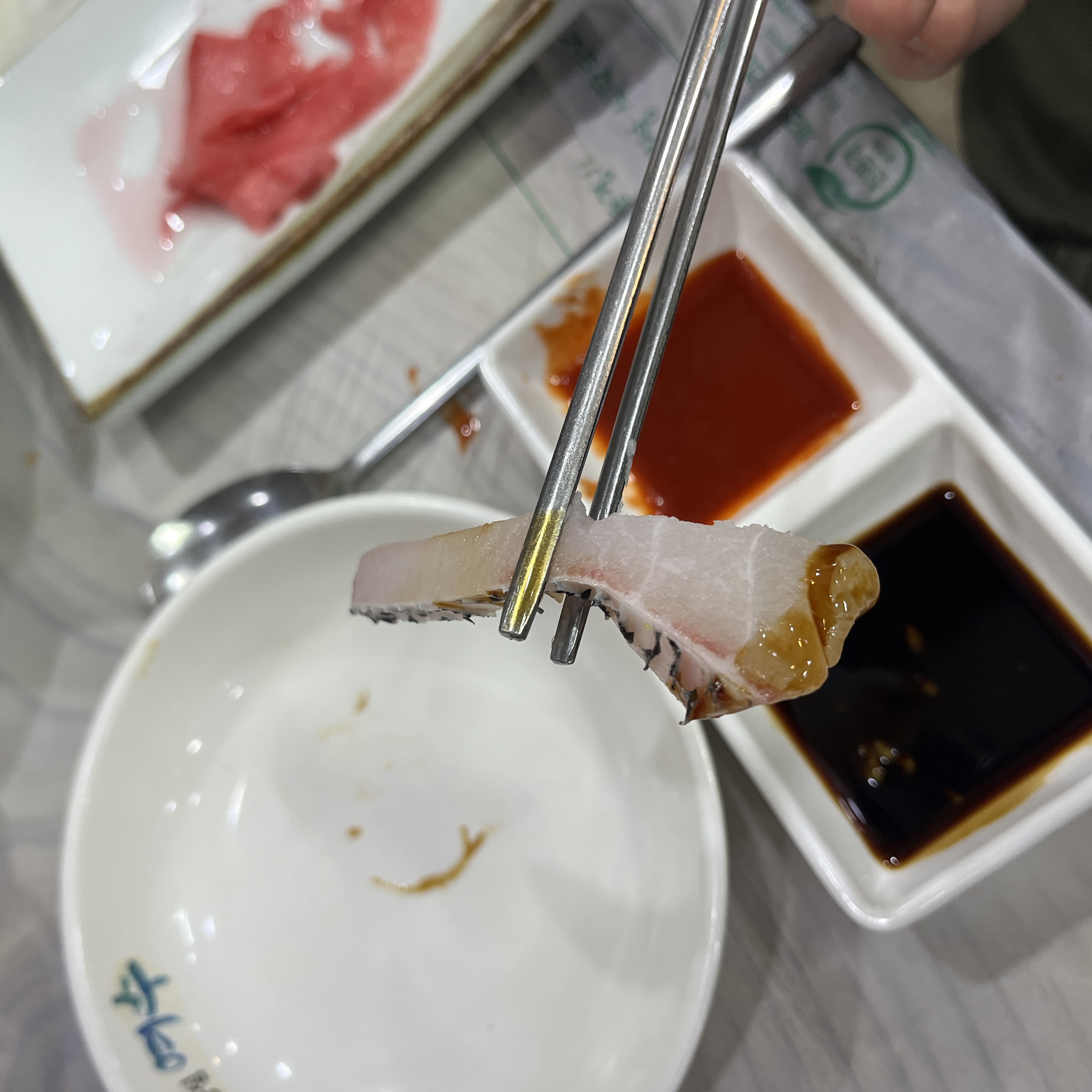 삼치회 식감은 엄청 쫀득하진 않고요, 살짝 서걱서걱 씹히는 느낌이더라구용.