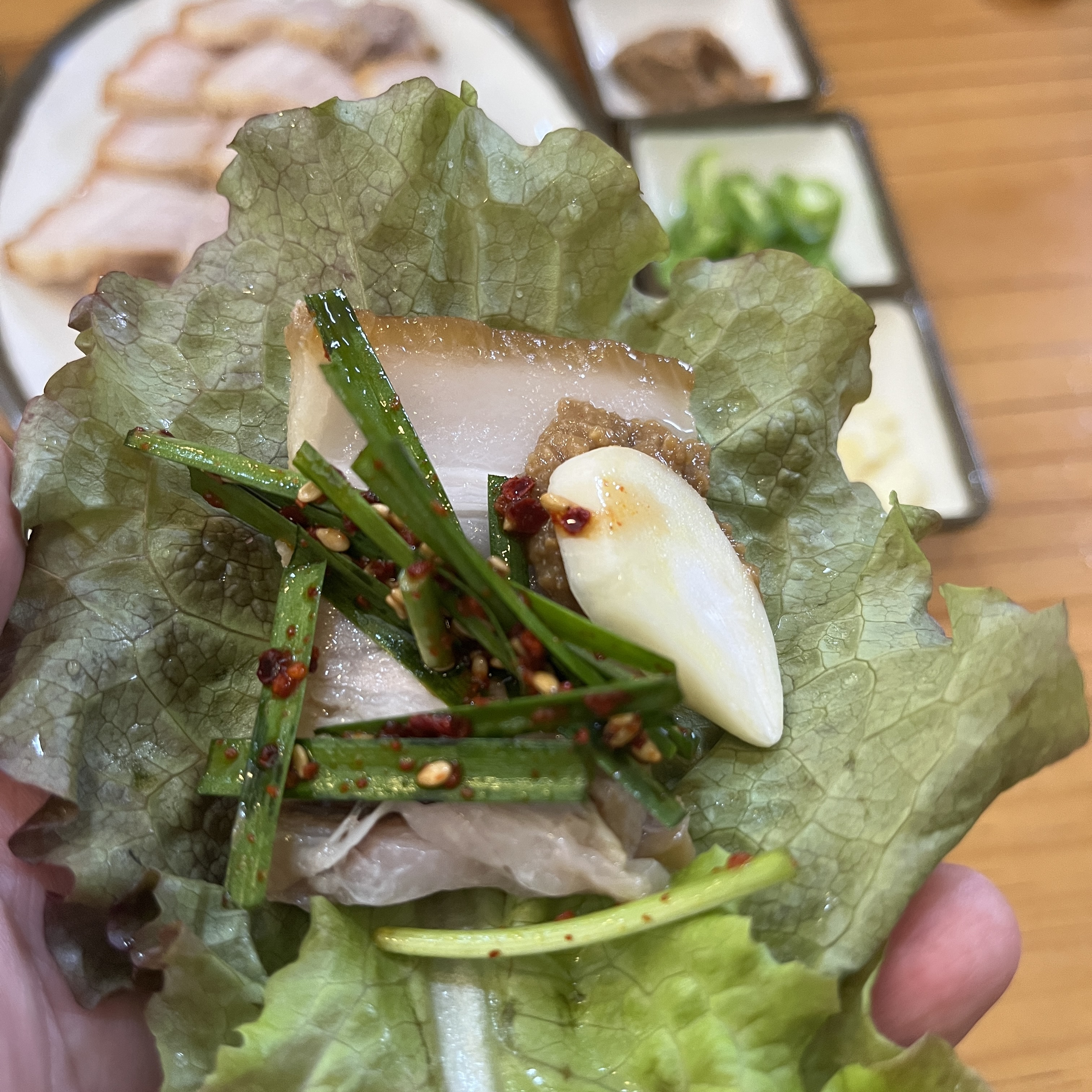 액젓맛 살짝 나는 감칠맛도는 정구지랑 수육의 조화가.. 끝내줘요..