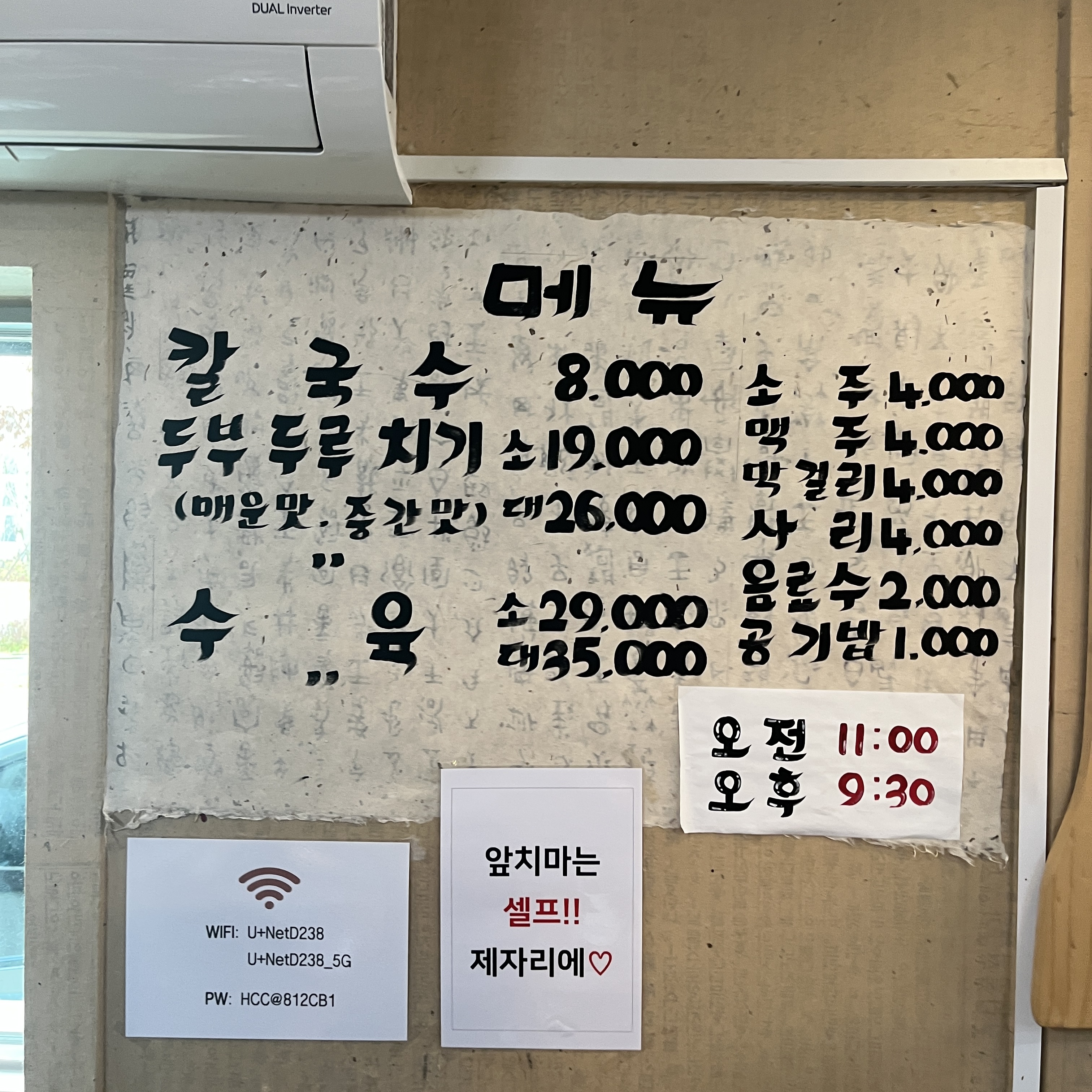 칼국수가 메인이긴 한데, 두부두루치기도 꼭 시켜드세요. 바지락이 무쟈게 많습니다.