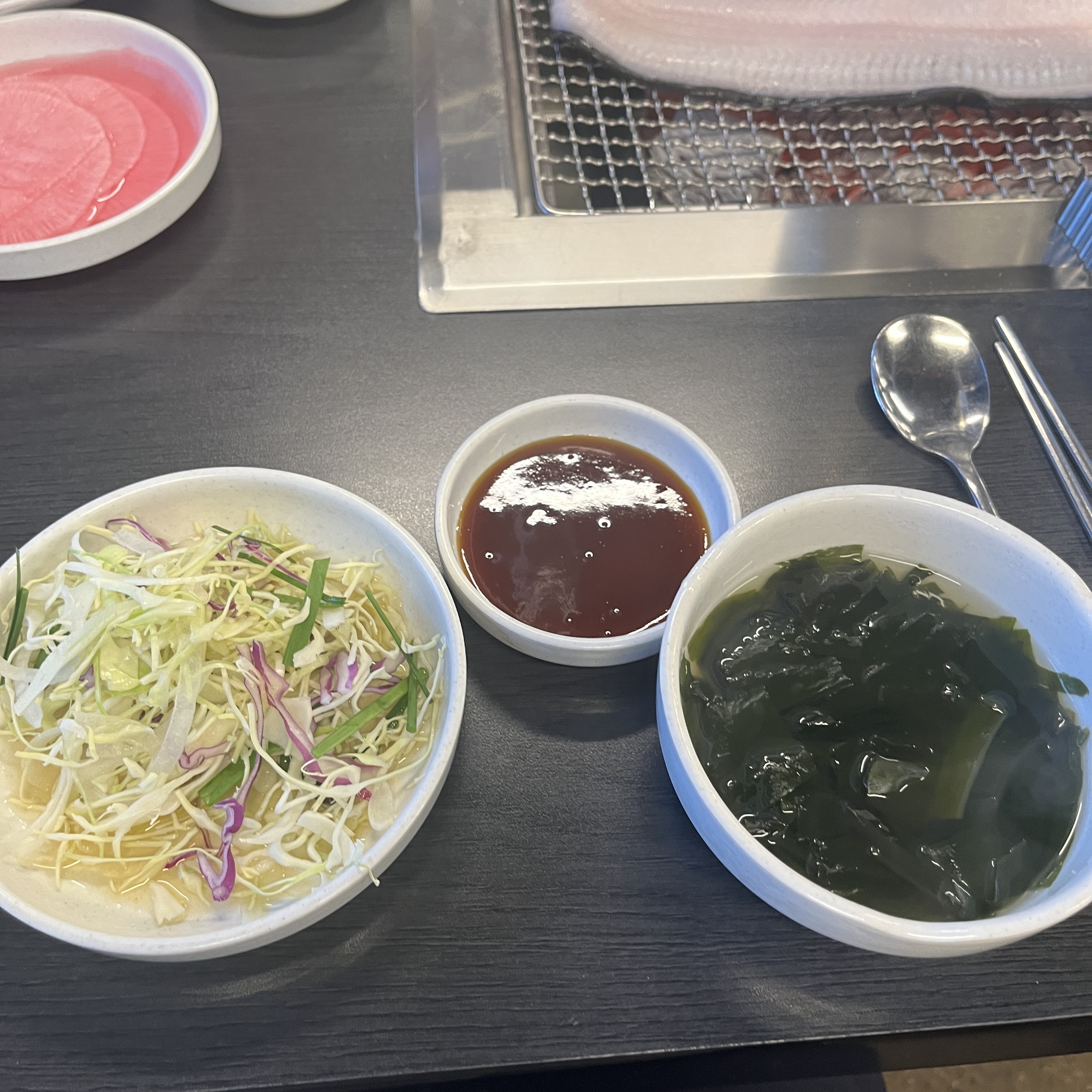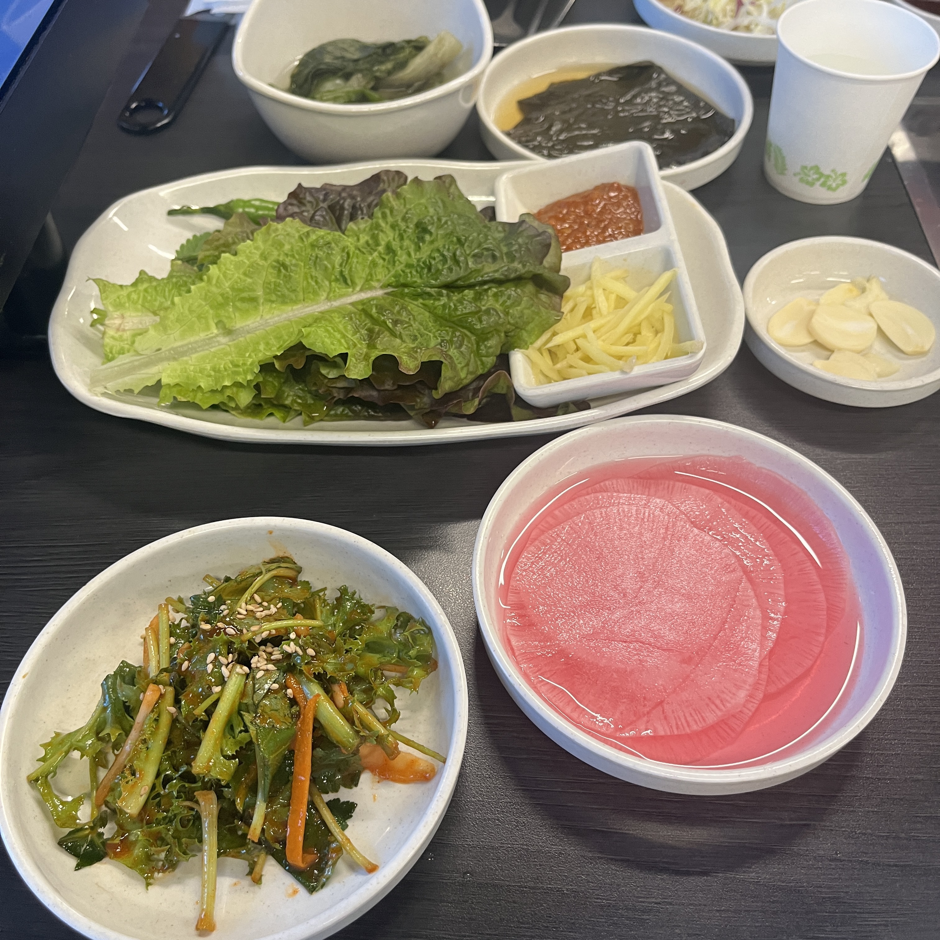 기본으로 맑은 미역국이 제공되고용, 쌈채소 등이 제공됩니다.