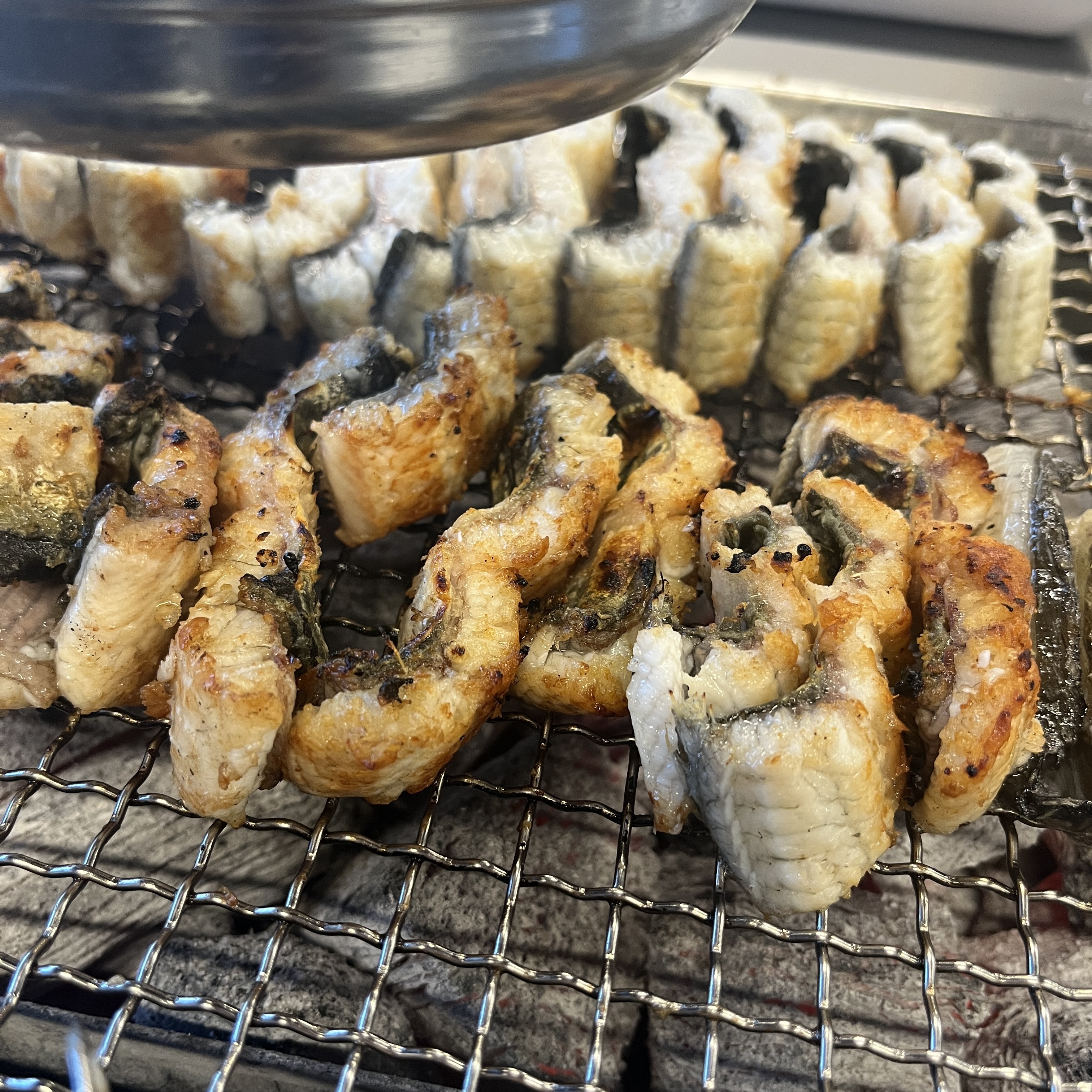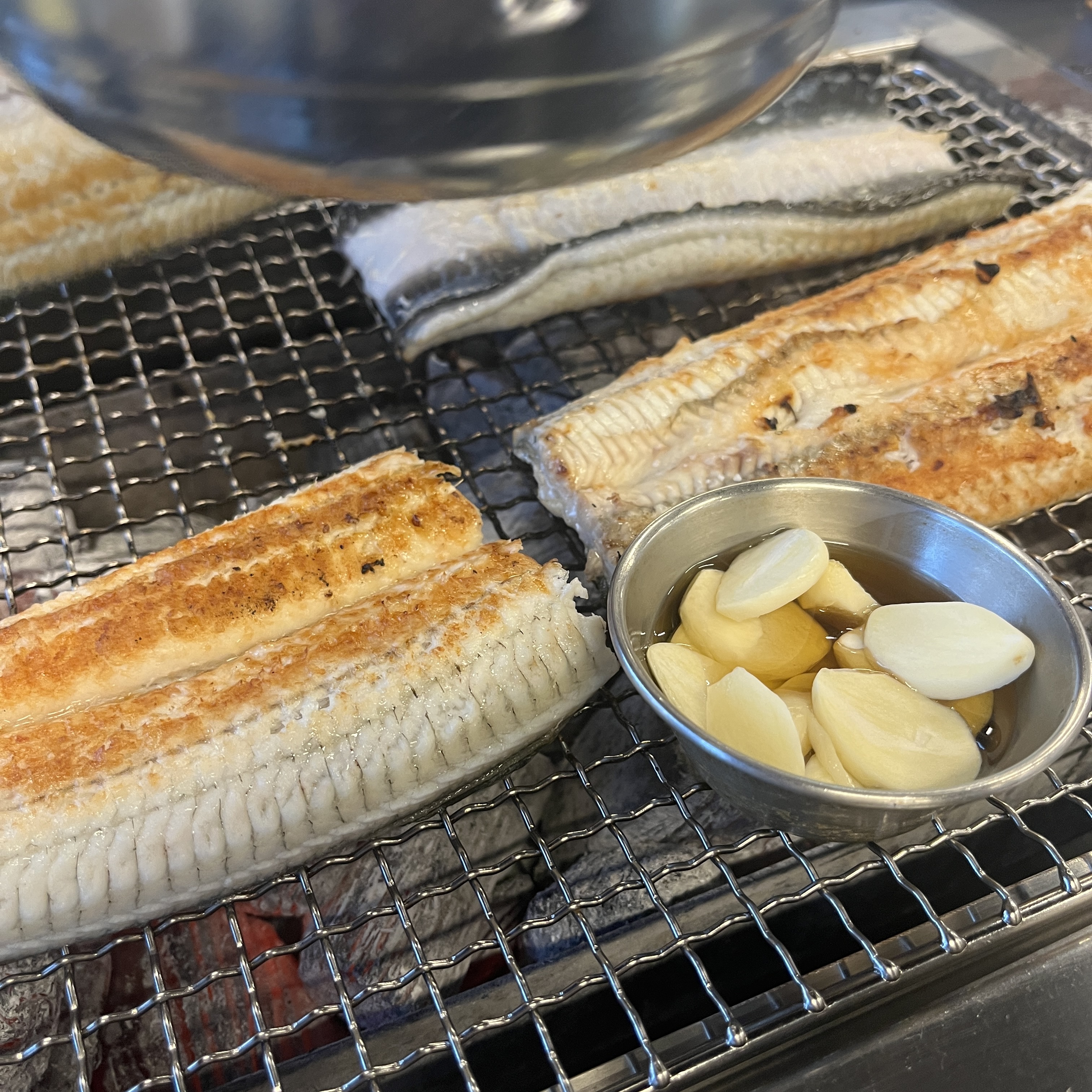 화력좋은 숯에, 바삭바삭하게 익힌 두꺼운 장어가.