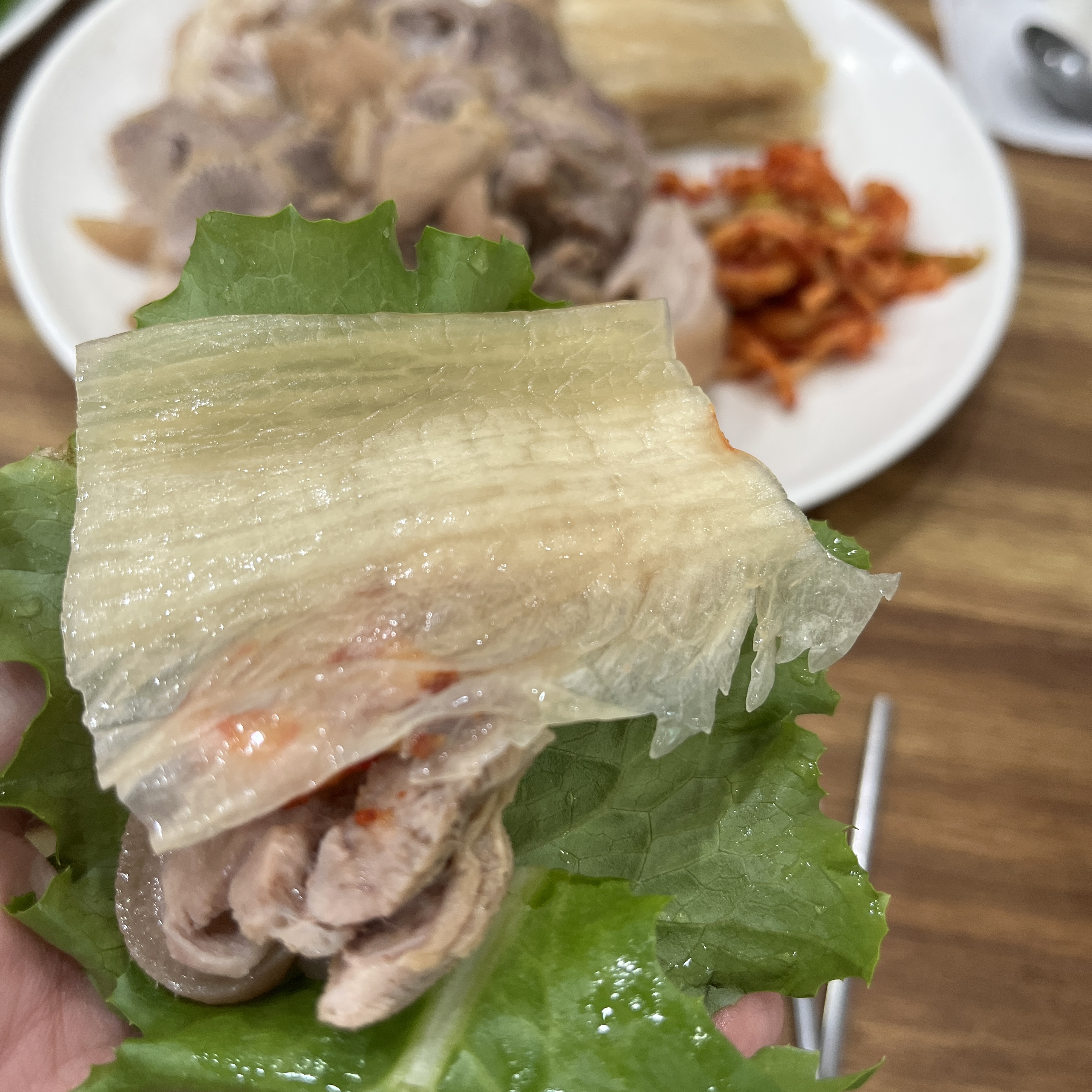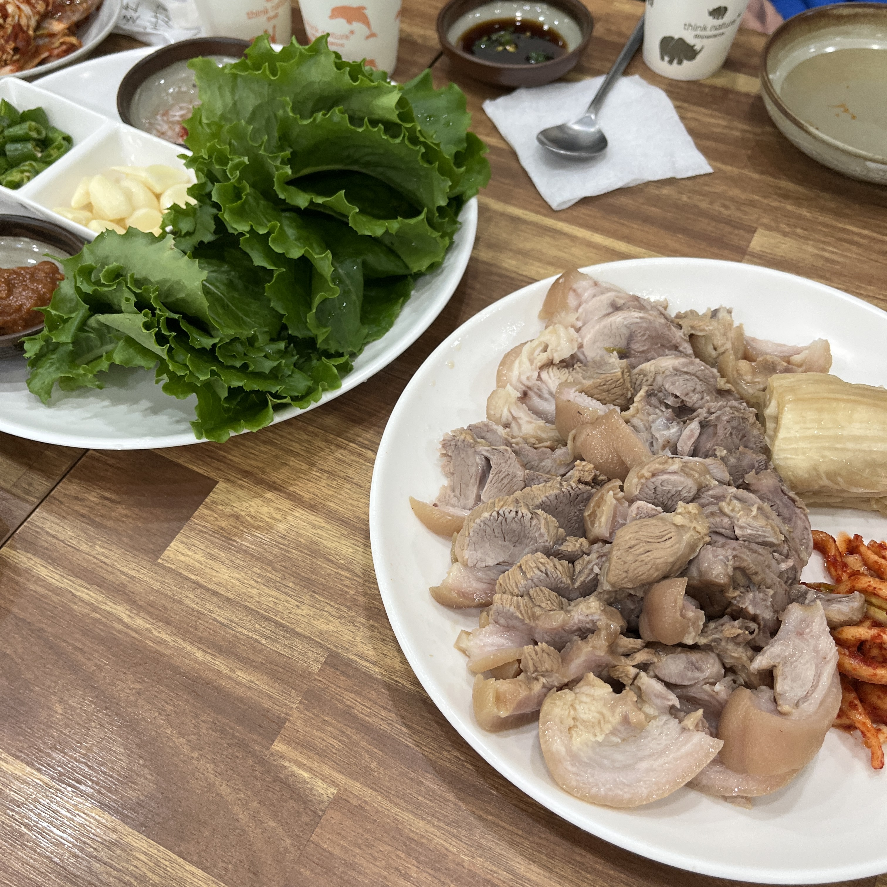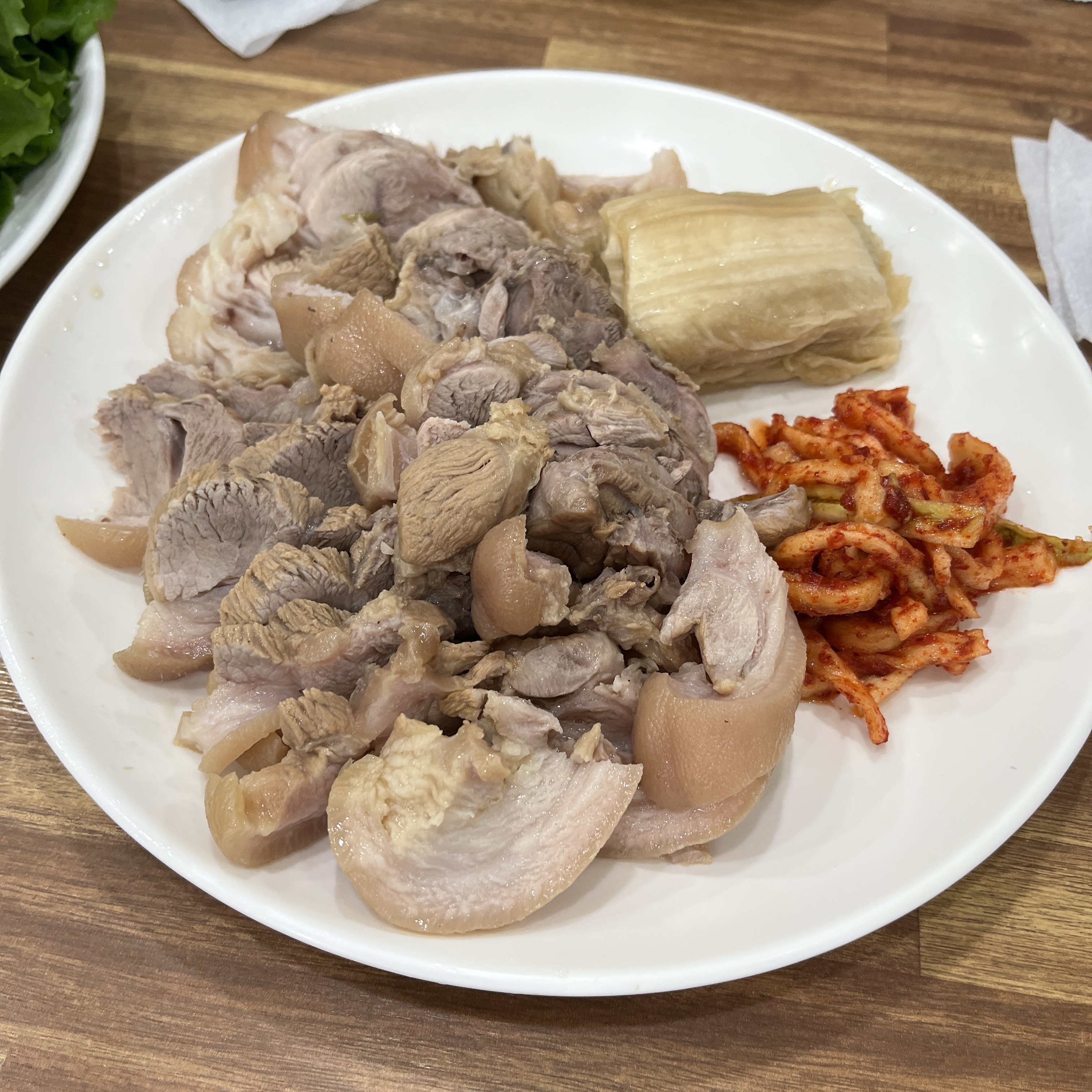 왠지 느낌상 된장정도로 잡내를 잡고, 큰 양념은 없이 삶아낸 수육같았는데, 고기가 부들쫀득한게 특징이었고, 껍데기가 붙은 비계부분은 쫀득한 맛을 내는게 특징이었습니다.