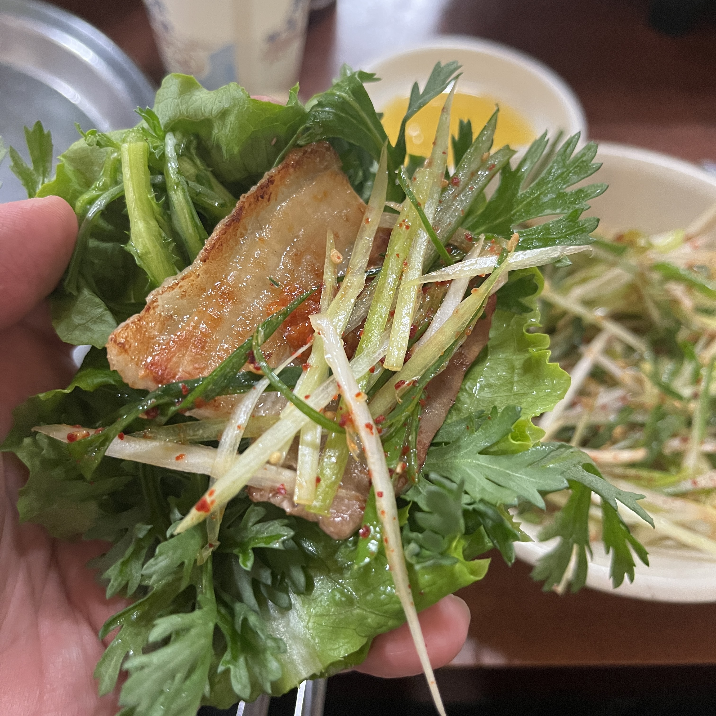 쑥갓, 상추, 파절이 살짝 얹어서 고기 한쌈 먹으면 크으..