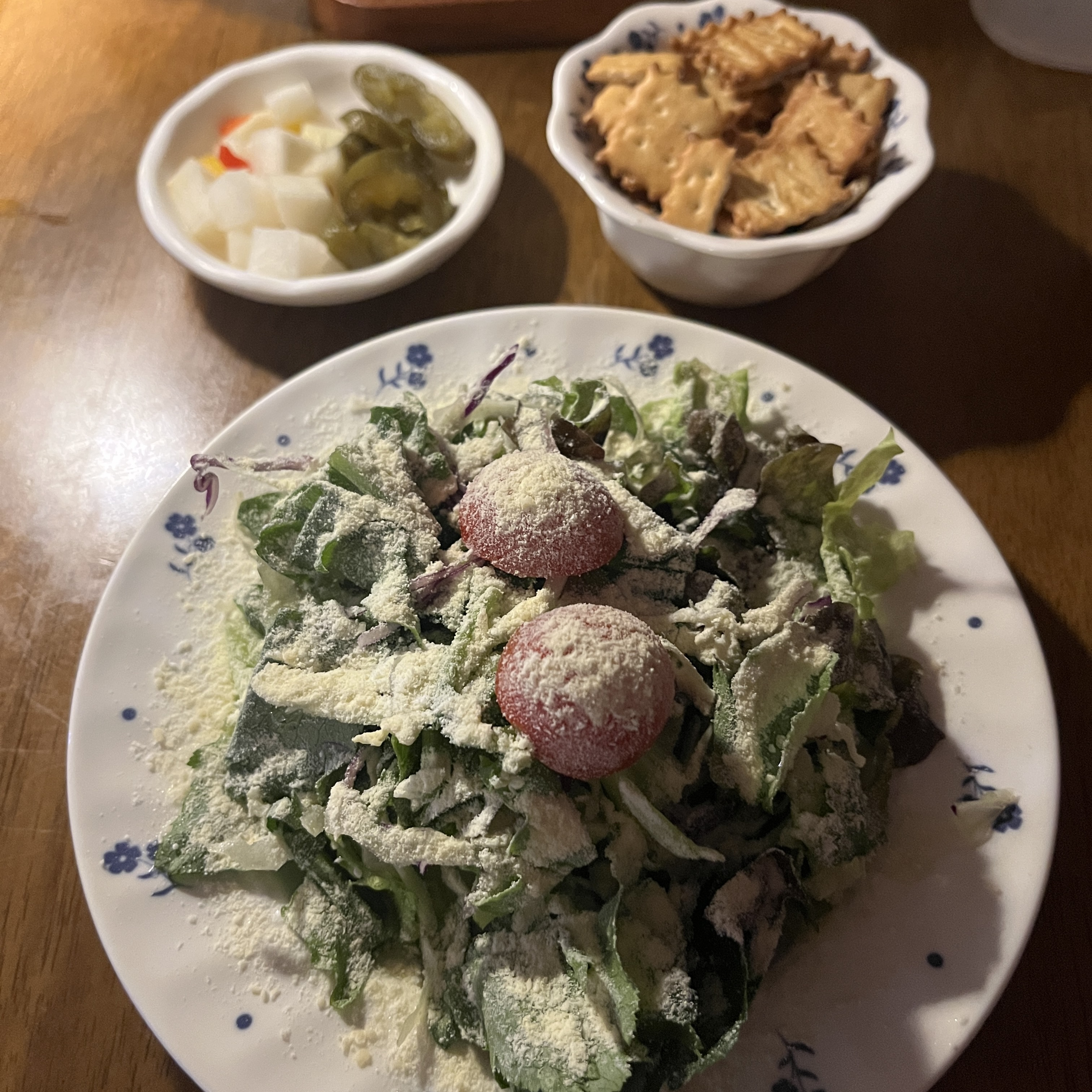 치즈가루가 듬뿍 뿌려져 있었는데, 덕분에 고소하고 상큼하게 메인안주 먹기 전에 배를 준비했습니다.