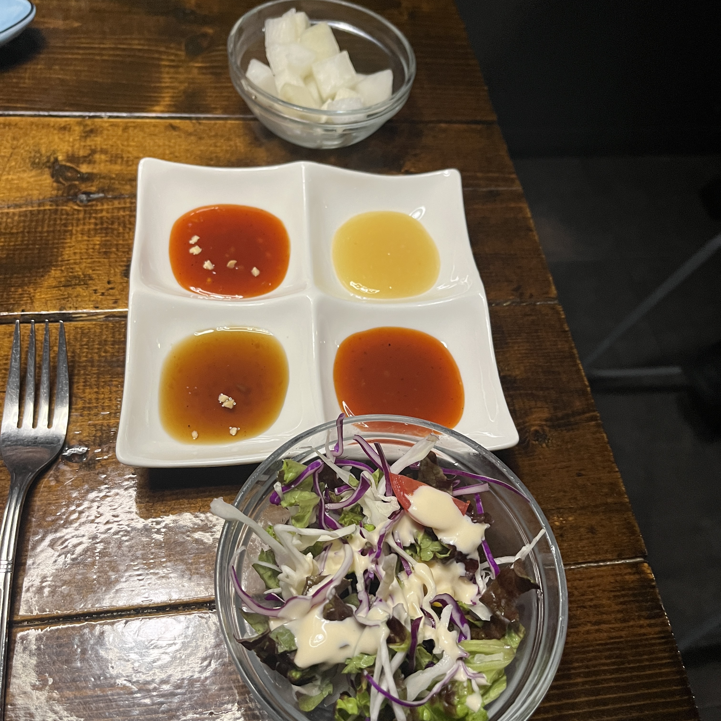 자, 기본으로 나오는 소스4종과, 치킨무, 그리고 샐러드입니다.