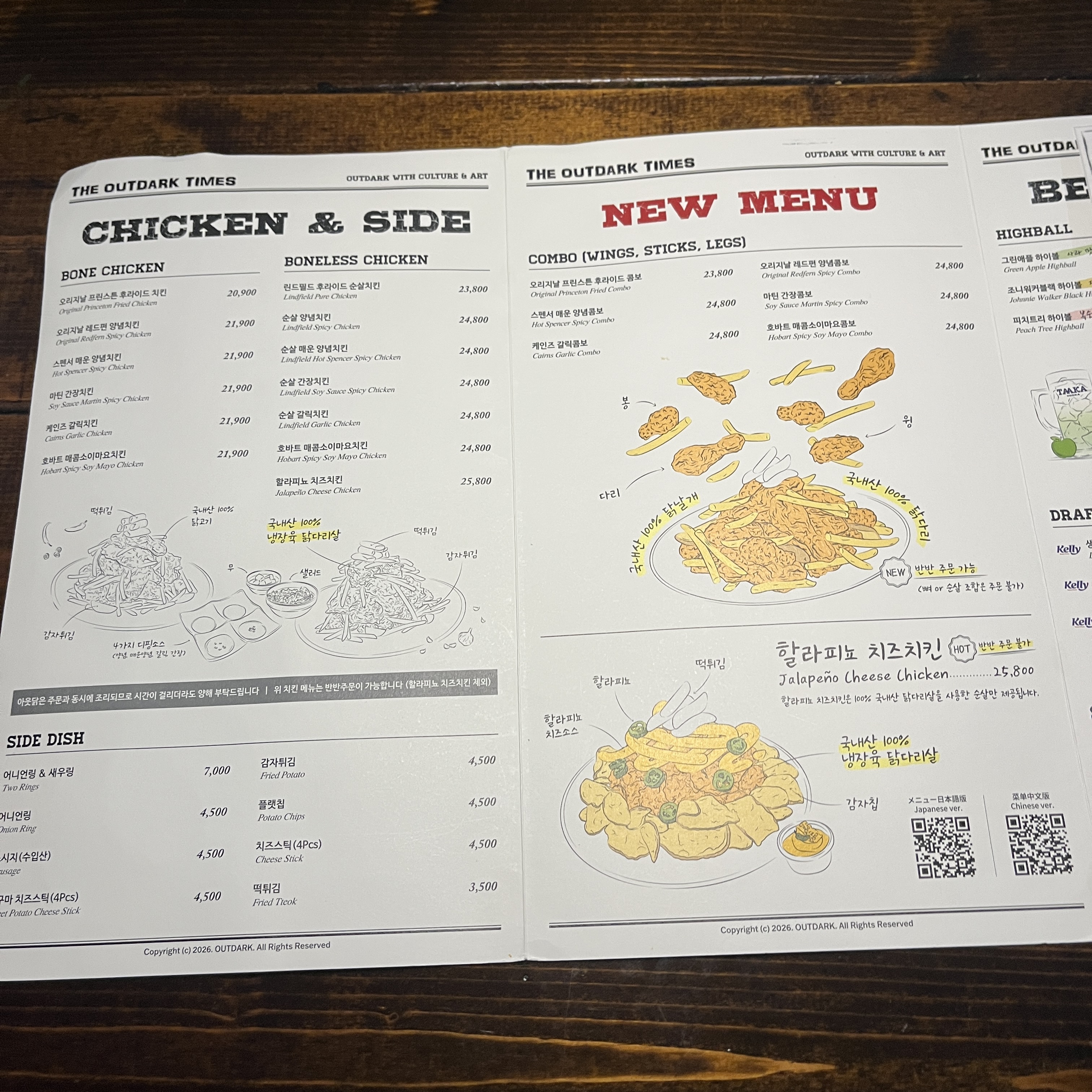 아웃닭은 저 소스가 킥이더라구요. 좀 칠리, 갈릭, 양념치킨, 간장.. 이었던 것 같은데, 소스마다 찍어먹는 맛이 있었고, 소슴사도 좋았습니다.
