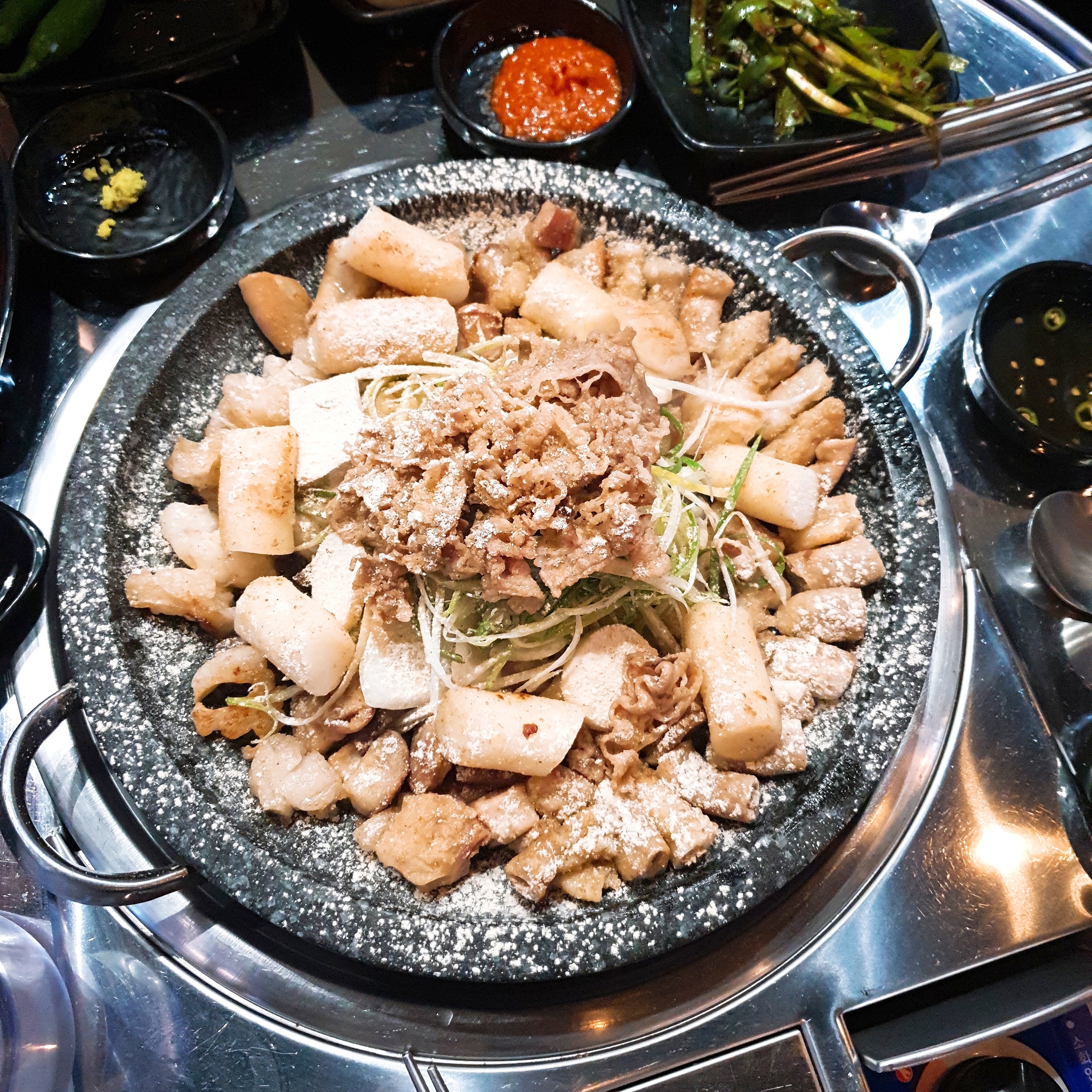 먼저 찌개와 육회가 나온다니.. 그거부터 기대가 됐고, 떡도 나오나?! 거기에 부추.. 본 메뉴가 나오는게 기다려졌습니다.