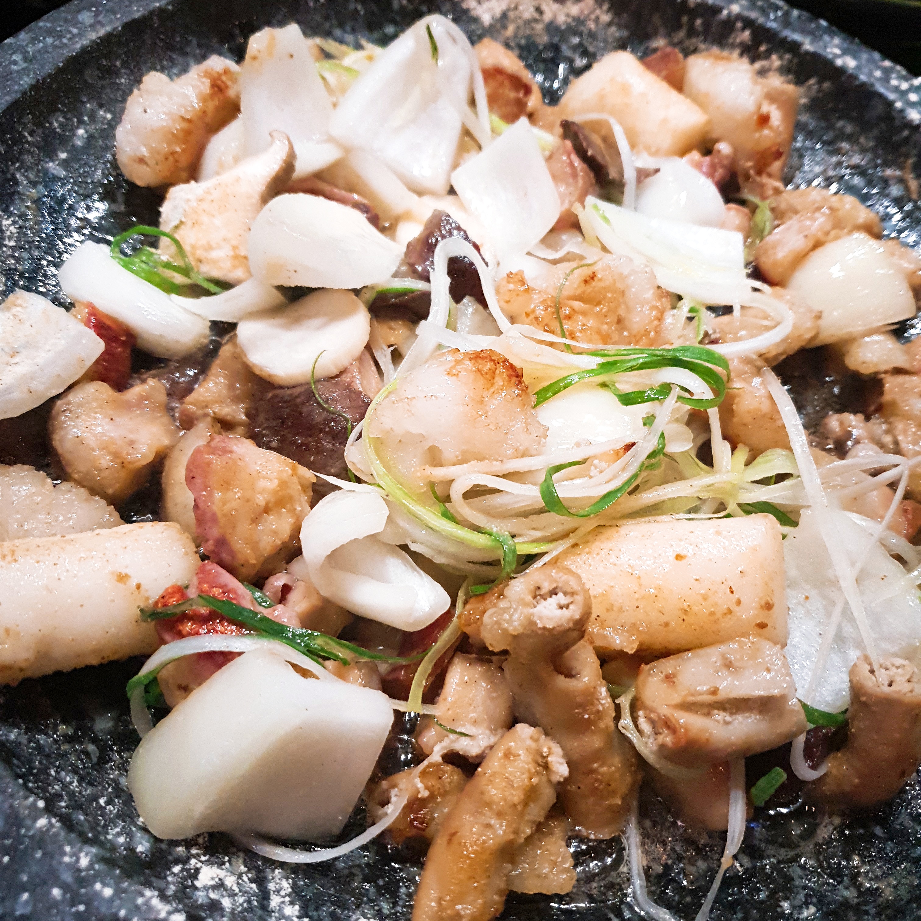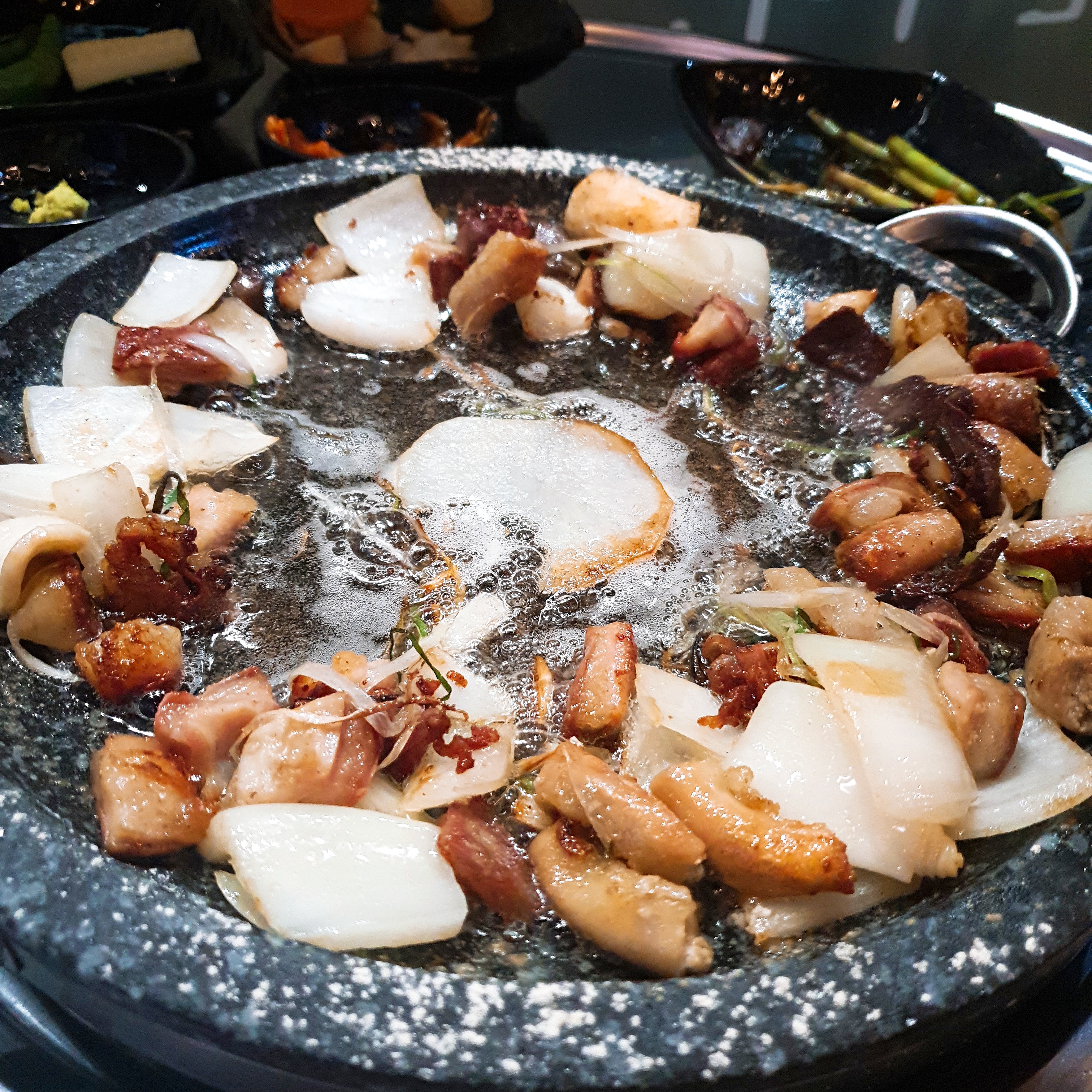 그리고 저 자글자글거리는 기름에는 각종 육즙이 흘러나왔겠죠? 저기에 익혀먹는 양파 등 야채들의 맛이 정말 맛있었습니다.
