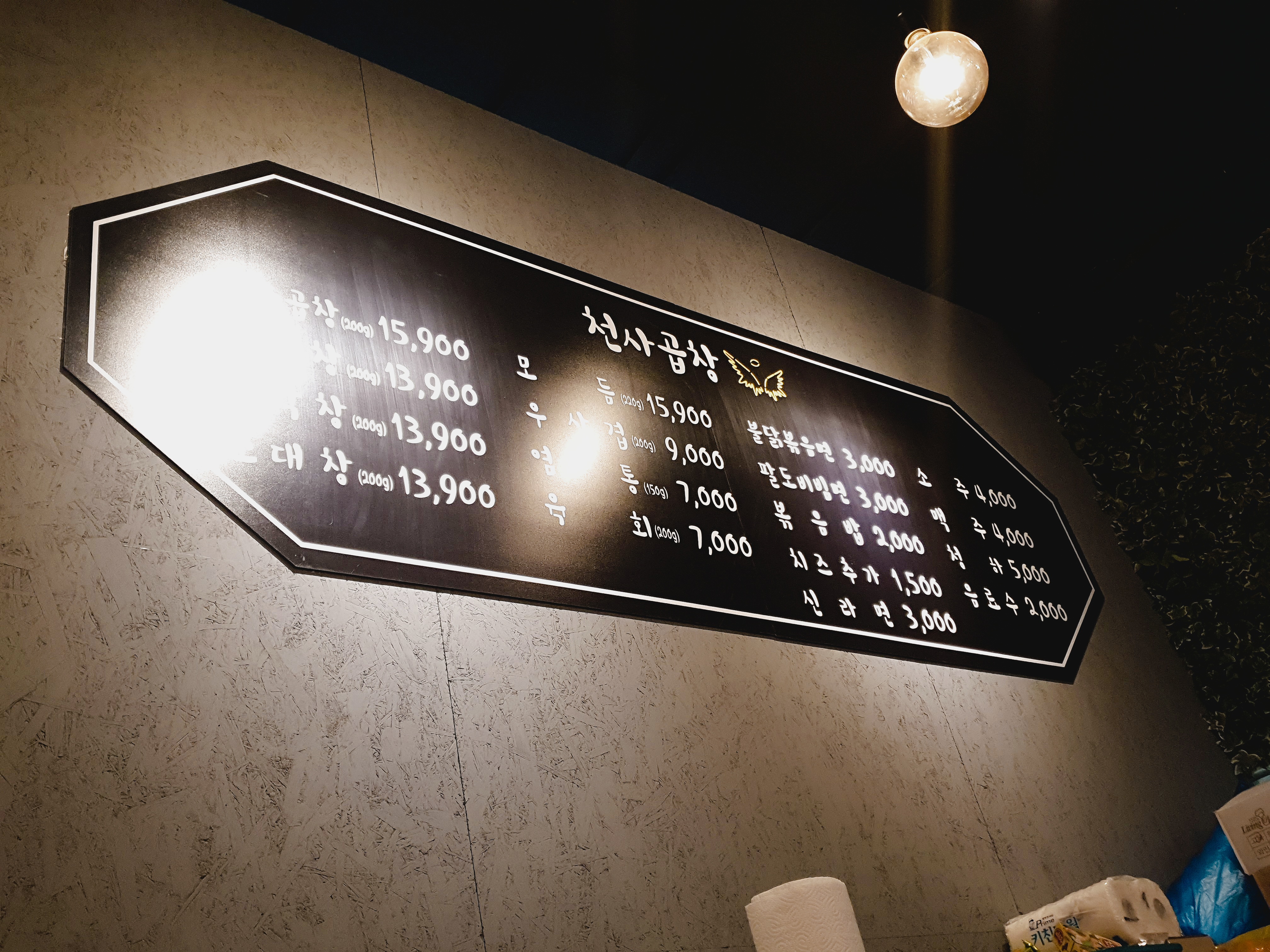 천사곱창은 매드블럭 1층에 위치해 있고, 위는 메뉸데 왼쪽이 잘 안보이는데 차례대로 매운소곱창, 한우곱창, 소곱창, 소막창, 소대창 입니다. (현재는 가격이 좀 오른 것 같습니다)