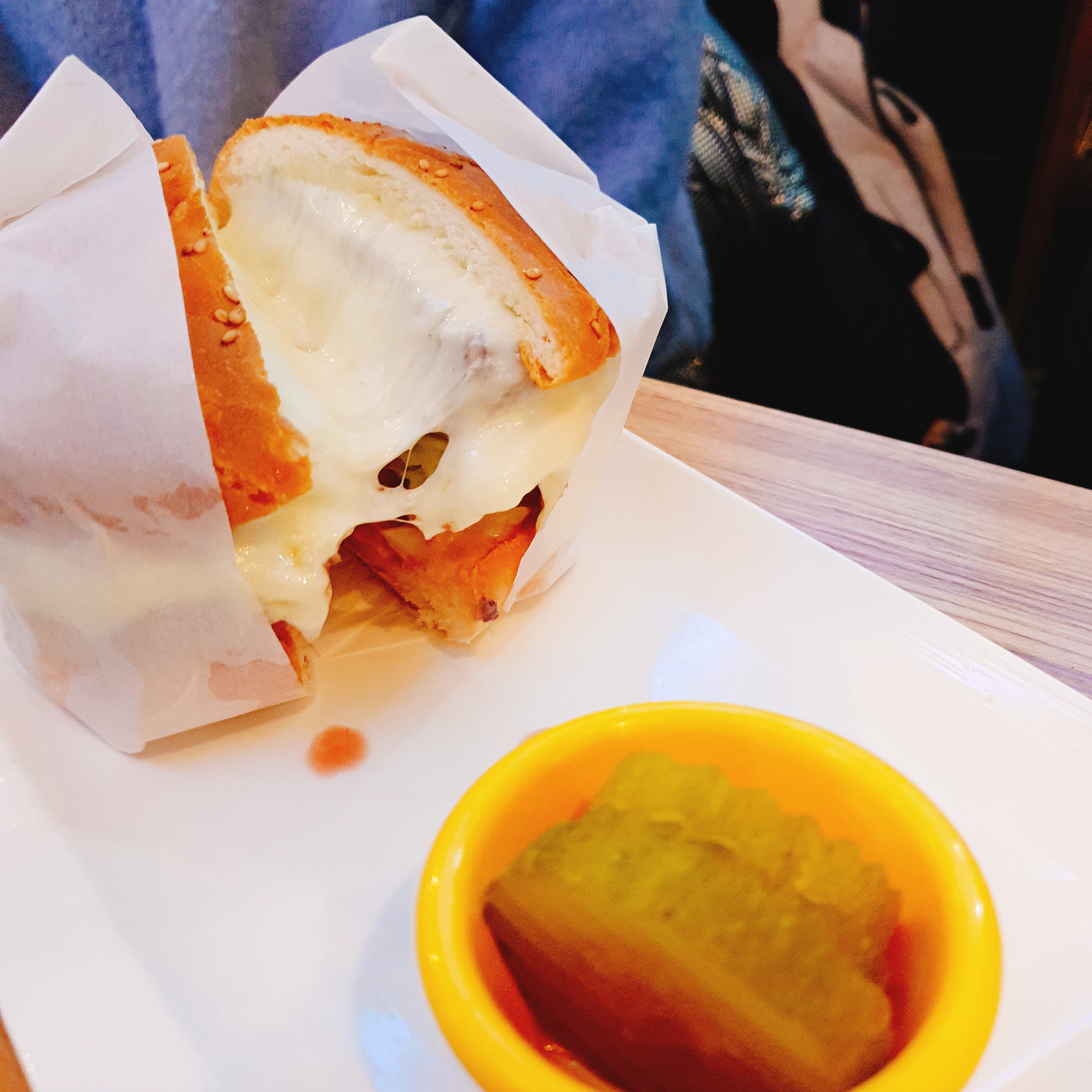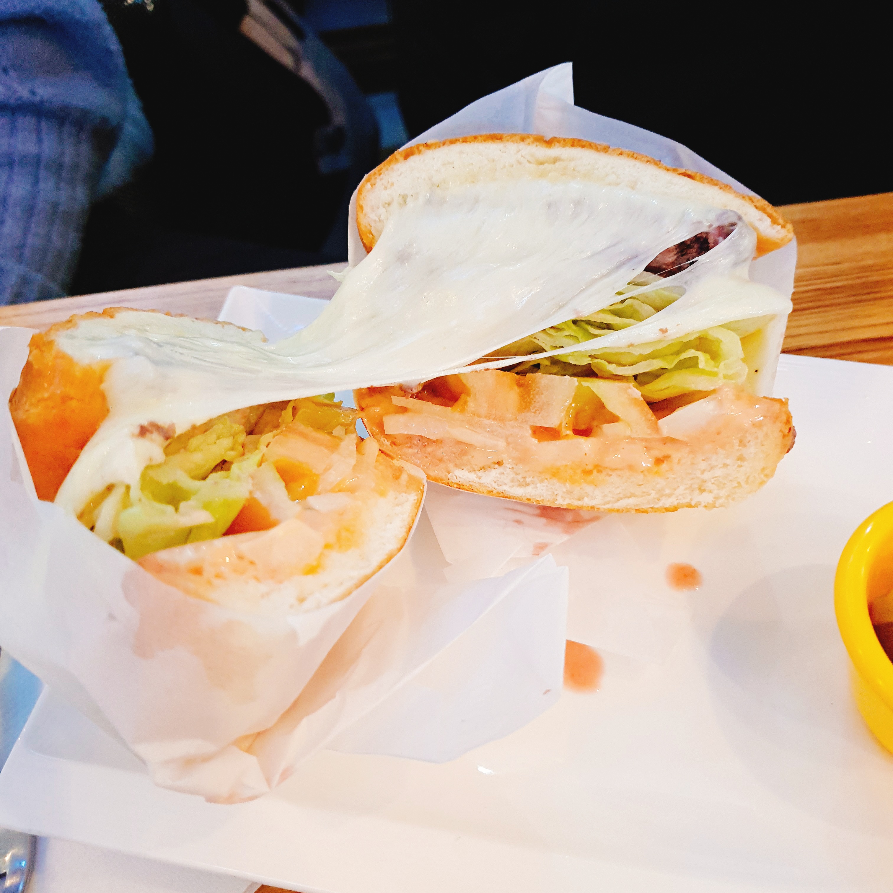 치즈가 저렇게 흘러나올줄은 상상도 못했습니다. 거의 피자먹을 때 치즈 늘어나는 것과 같이 치즈가 들어있어 쭈욱 늘어지는 시각적으로도 맛있는 버거였고, 맛도 치즈의 고소함이 살아있는 버거였습니다.