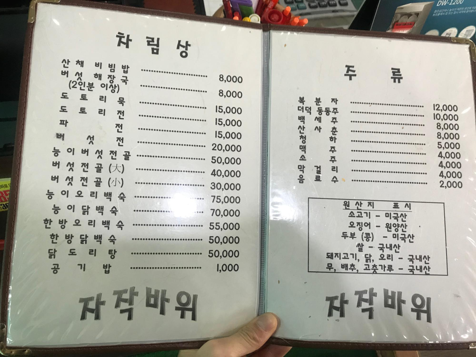 자작바위 메뉴입니다. 저희는 닭도리탕을 시켜먹었지만, 그 외에 산채비빔밥, 도토리묵, 파전, 오리백숙, 닭백숙 등 이런 곳에서 팔 것 같은 메뉴는 전부 있습니다 ㅎㅎ