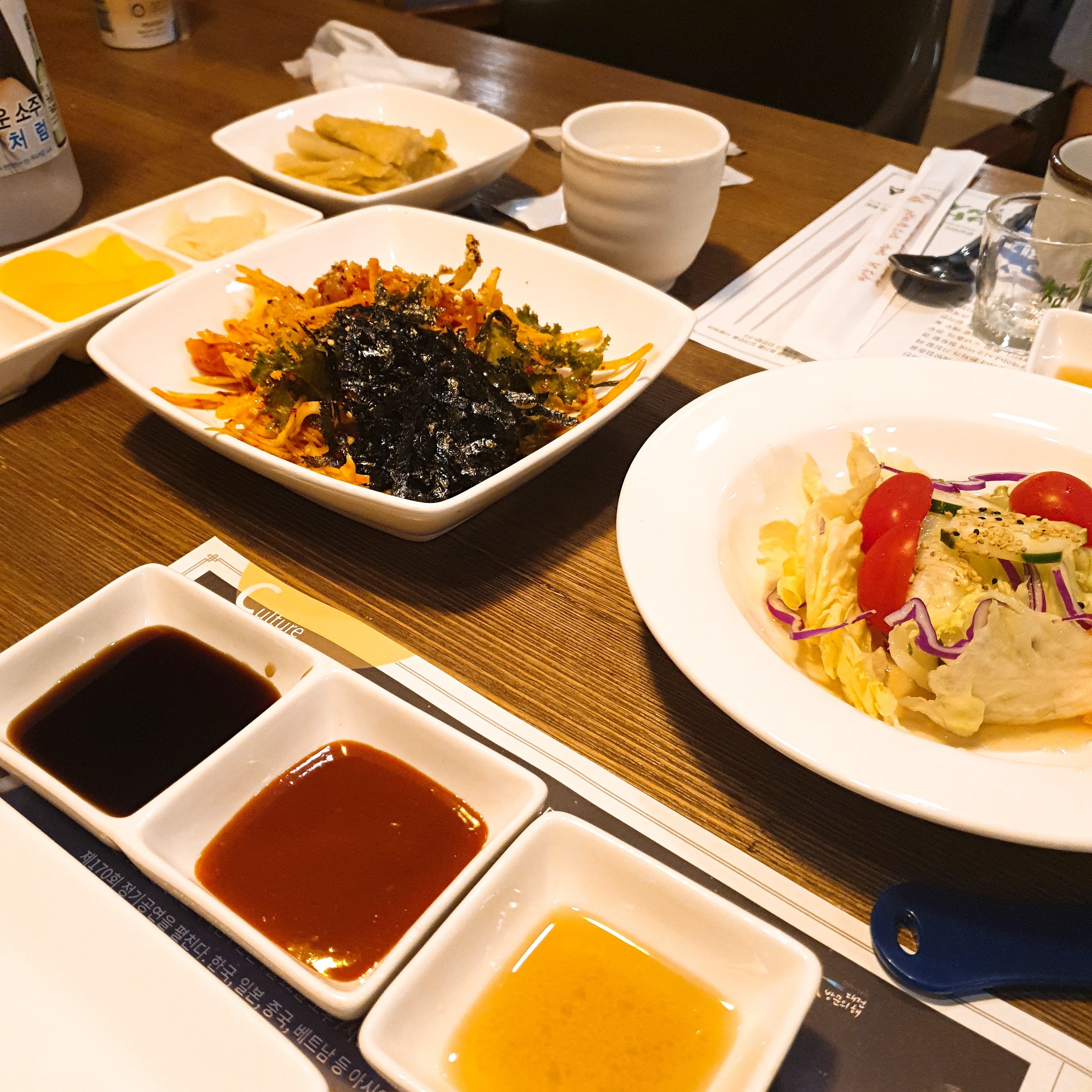 다음으론 이렇게 샐러드와 무침을 주십니다. 유일하게 입맛에 안맞았던건 저 오른쪽에 있는 야채샐러드입니다.