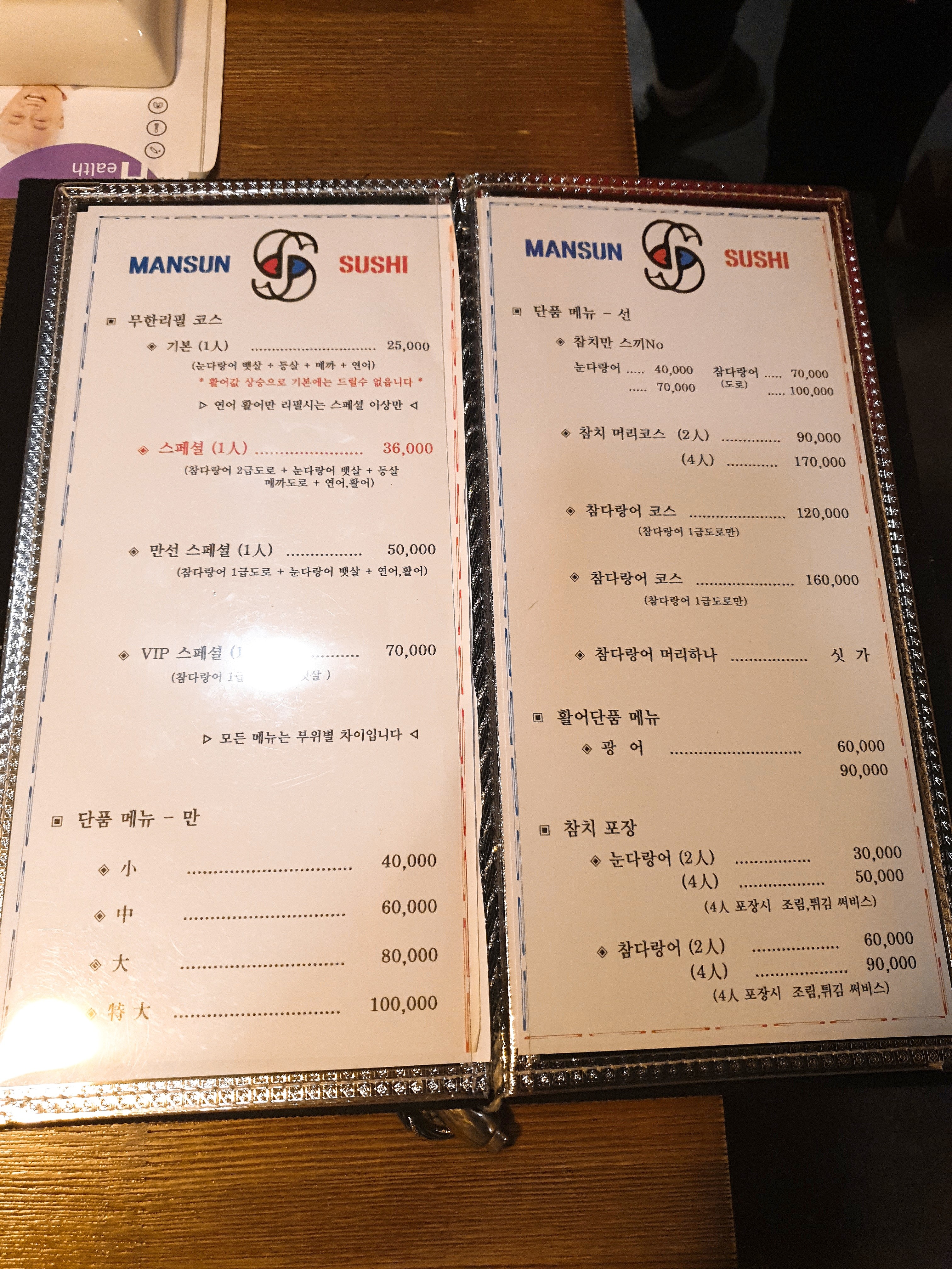 그리고 한 부위만 주시는게 아니라 다양한 부위를 주셔서 좋았고, 그리고 더 좋았던건 '내가 원하는 부위를 리필할 수 있다'인 것입니다. 어떤 무한리필은 고르지 못하고 무조건 갖다주는데로 먹어서 먹기 싫은 부위까지 먹는 부담감이 있는데 만선스시는 그렇지 않아서 좋았습니다.