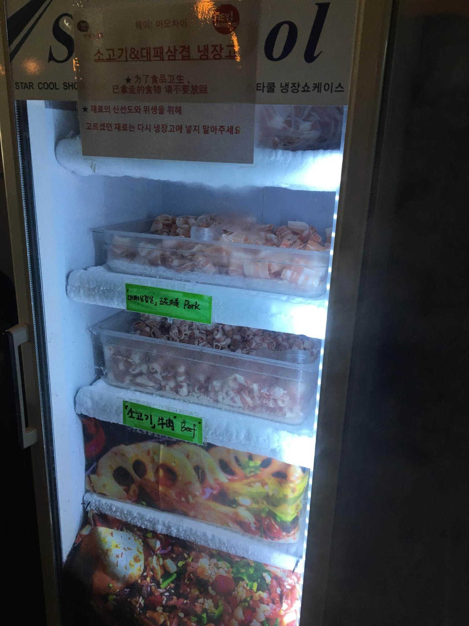그리고 그 '간을 한 양고기'가 냉장고쪽에 있는데, 이거도 향이 좀 강합니다. 요것도 처음 가보시는분들은 빼고 조리하시는게 좋을 것 같아요~