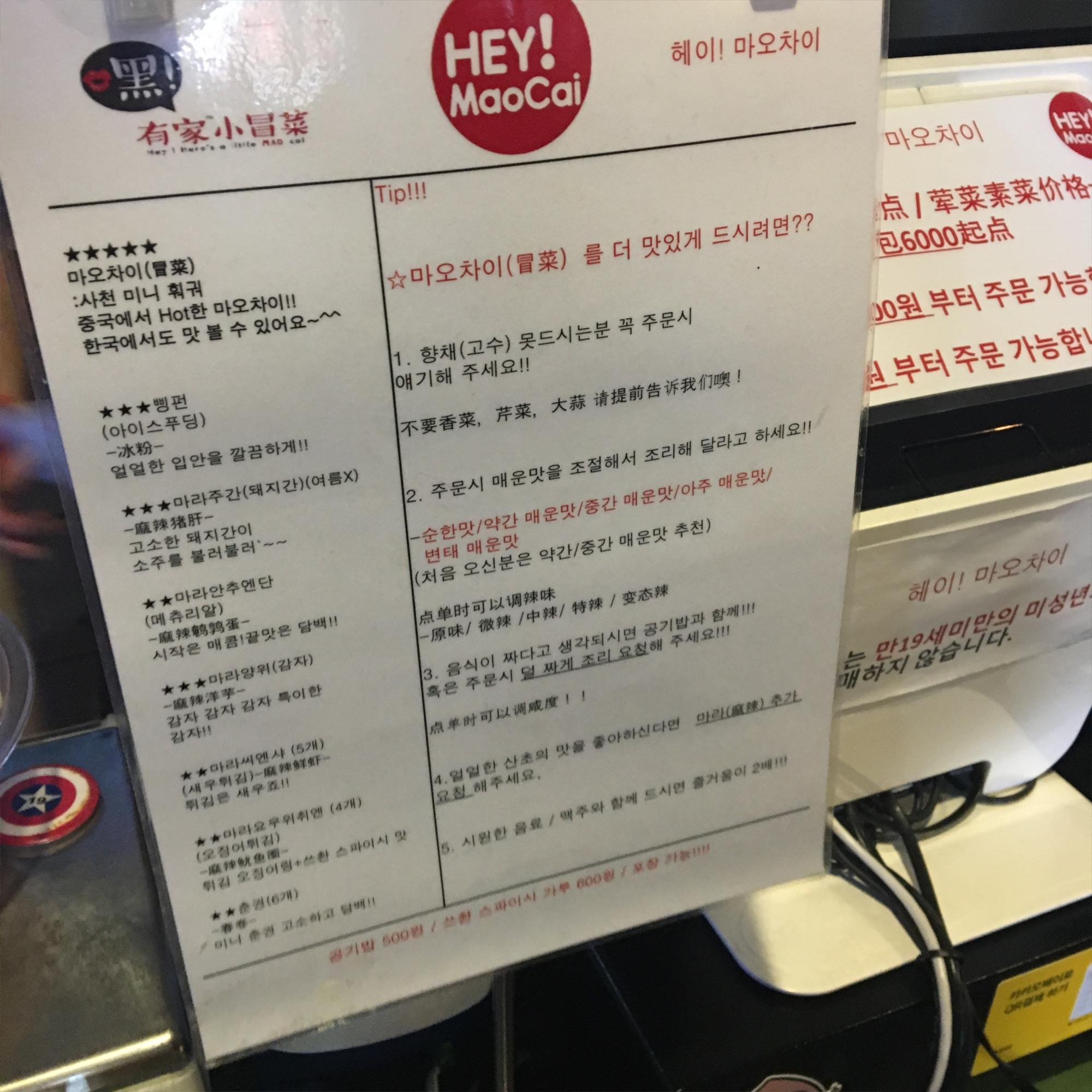 대한민국 1호점. 본토의 마라탕의 맛을 즐기시고 싶으신 분들은, 대전 유성 충남대 근처 궁동에 위치한 '헤이마오차이'에서 진항 향내가 진동하는 마라탕 한번 드셔보세욤~