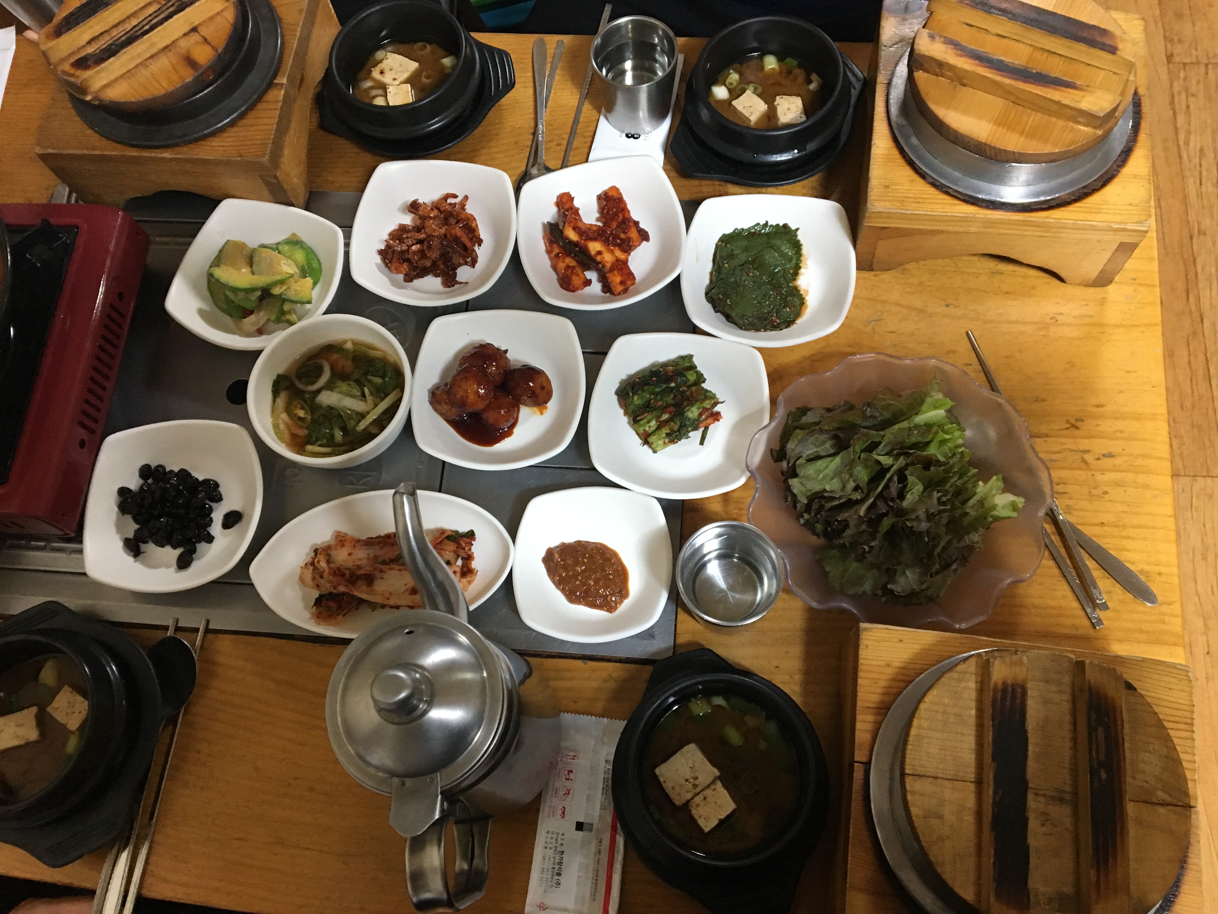 애호박볶음, 감자조림, 콩자반, 김치, 오이소박이, 깻잎절임 등과 된장찌개를 각자 한개씩 주시고 맛있게 쌈으로 먹을 수 있게 상추까지 주십니다.